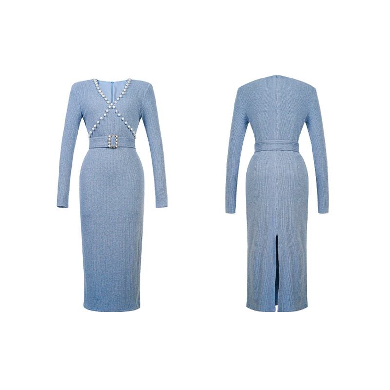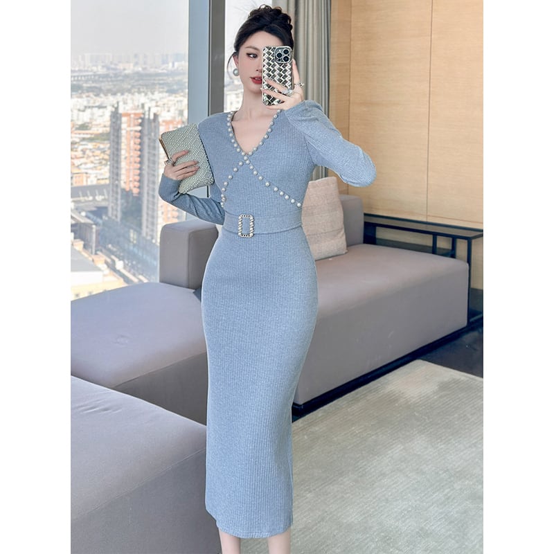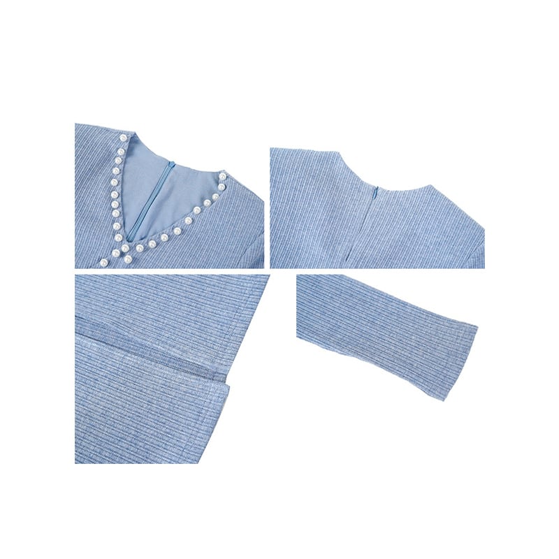 【夕暮薔薇シリーズ】ワンピース Vネック バックスリット フェミニン ブルー S M L XL