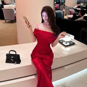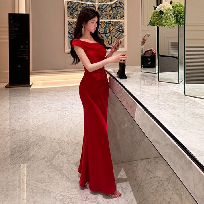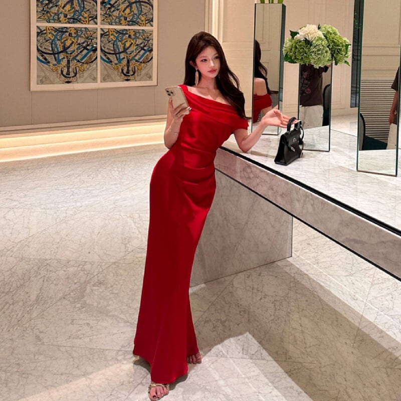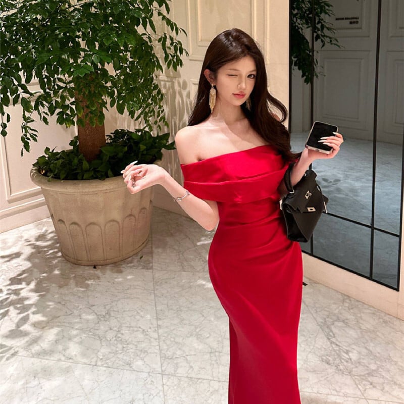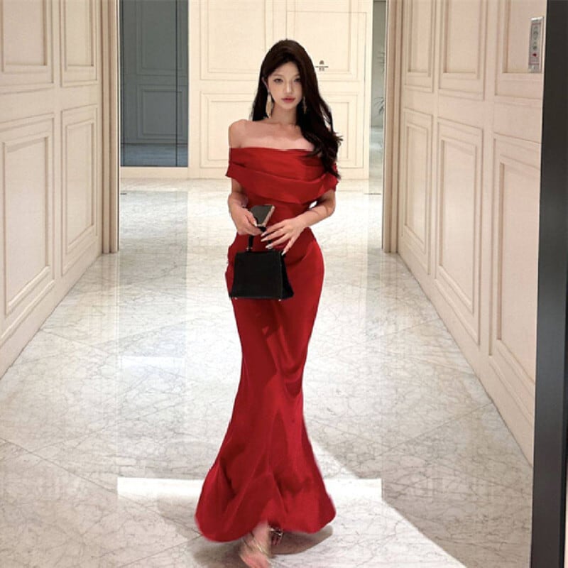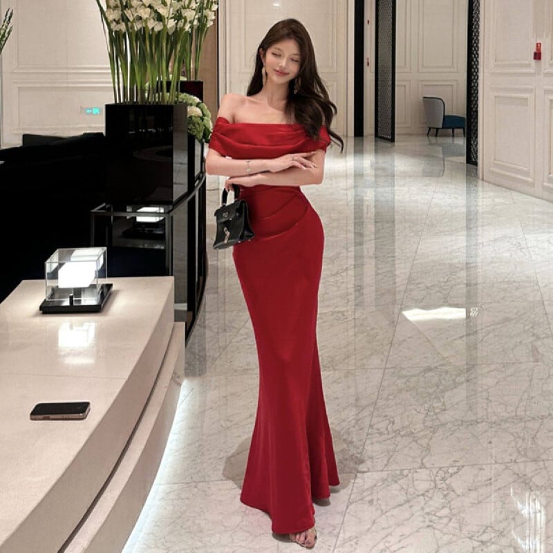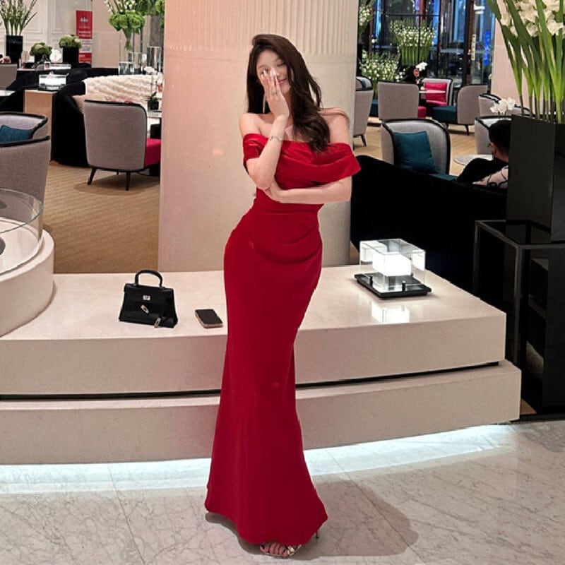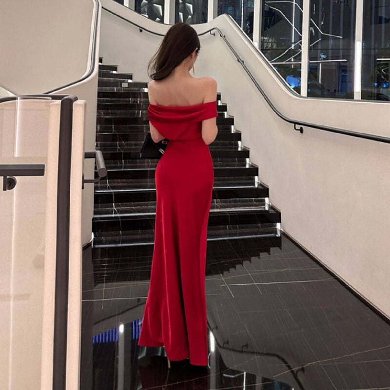 パーティードレス オフショルダー ロング丈 美人度アップ レッド S M L