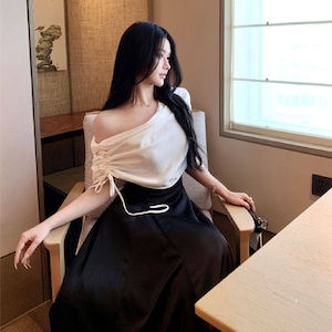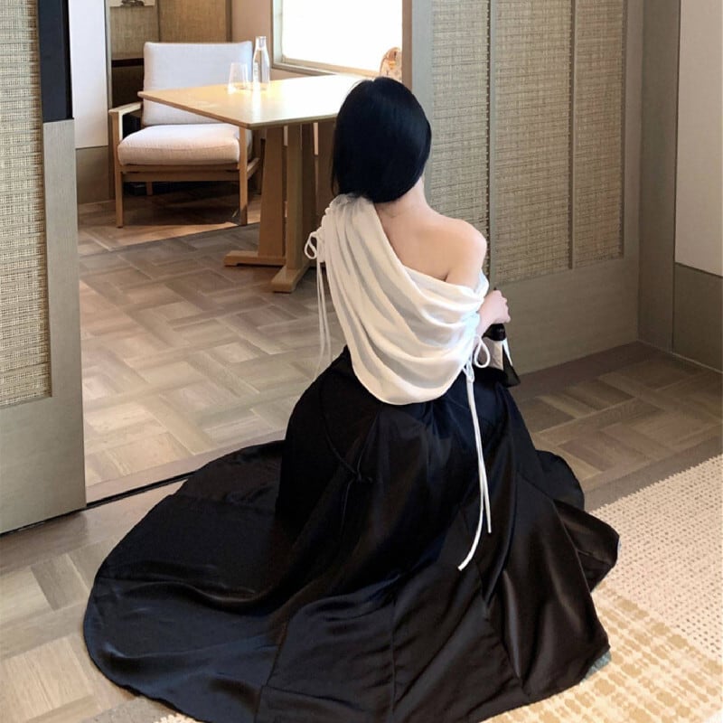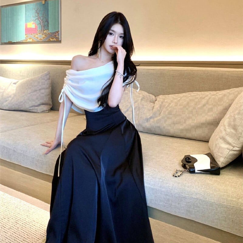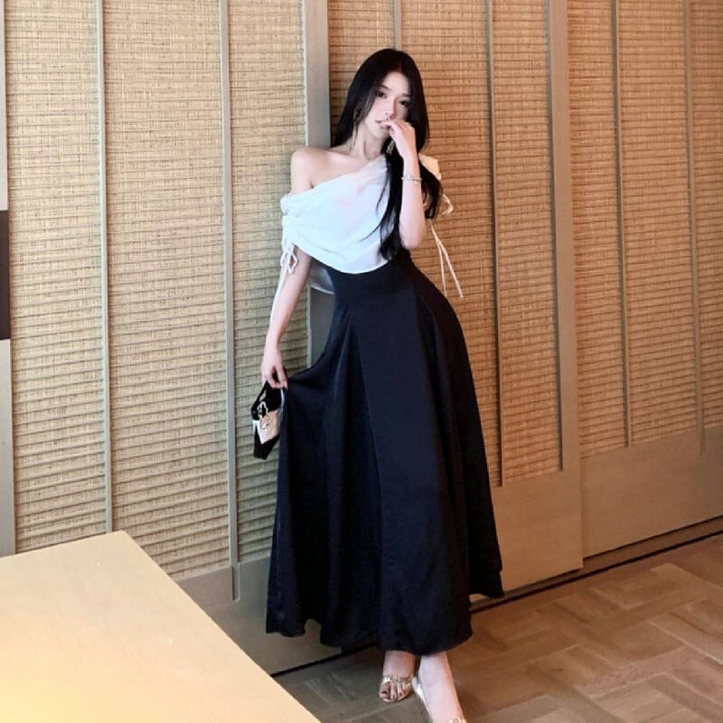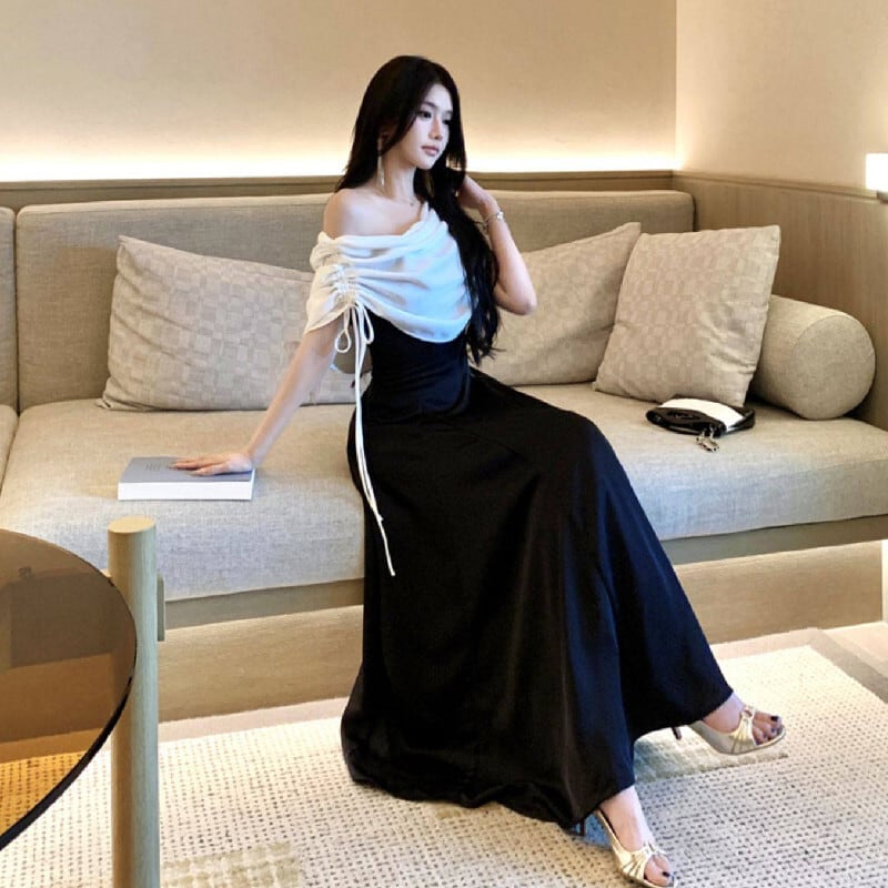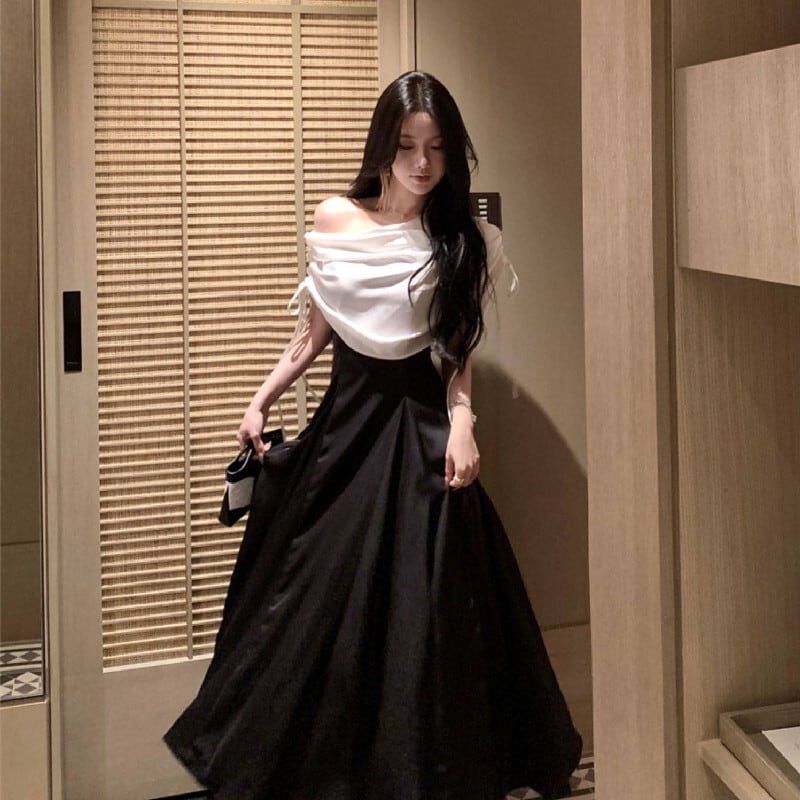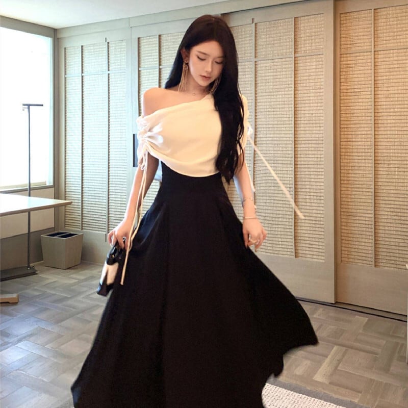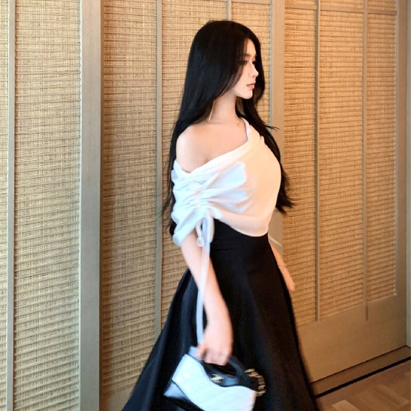 ワンピース ハイウエスト デート 気質満点 配色 フレア ブラック S M L