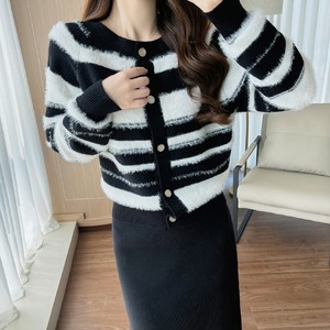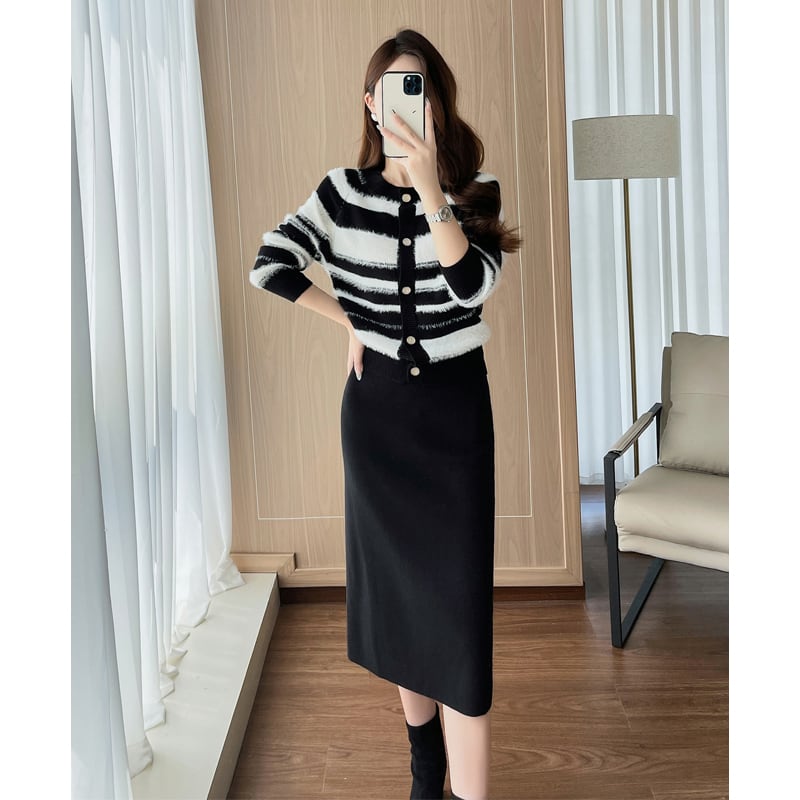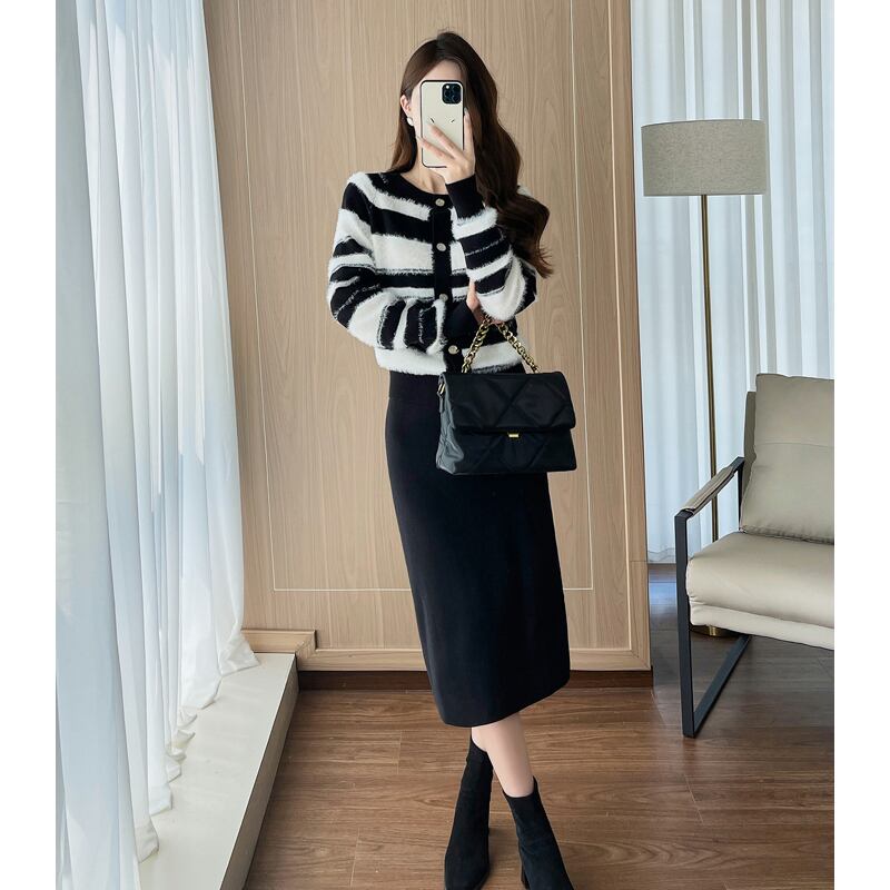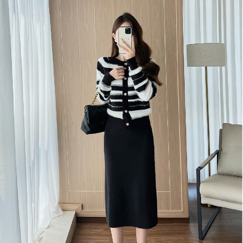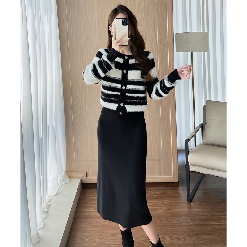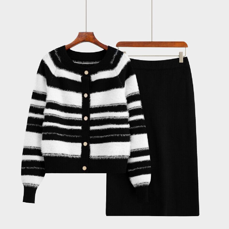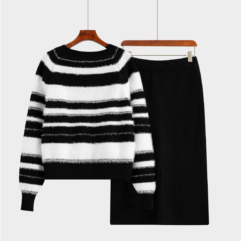 セットアップ トップス+スカート ニット OL/フォーマル ストライプ柄 配色 ブラック+ホワイト S M L XL