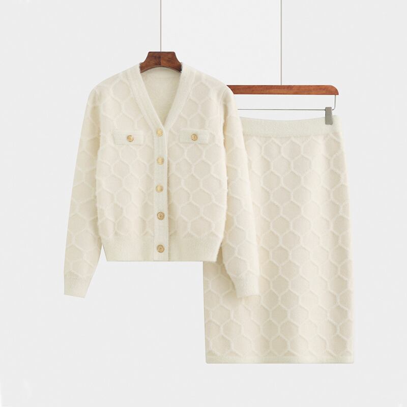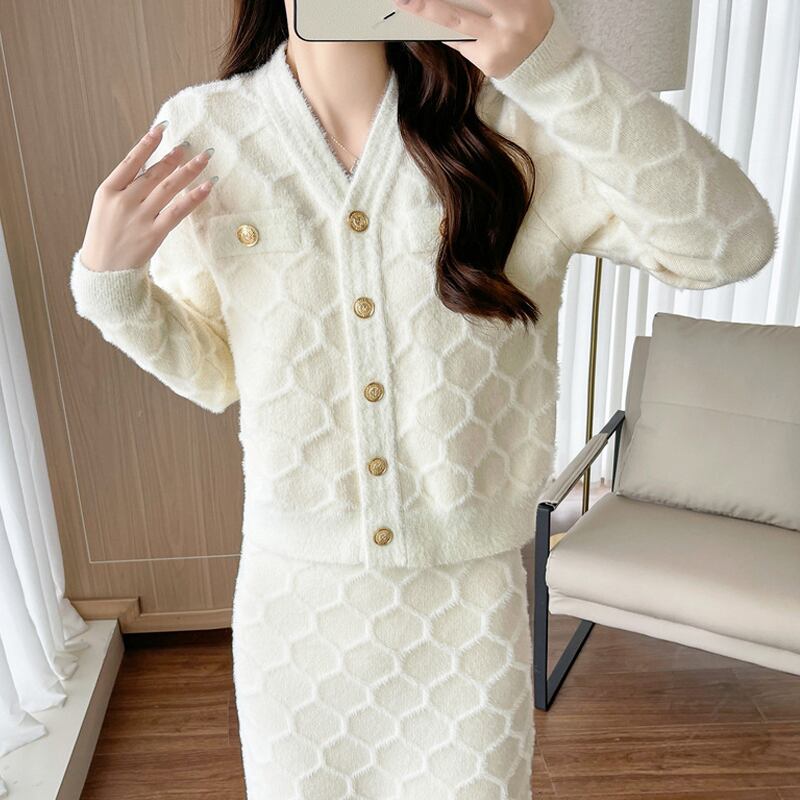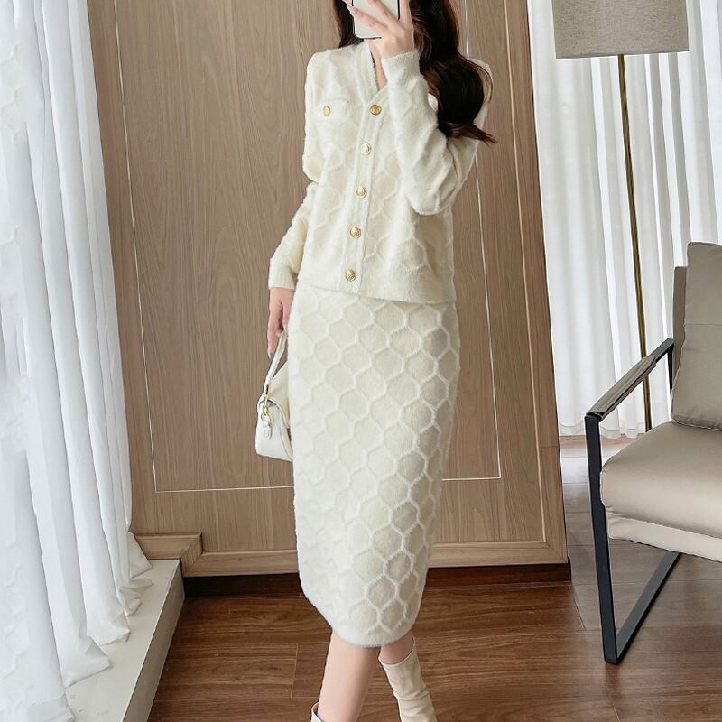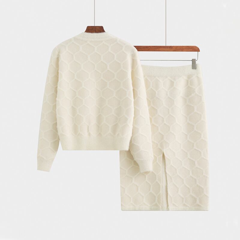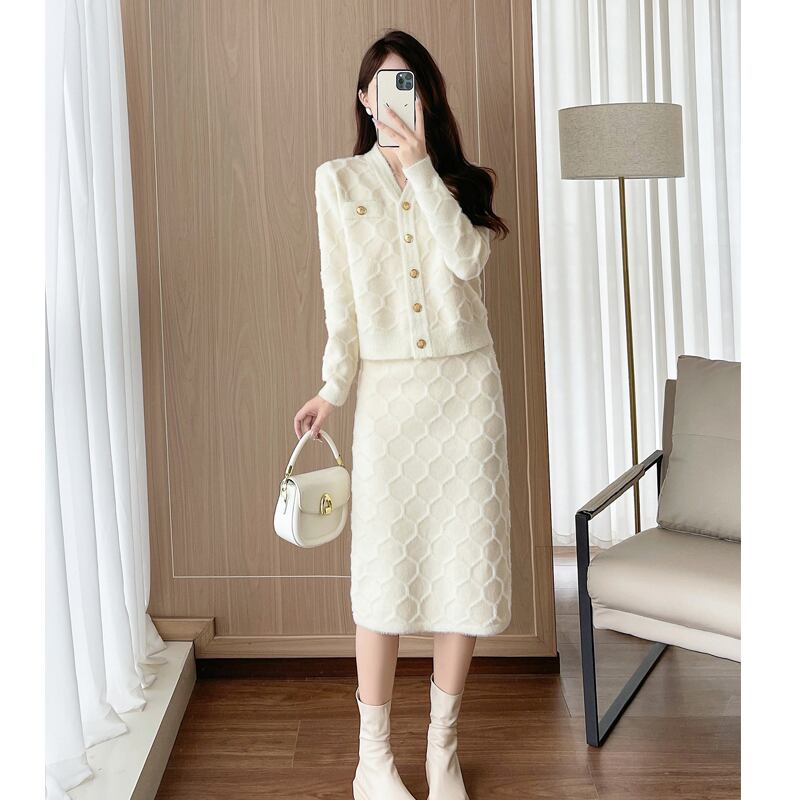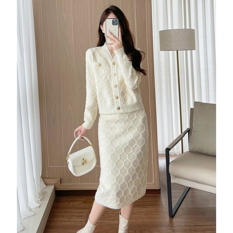 セットアップ トップス+スカート エレガント 長袖 フェイクミンク ベージュ S M L XL