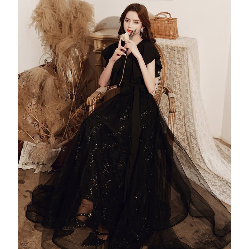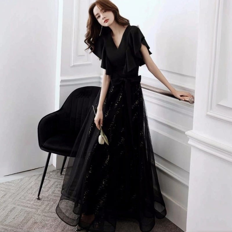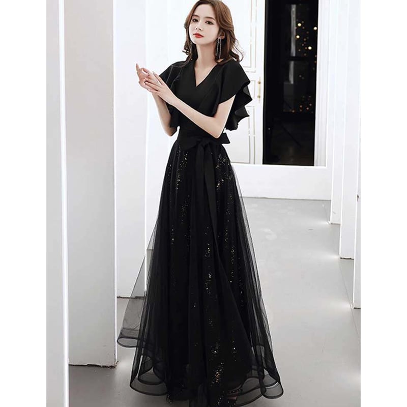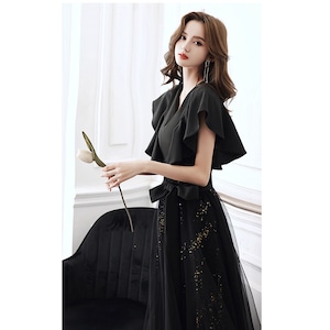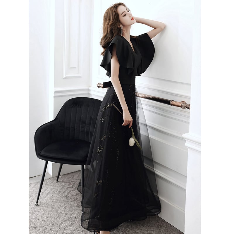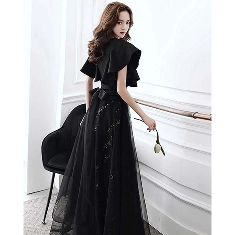 パーティードレス Vネック メッシュ ロング丈 コンサート ブラック S M L XL