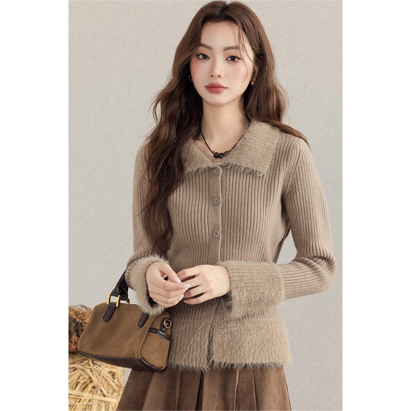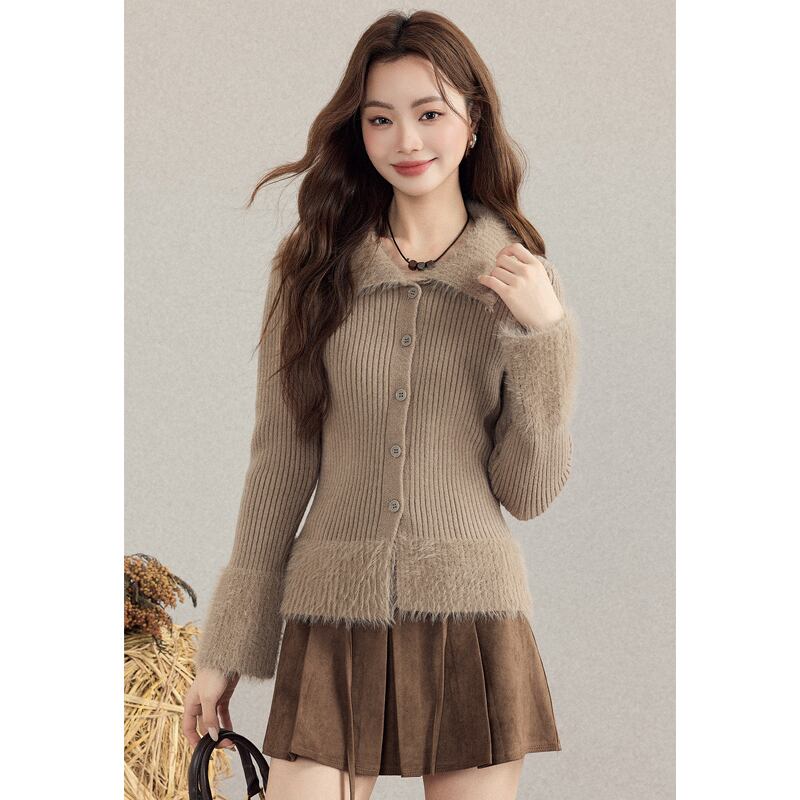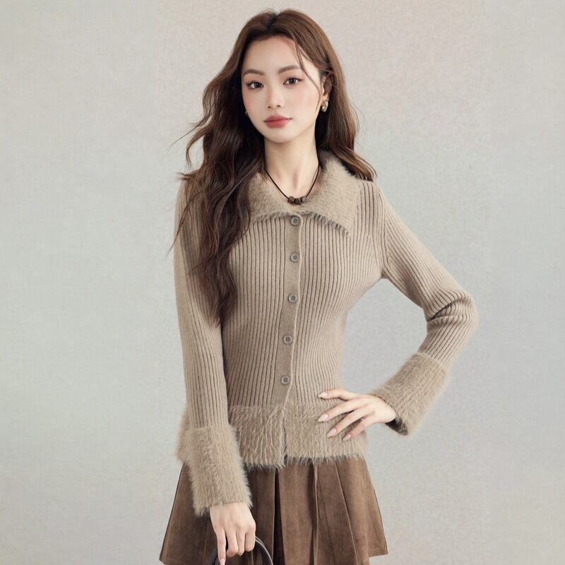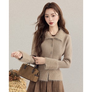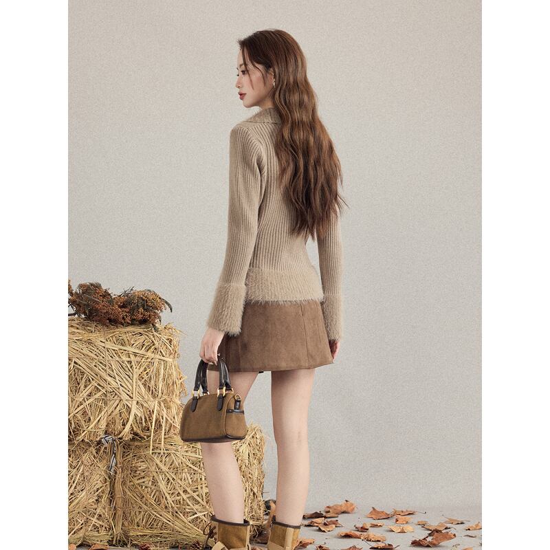 トップス 折り襟デザイン フリンジ ニット インナー ボディコン 長袖 ブラウン S M L