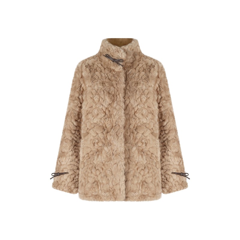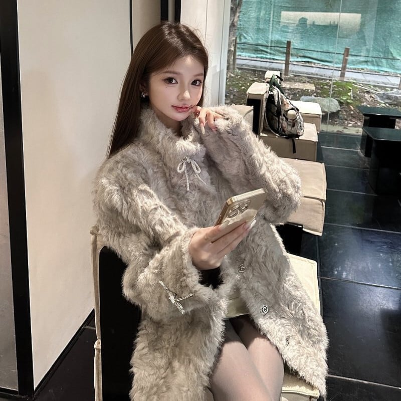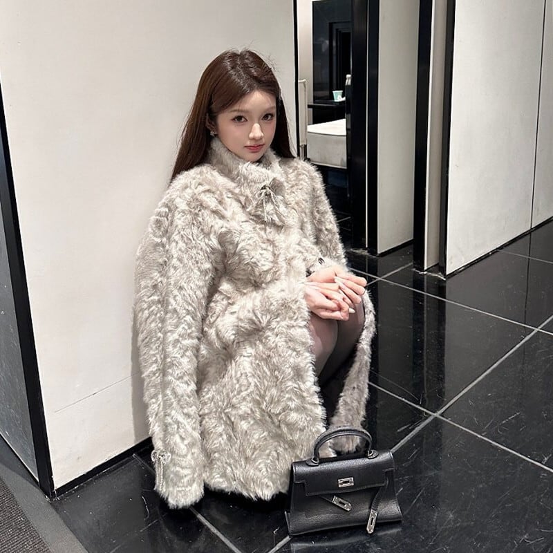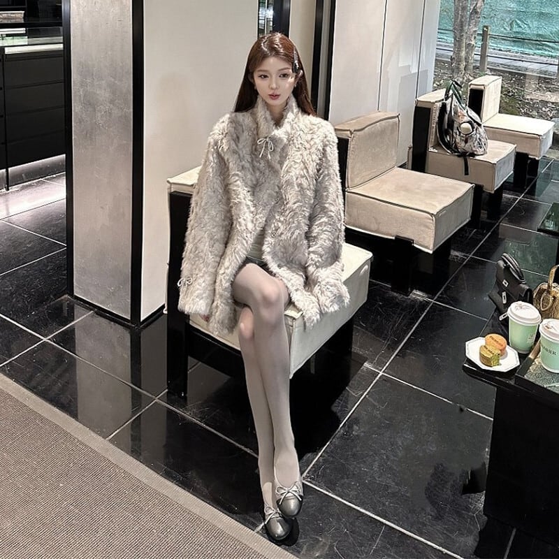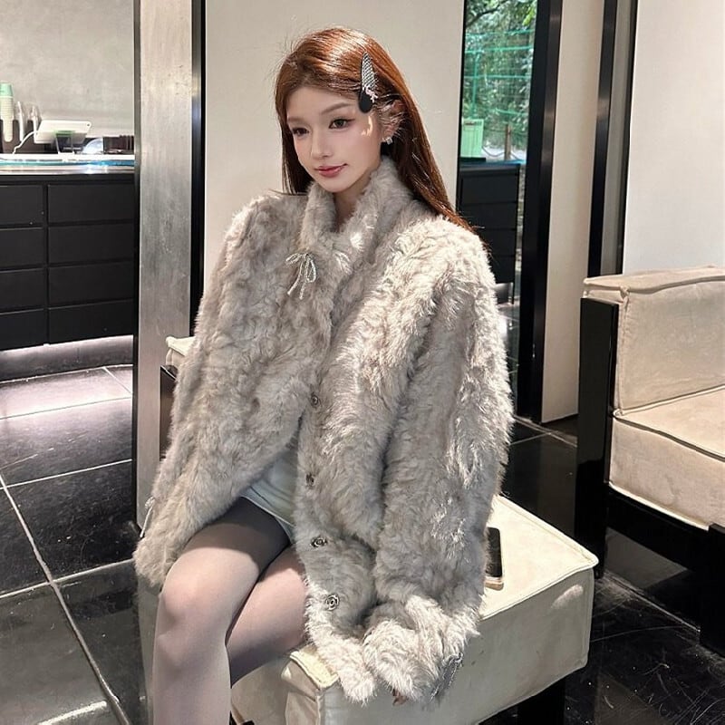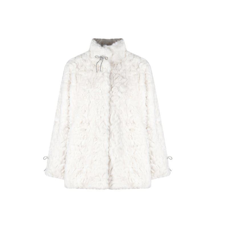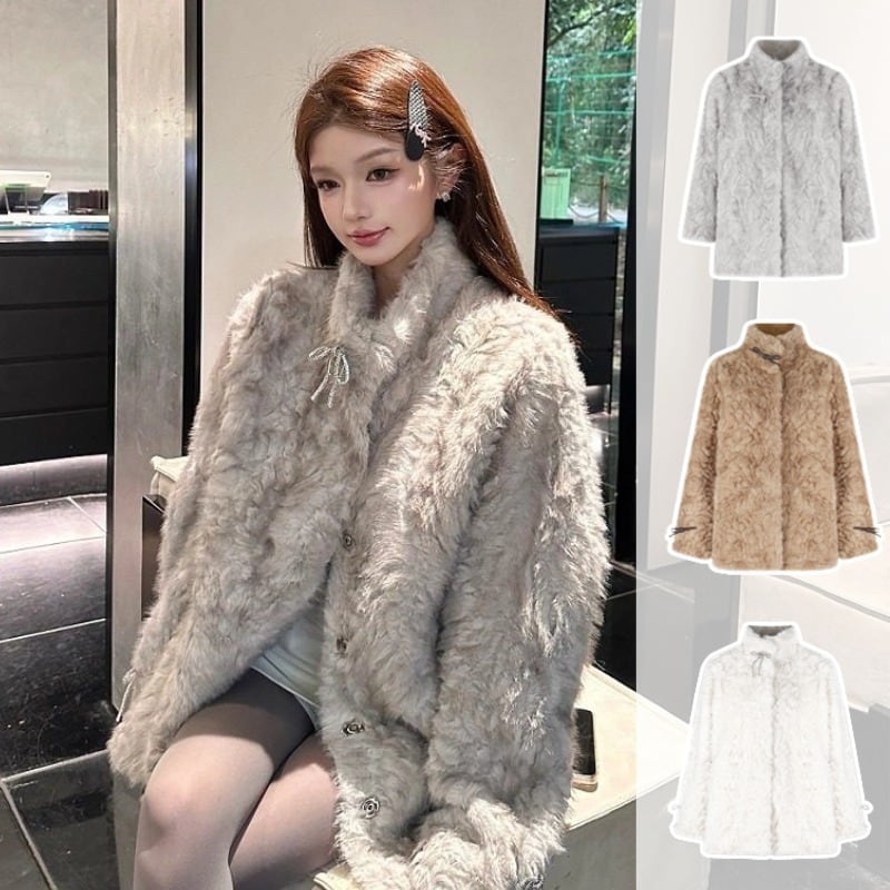 たまらない可愛さ!3色展開 もこもこ フェイクファー 暖かい ボウタイ付き アウター