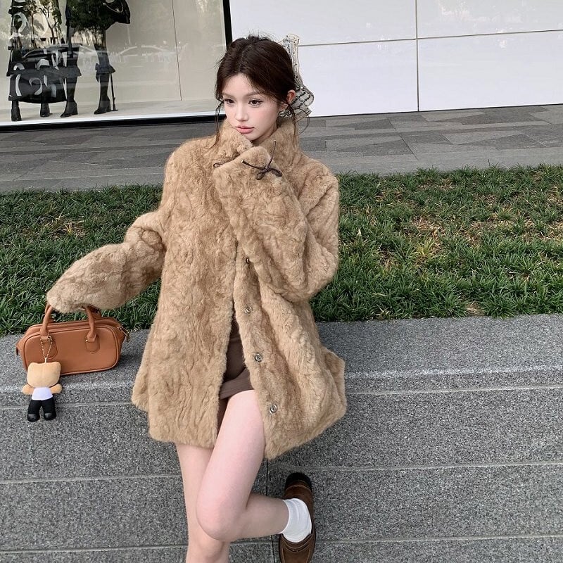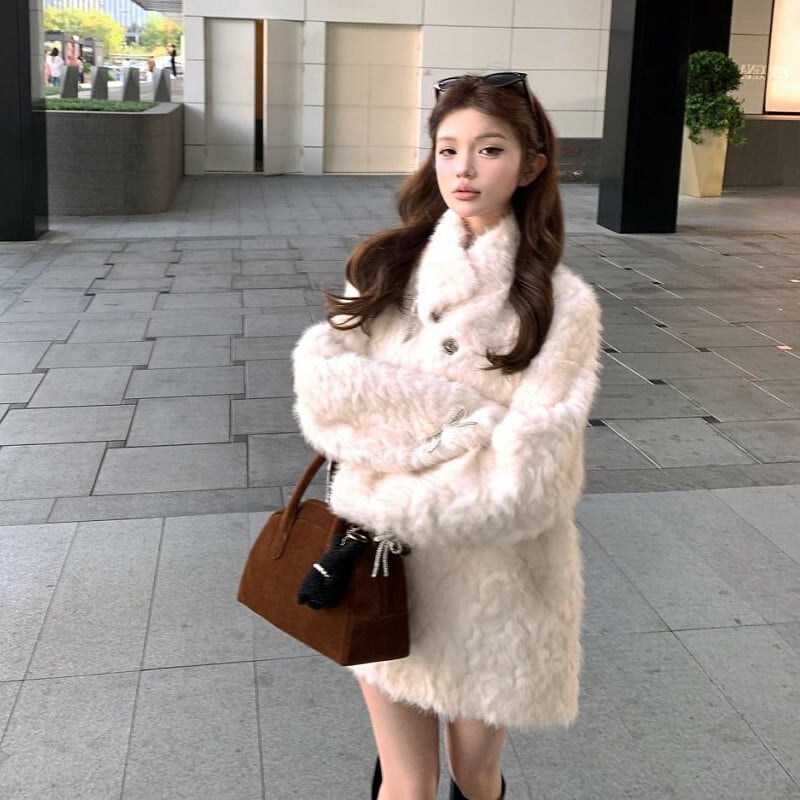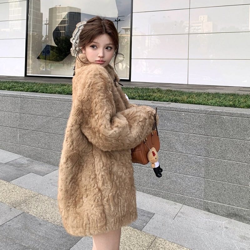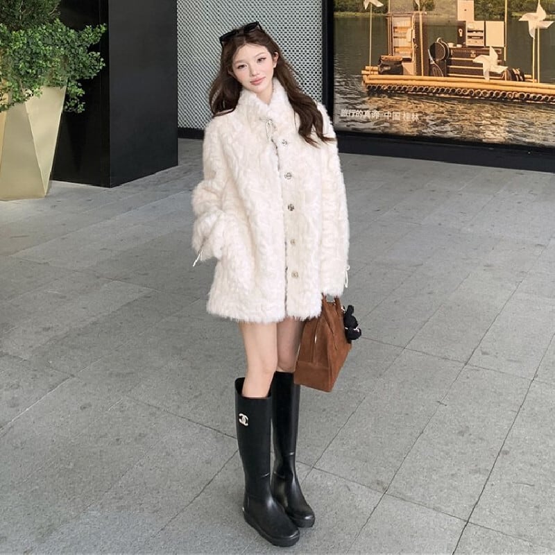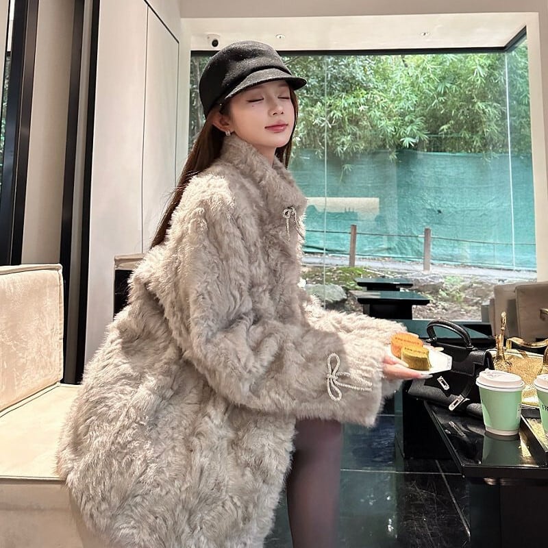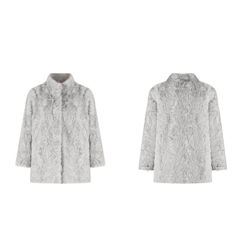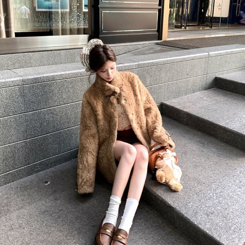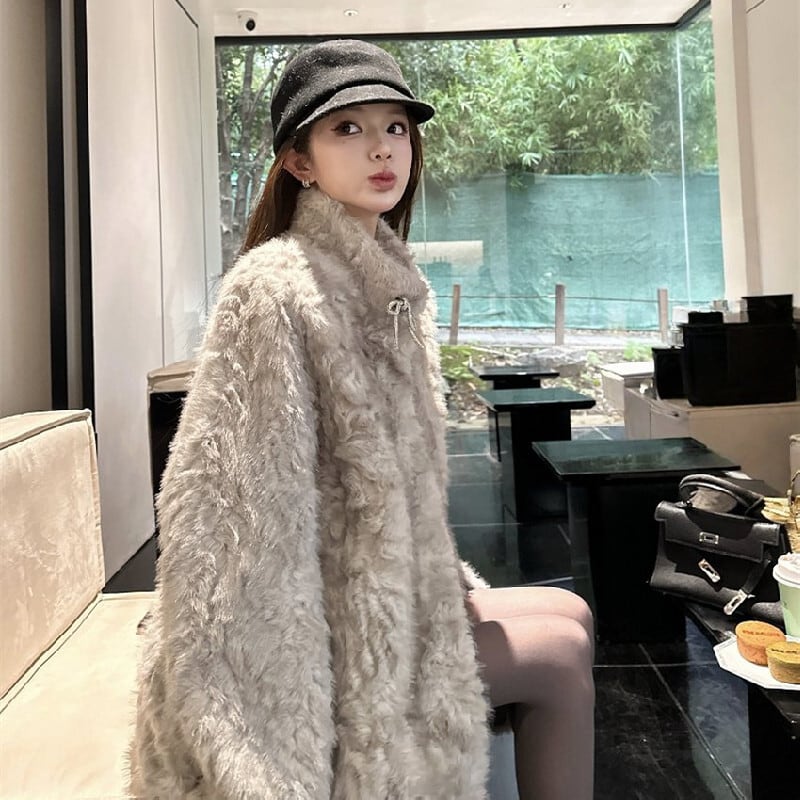 たまらない可愛さ!3色展開 もこもこ フェイクファー 暖かい ボウタイ付き アウター