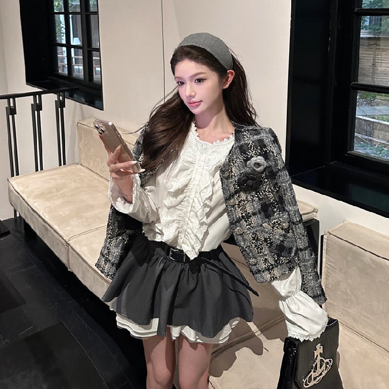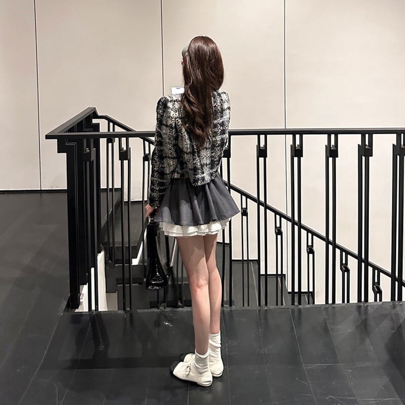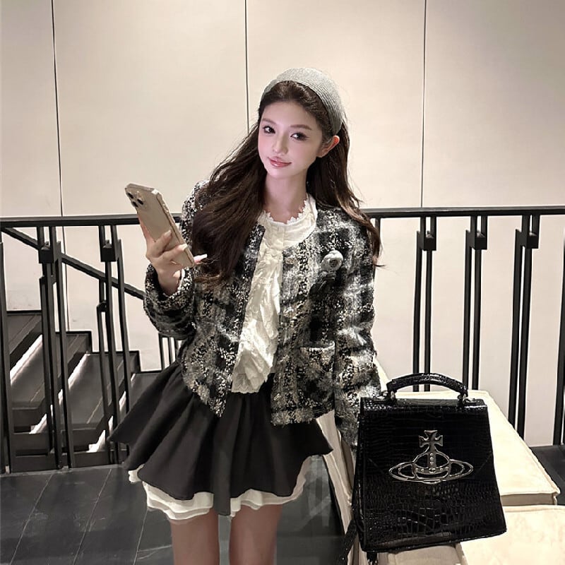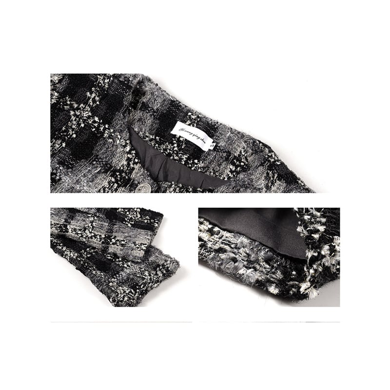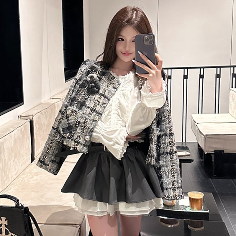 アウター ジャケット ツイード 長袖 チェック柄 シティガールファッション グレー S M