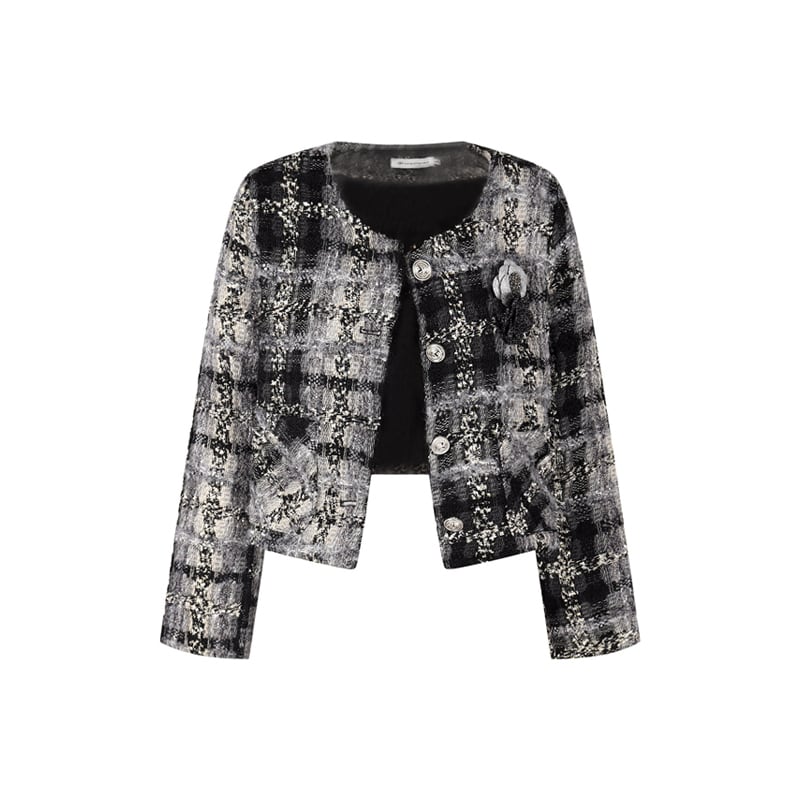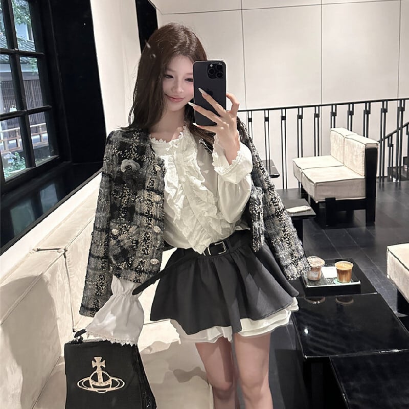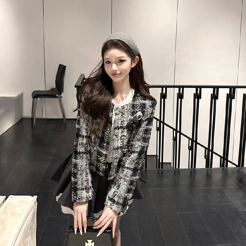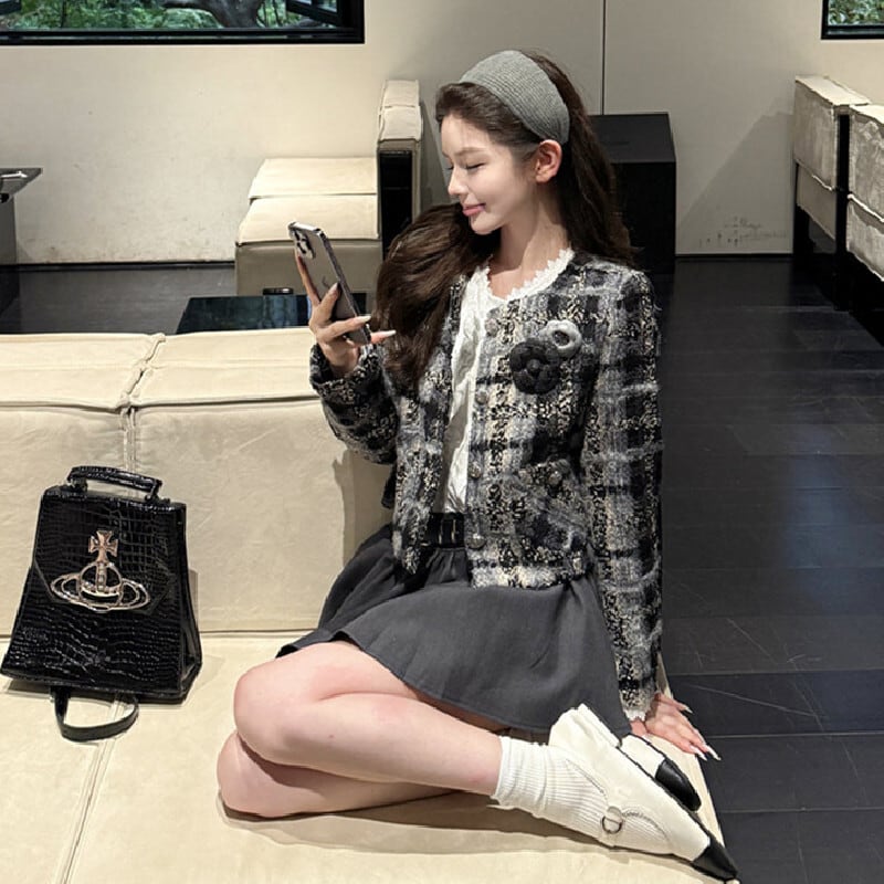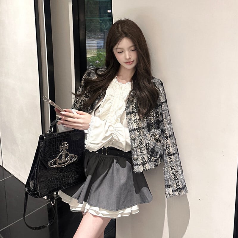 アウター ジャケット ツイード 長袖 チェック柄 シティガールファッション グレー S M