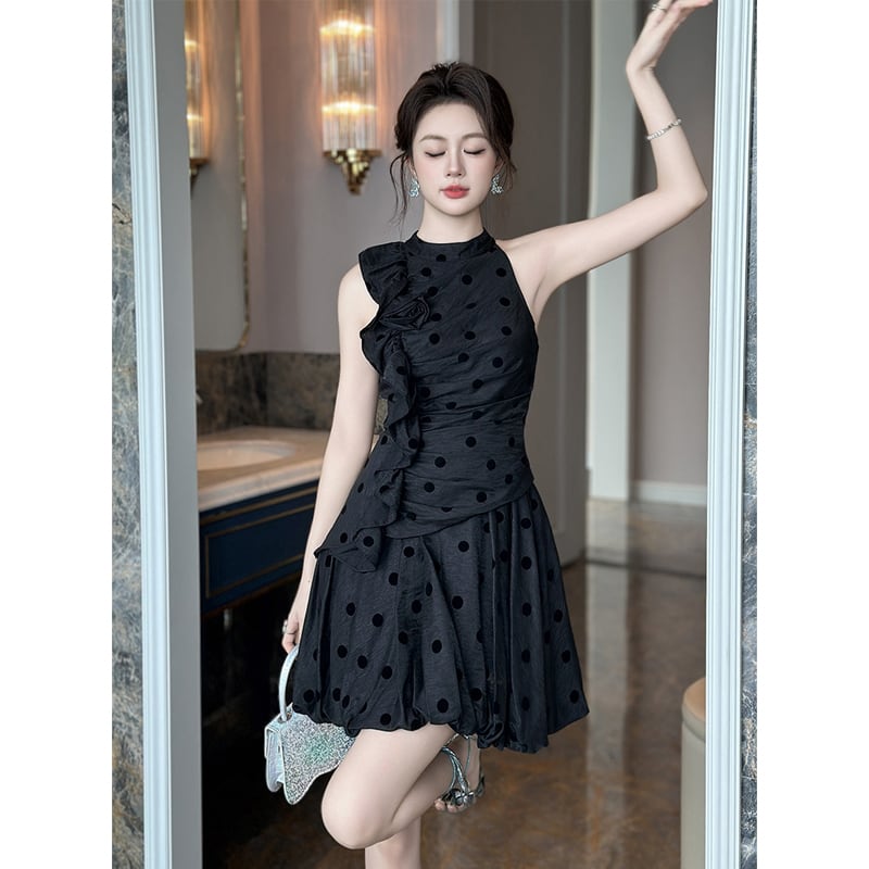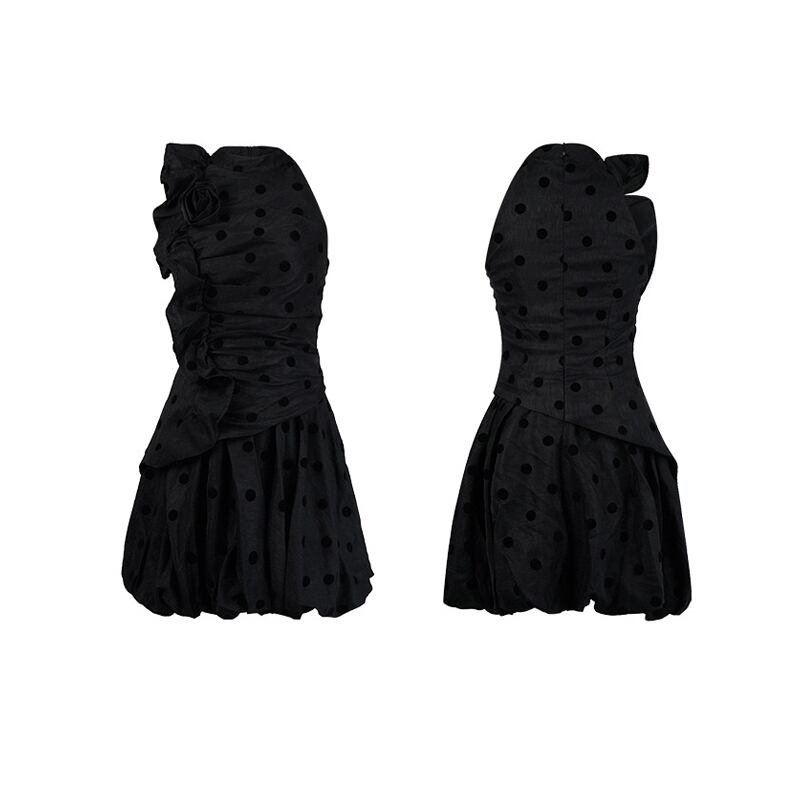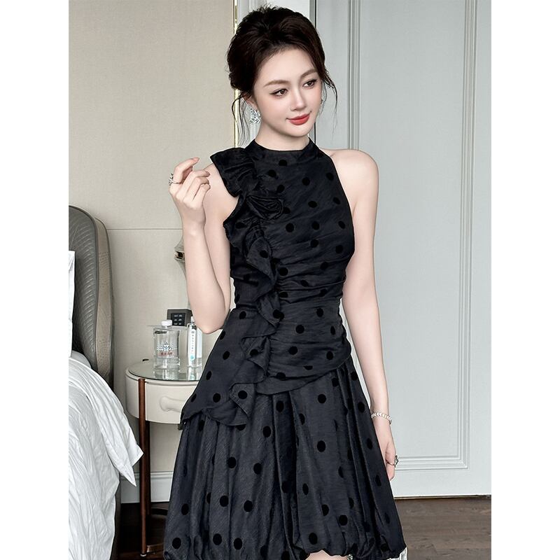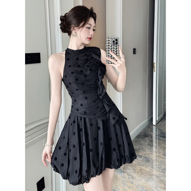 【在庫処分 値下げセール 】S1点残り✿ワンピース ドット柄 ペプラム ノースリーブ ブラック
