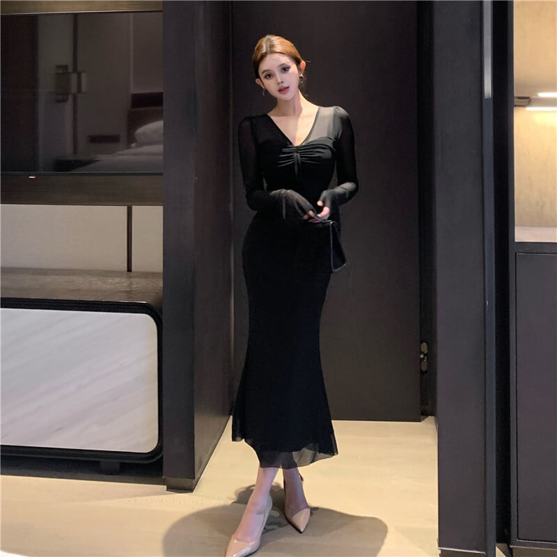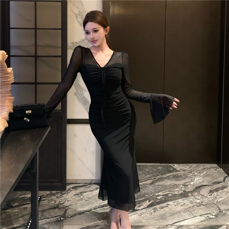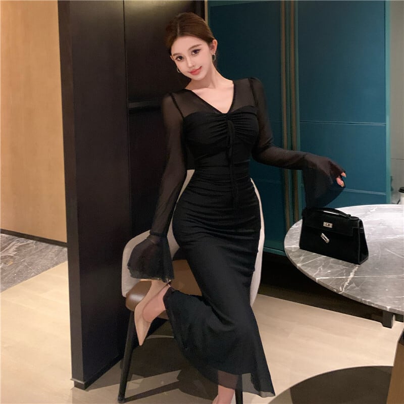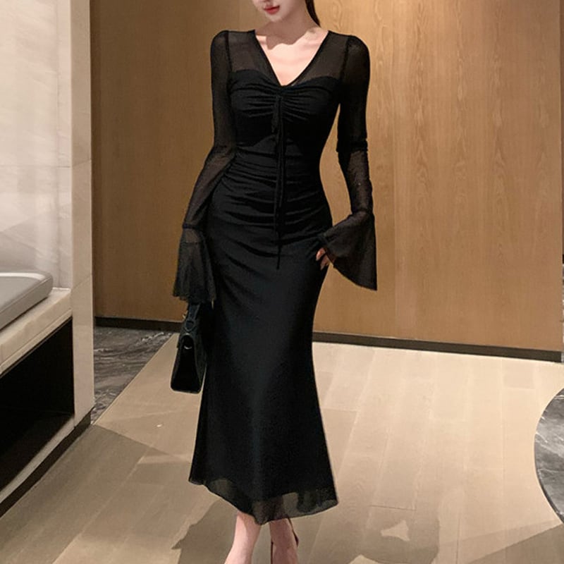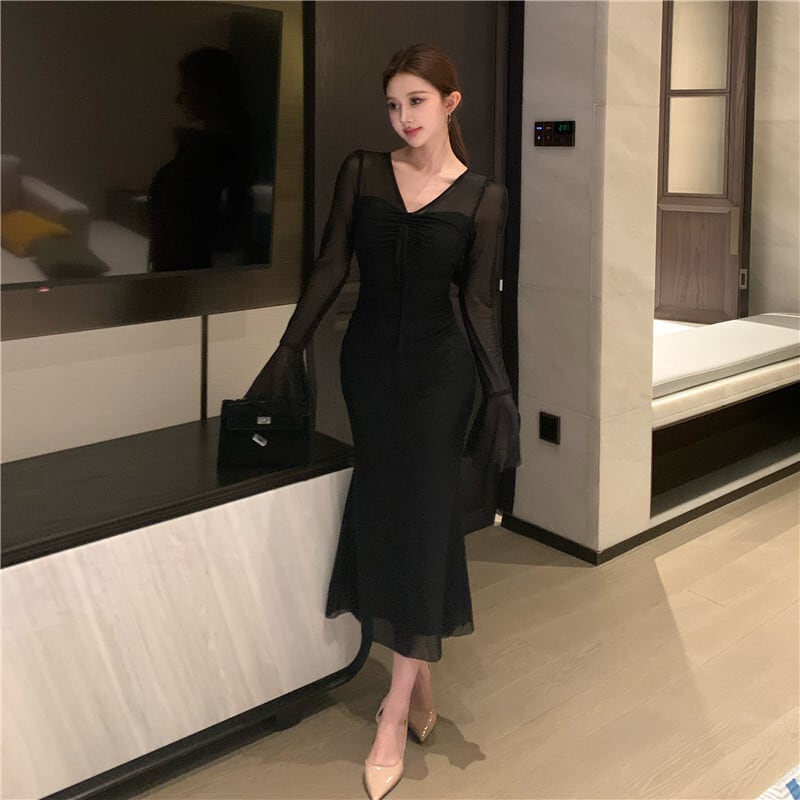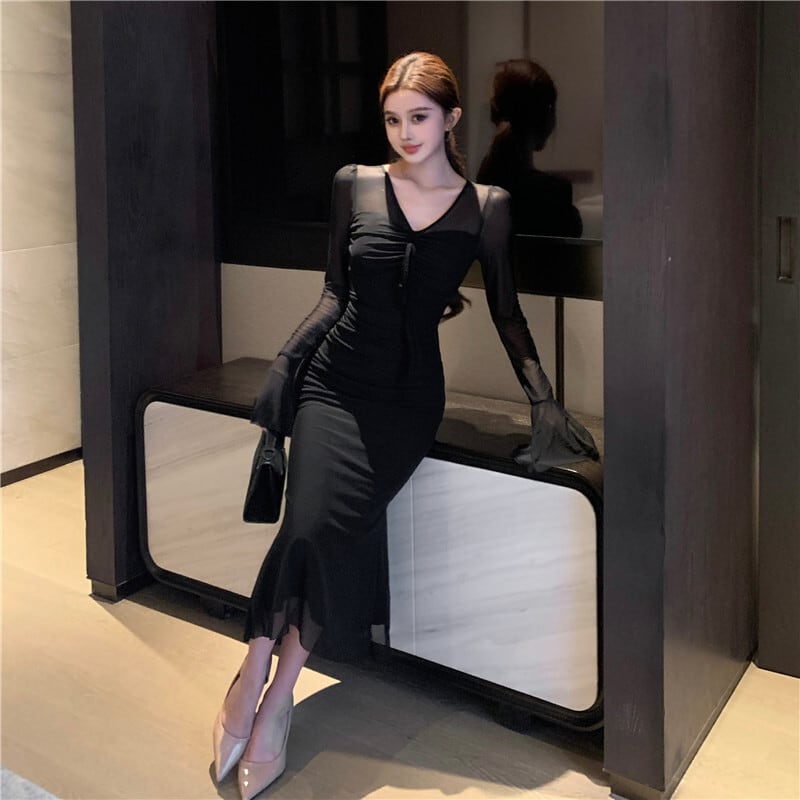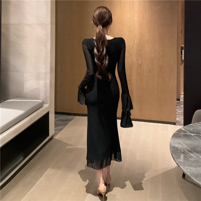ワンピース スピーカースリーブ おしゃれ シルエット ブラック S M L XL