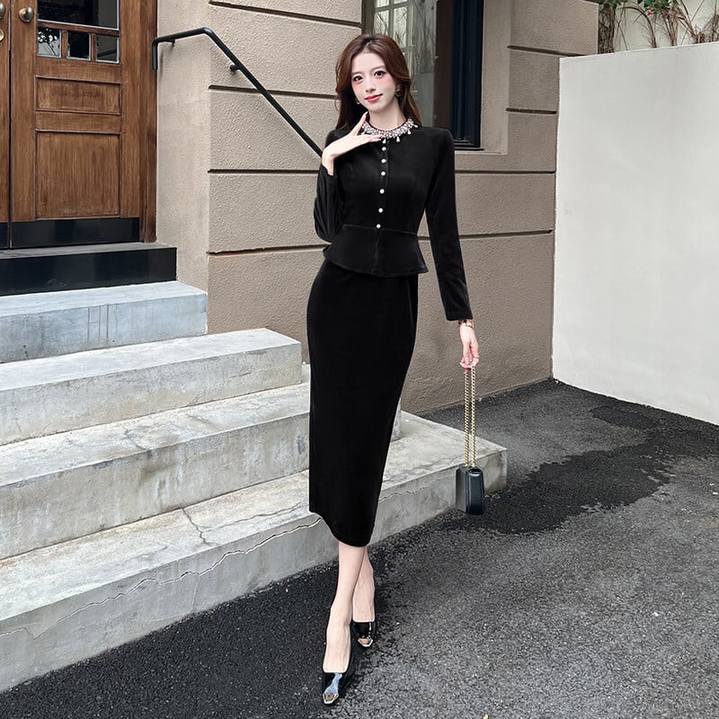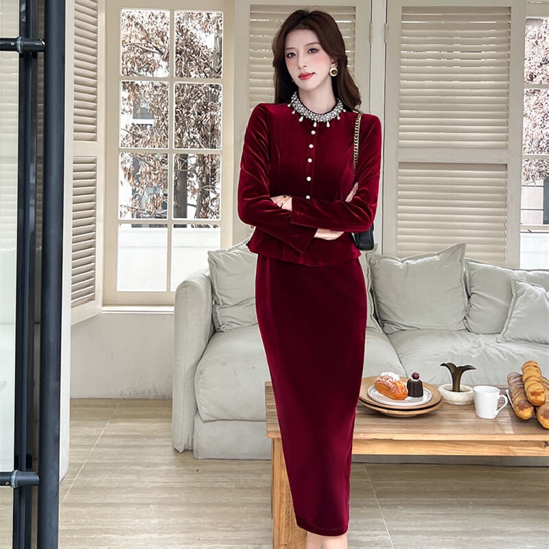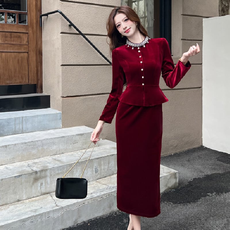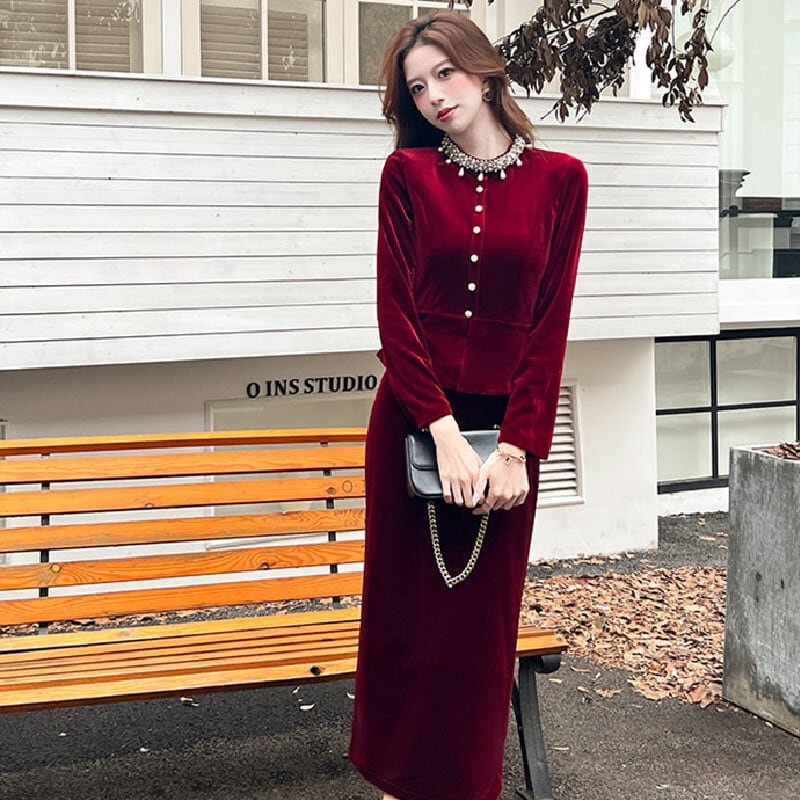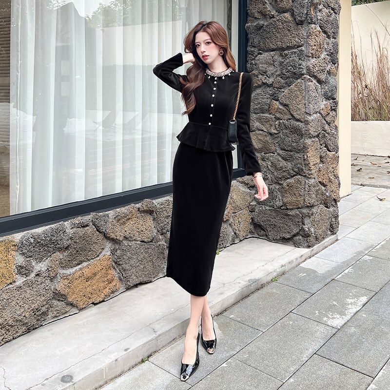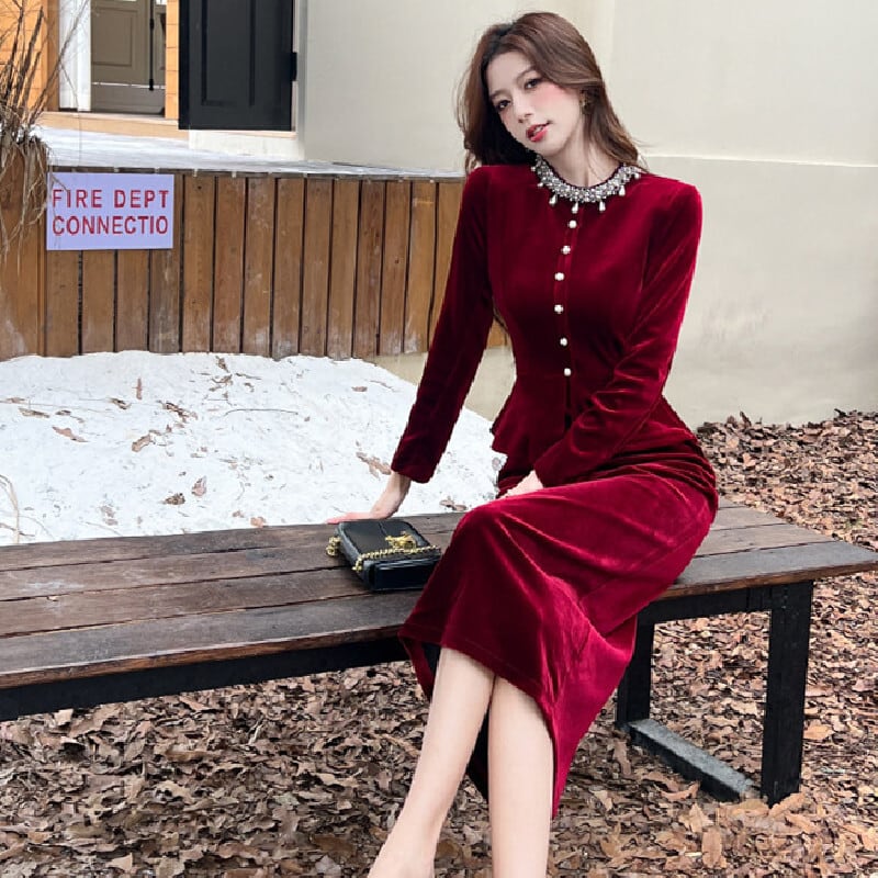 【CHERRYシリーズ】ワンピース ベルベット フェイクレイヤード ブラック ワインレッド S M L XL