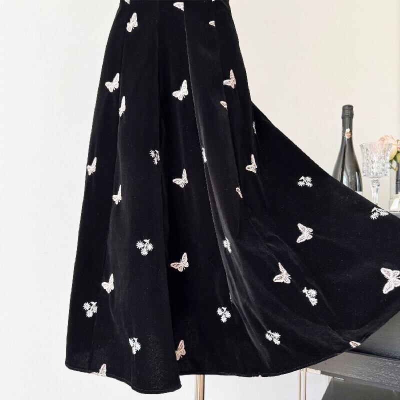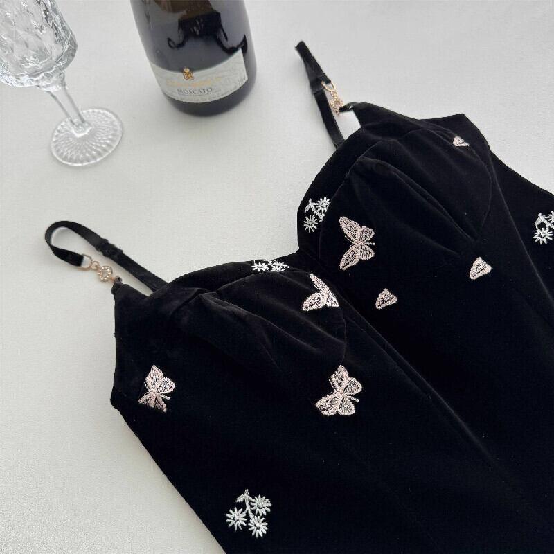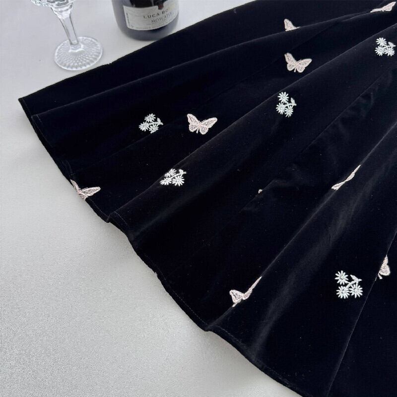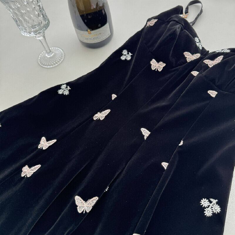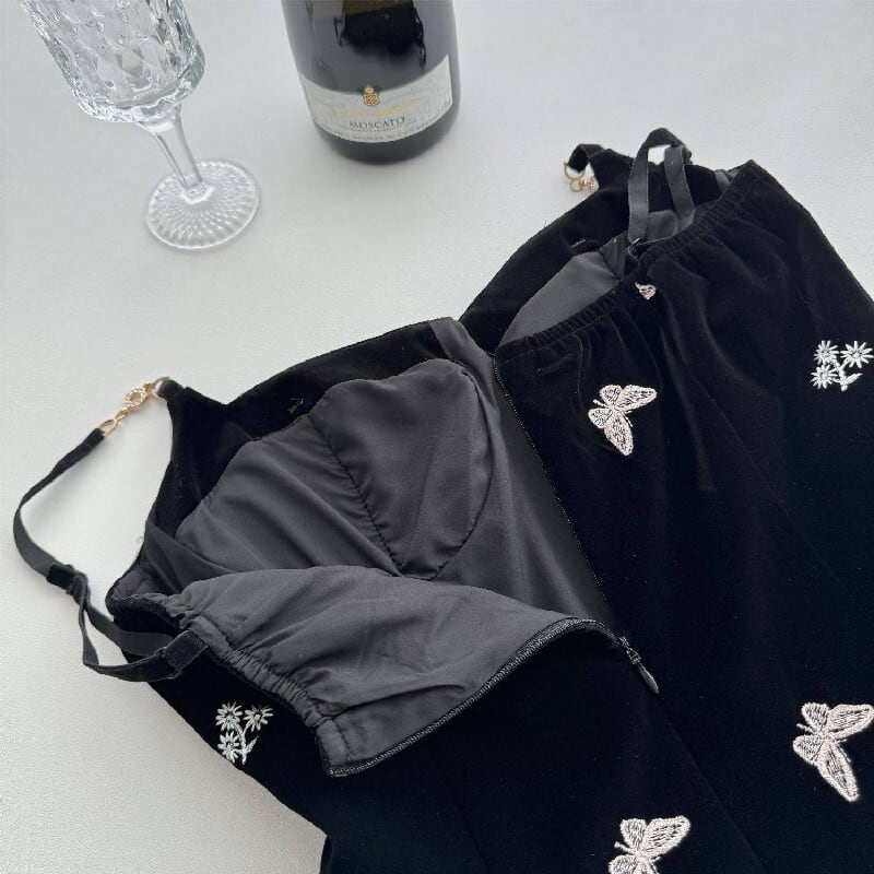 セットアップ インナートップス+ブラック ベルベット 刺繡 ワンピース S M L
