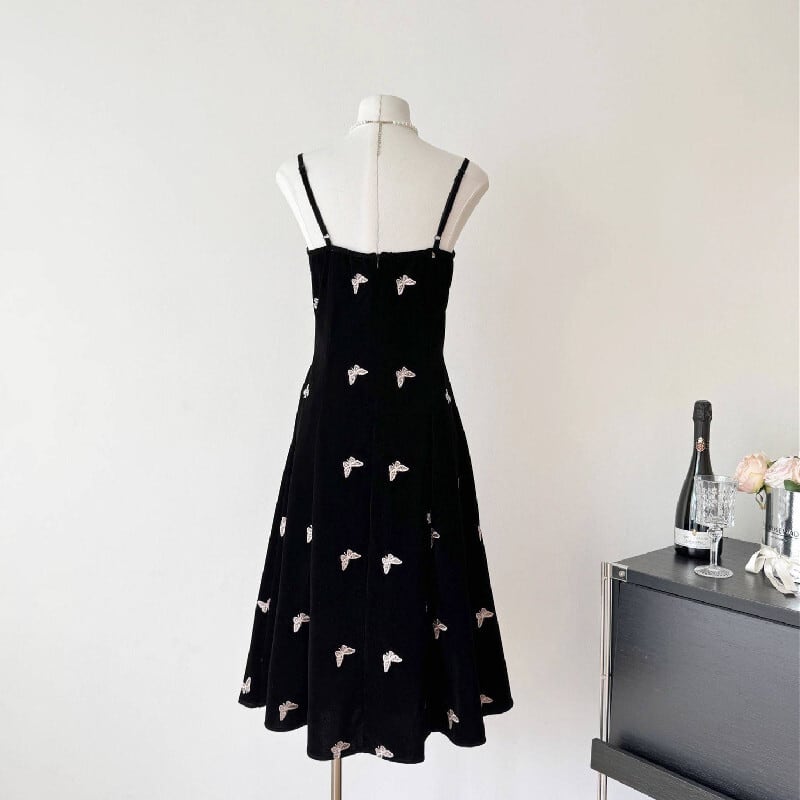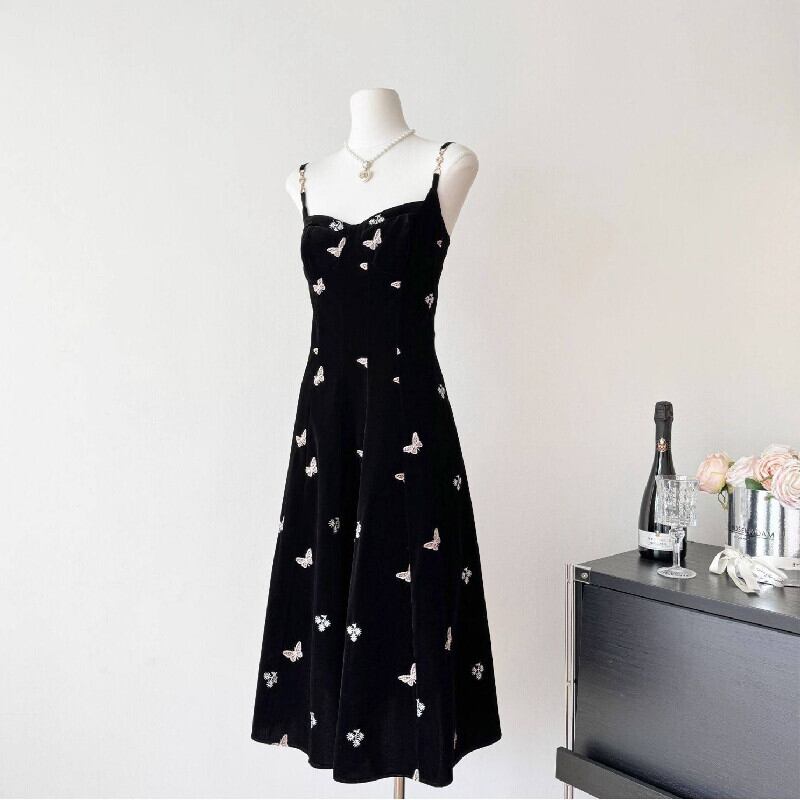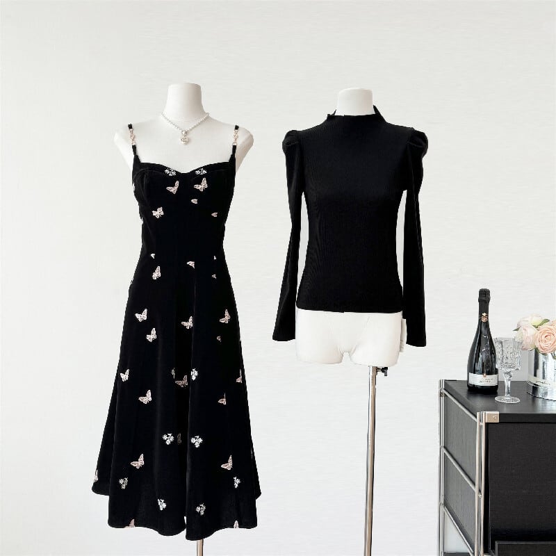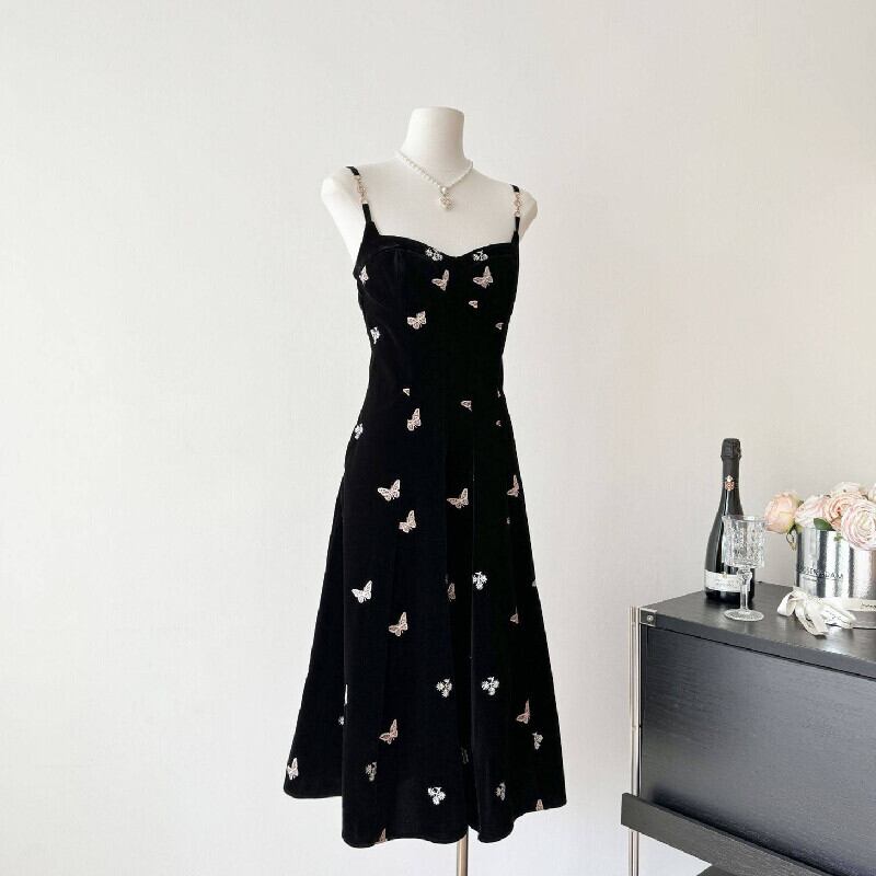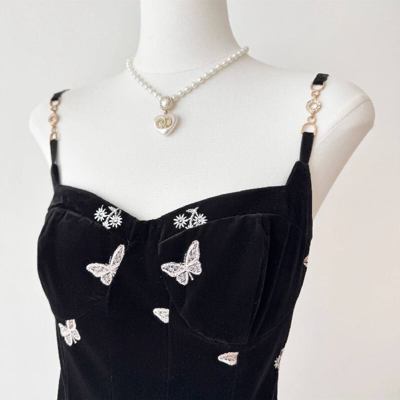 セットアップ インナートップス+ブラック ベルベット 刺繡 ワンピース S M L