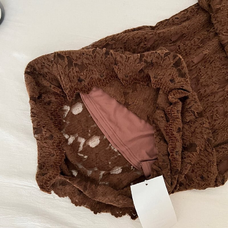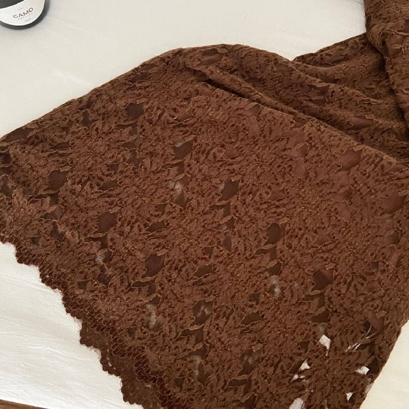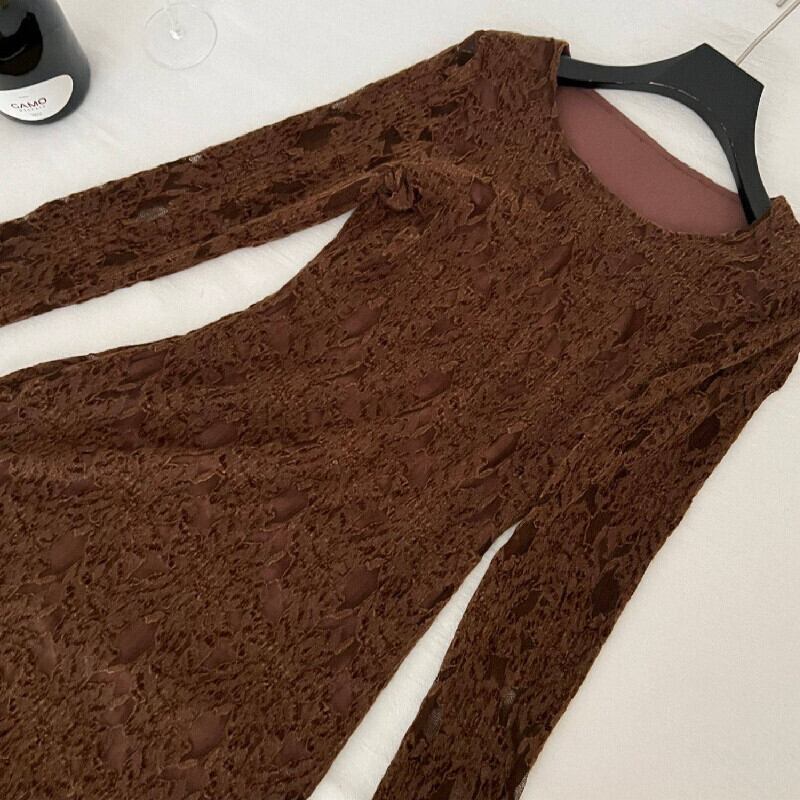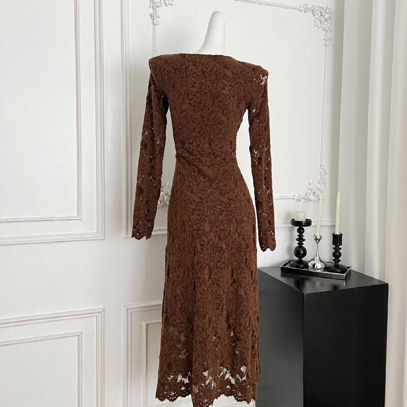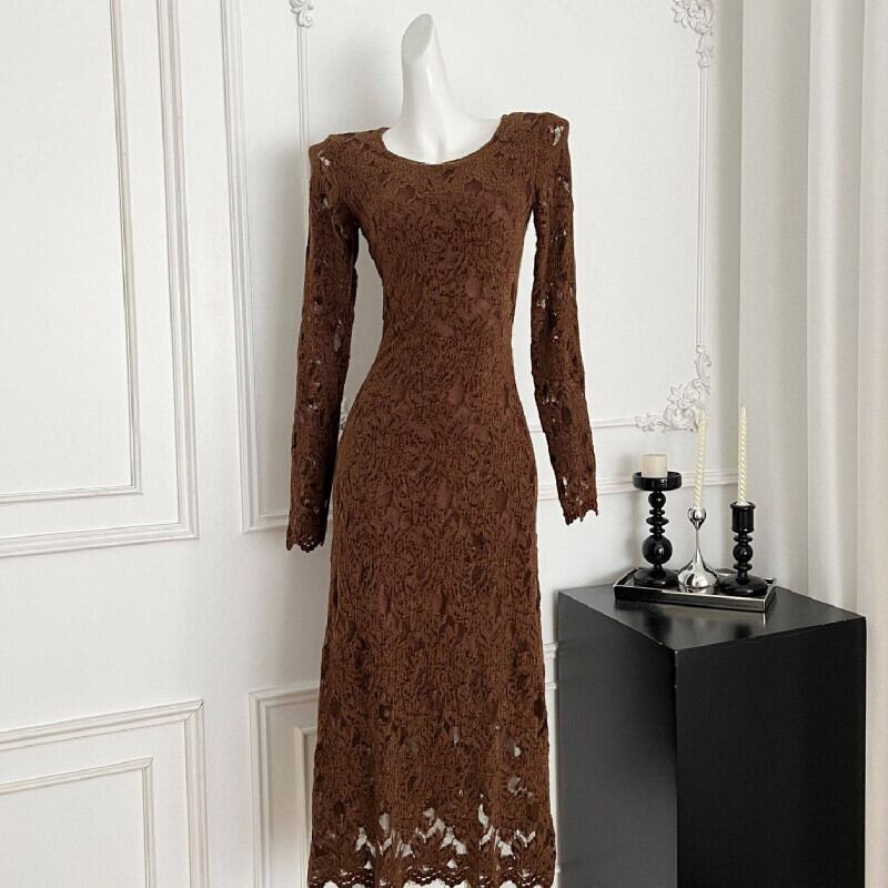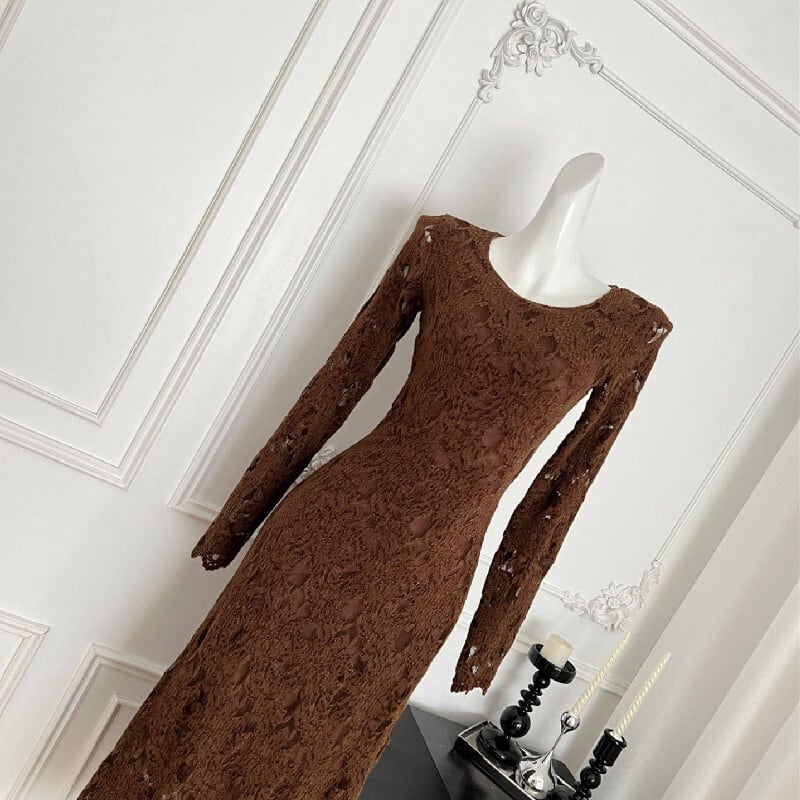 ワンピース レース ラウンドネック シルエット フェミニン コーヒー色 S M L