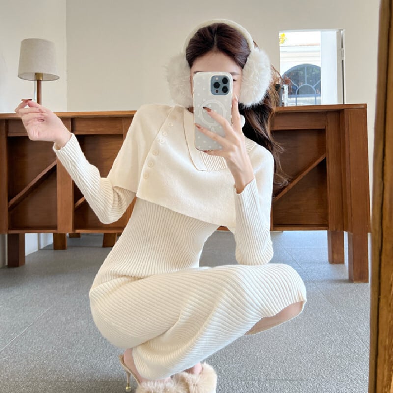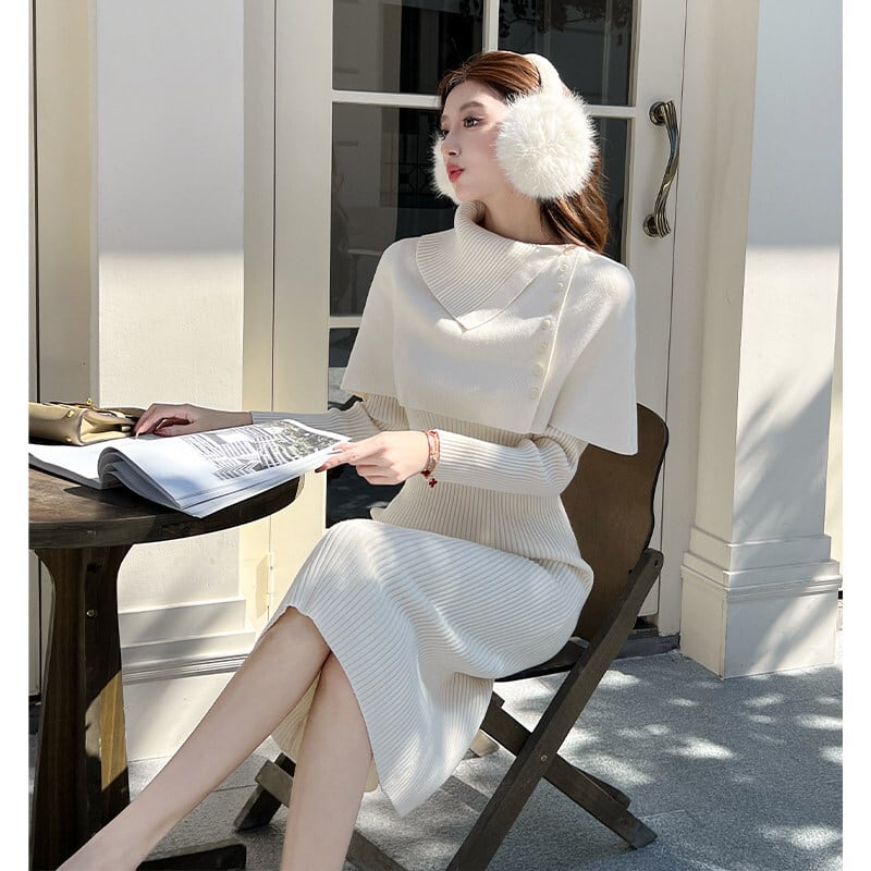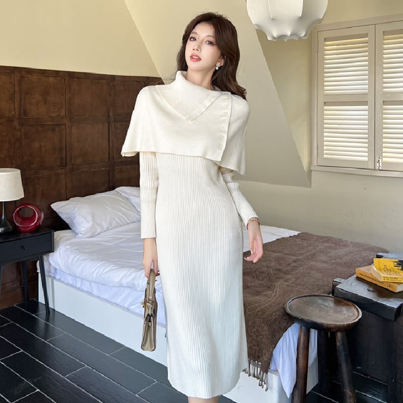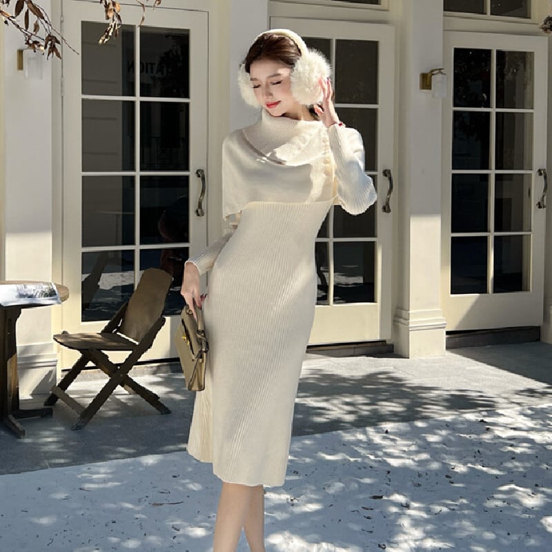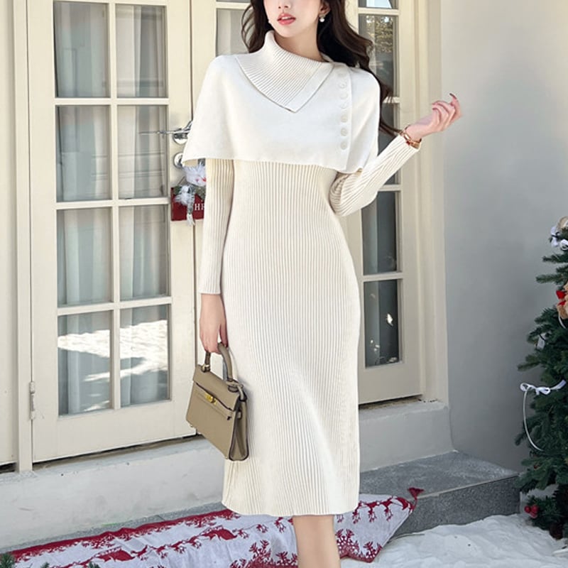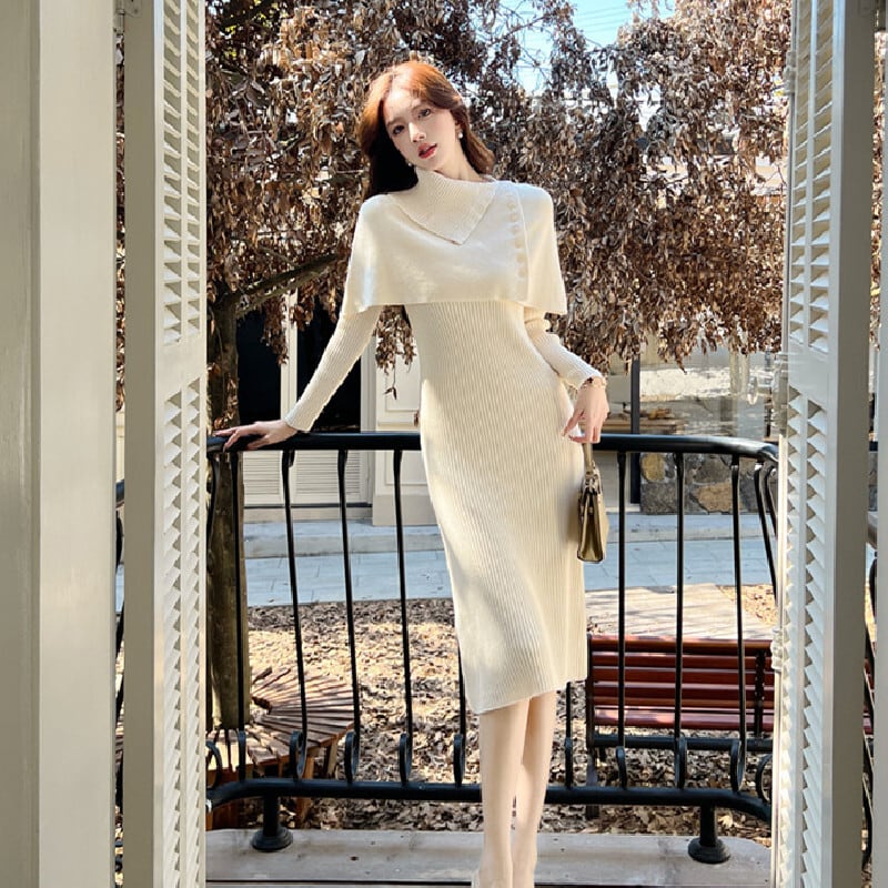 【CHERRYシリーズ】ケープ付きワンピース ニット エレガント 無地 ベージュ