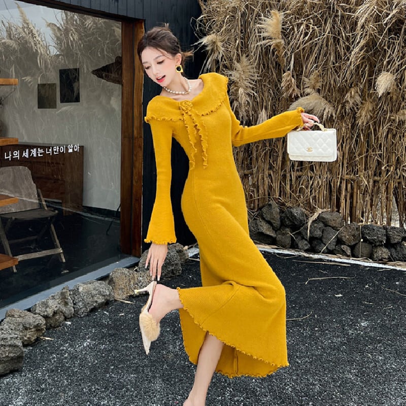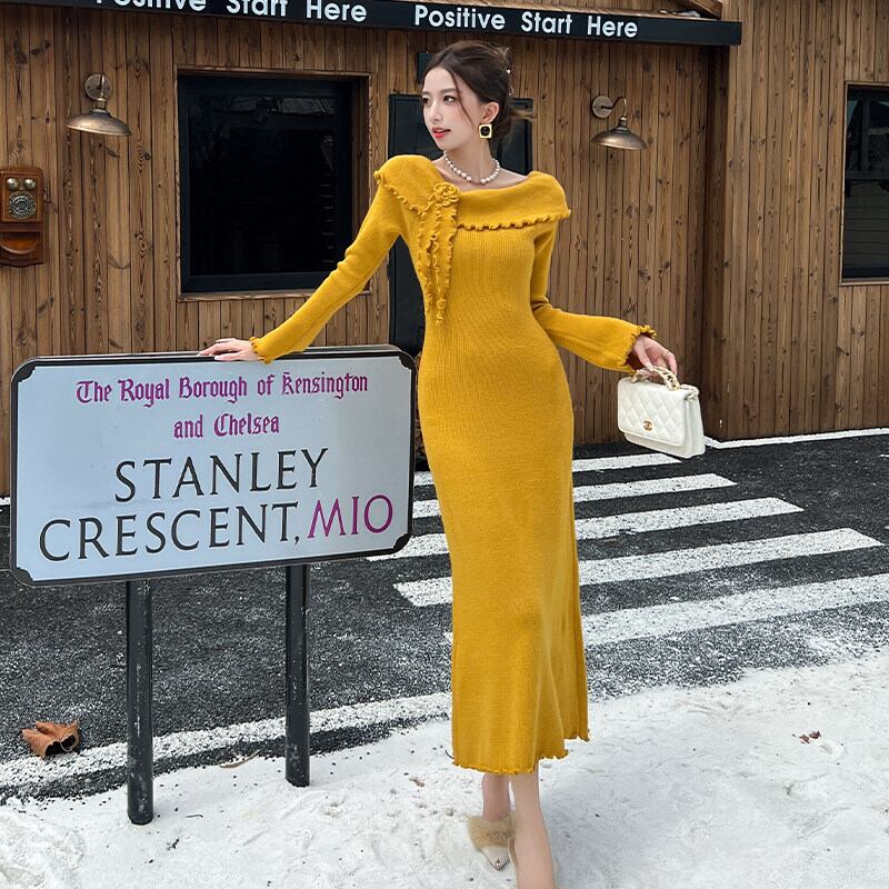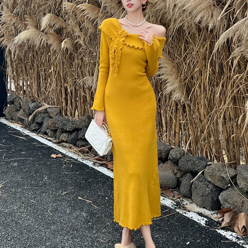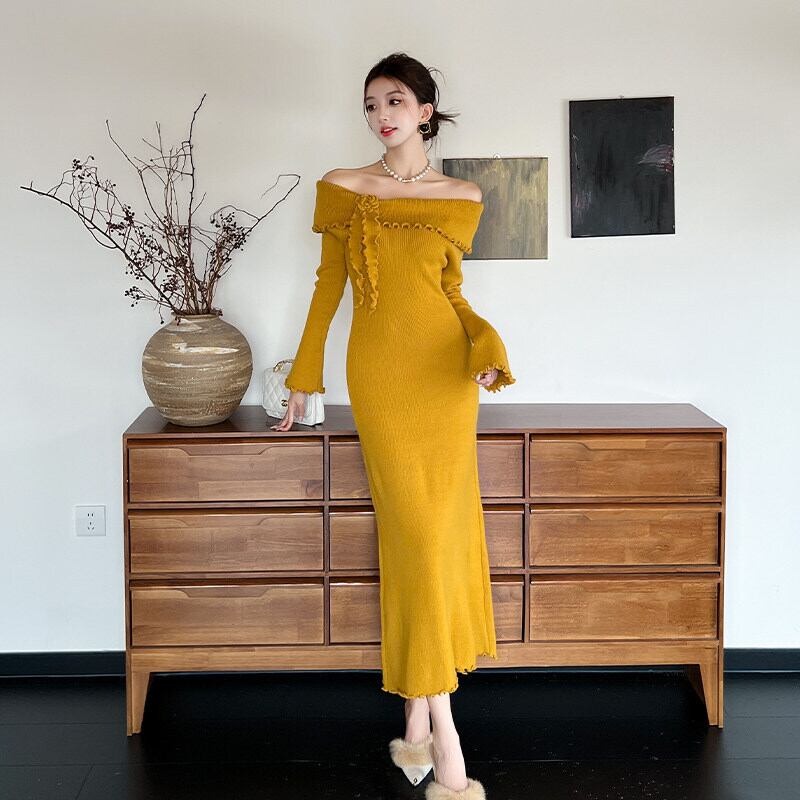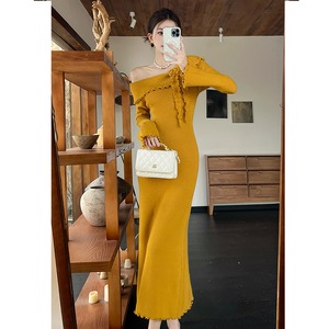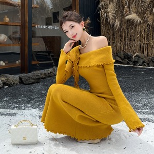 【CHERRYシリーズ】ワンピース ニット オフショルダー 長袖 イエロー