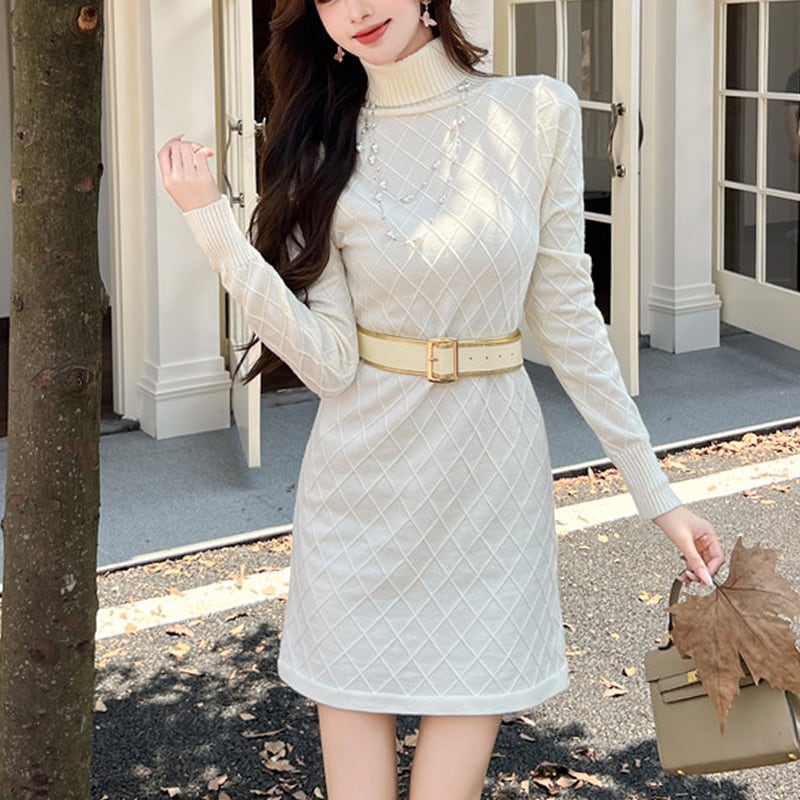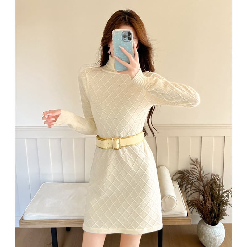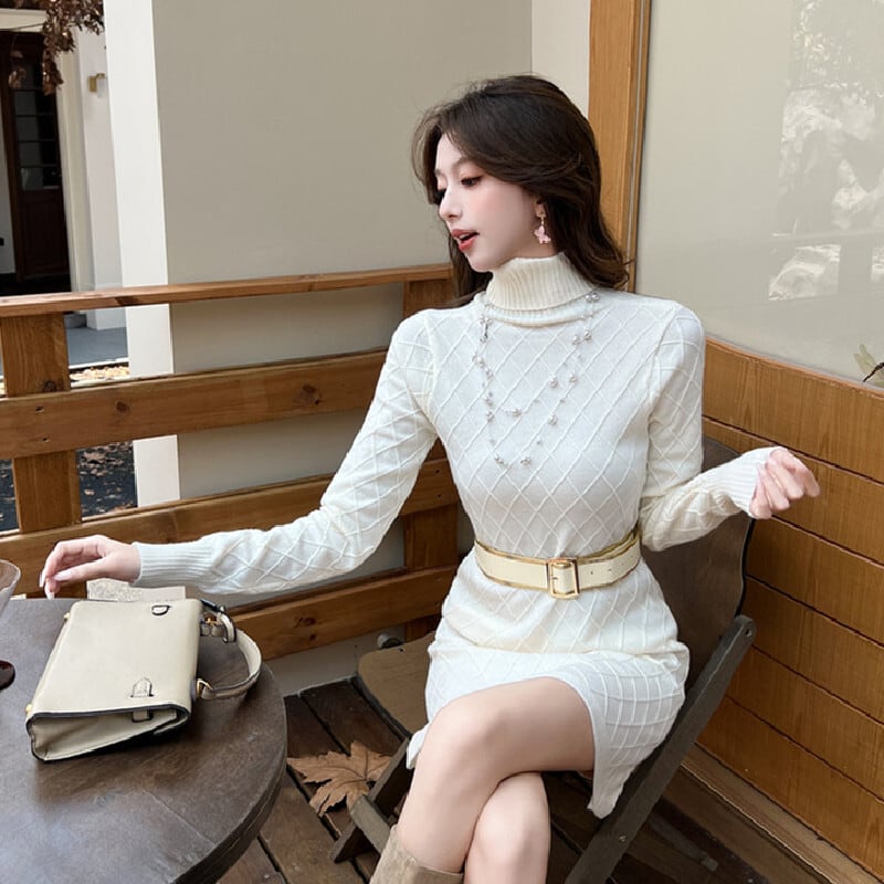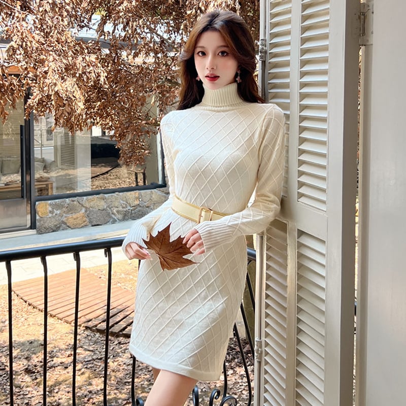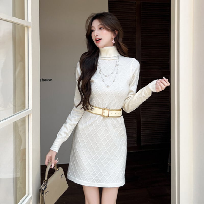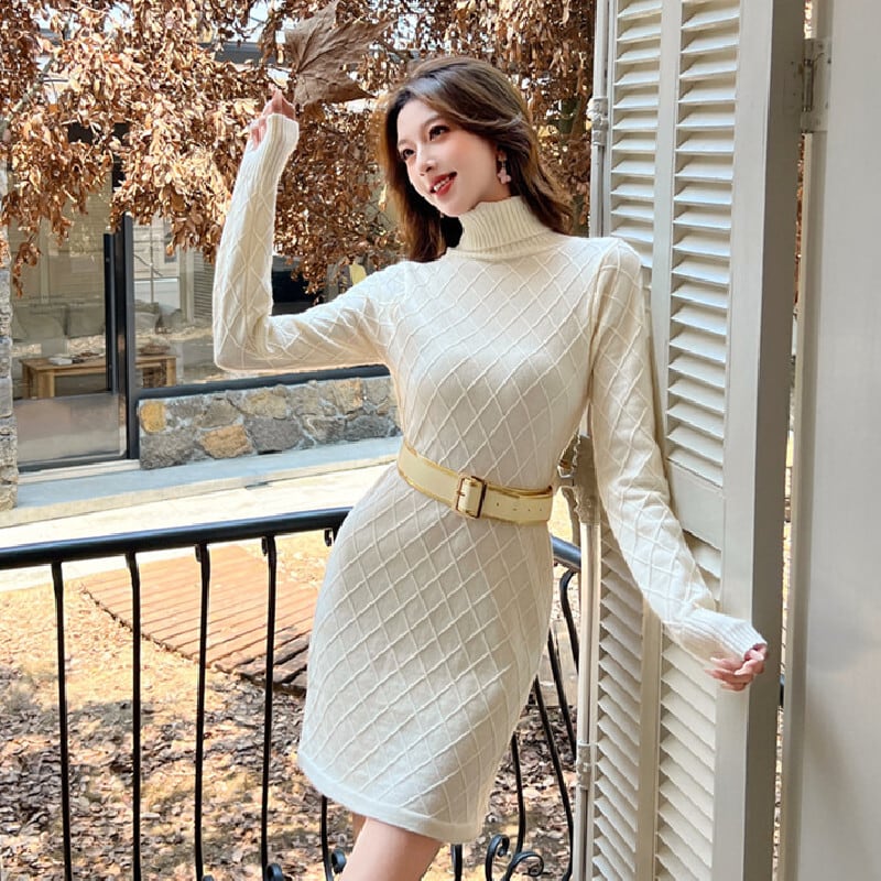 【CHERRYシリーズ】ワンピース ニット タートルネック 膝上 ベージュ S M L