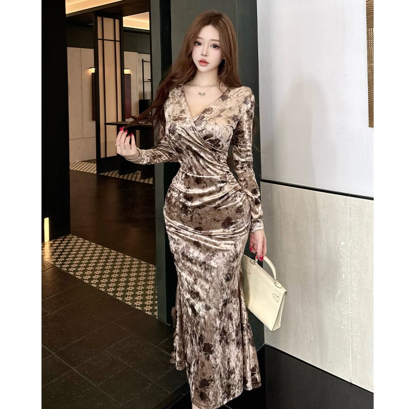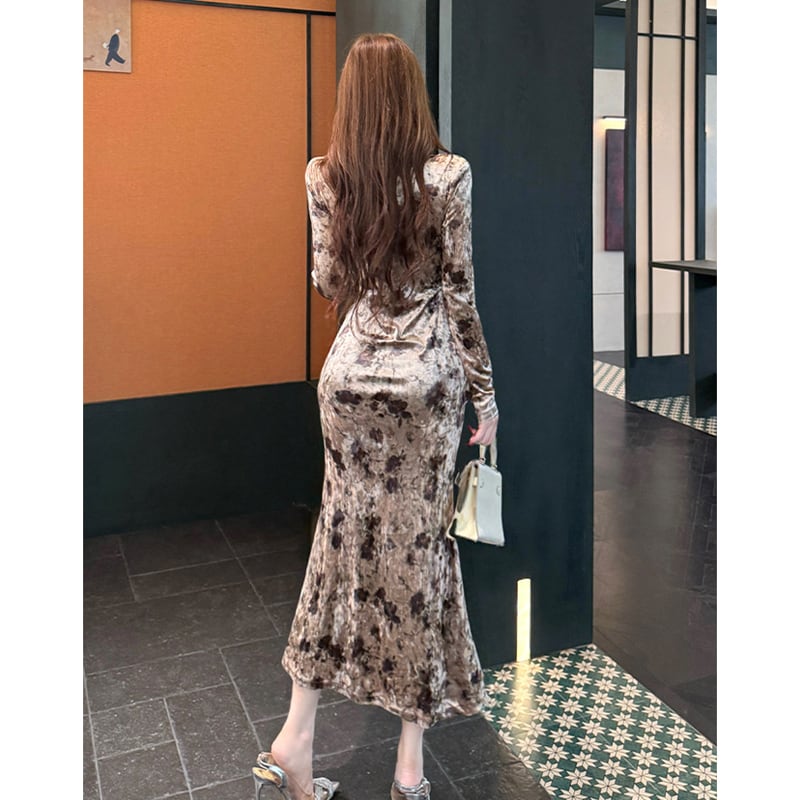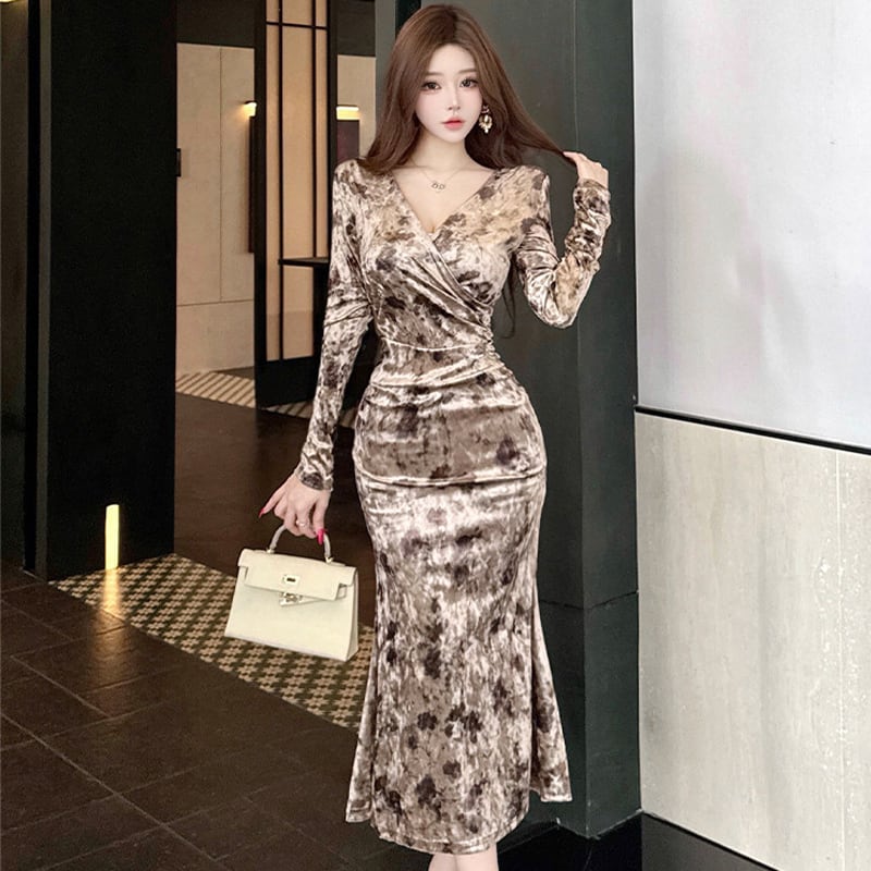 ワンピース ベルベット Vネック フェミニン プリント 長袖 S M L XL