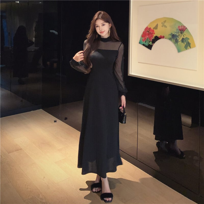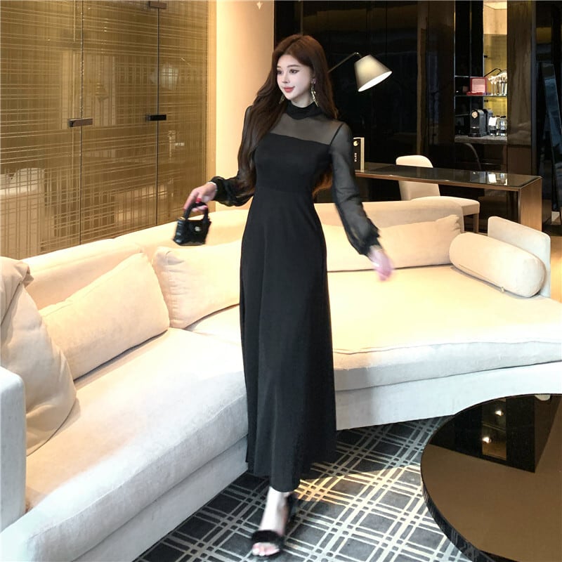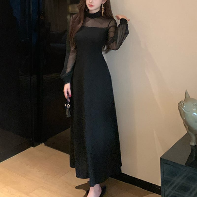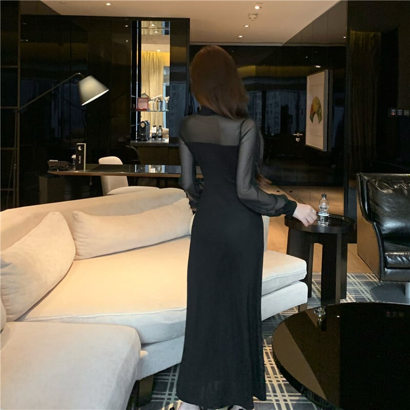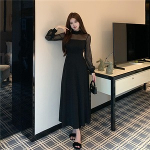 ワンピース 長袖 メッシュ 無地 レトロ 魅せられる ブラック S M L XL