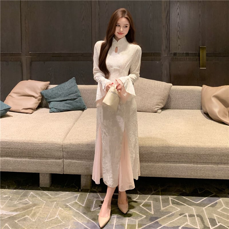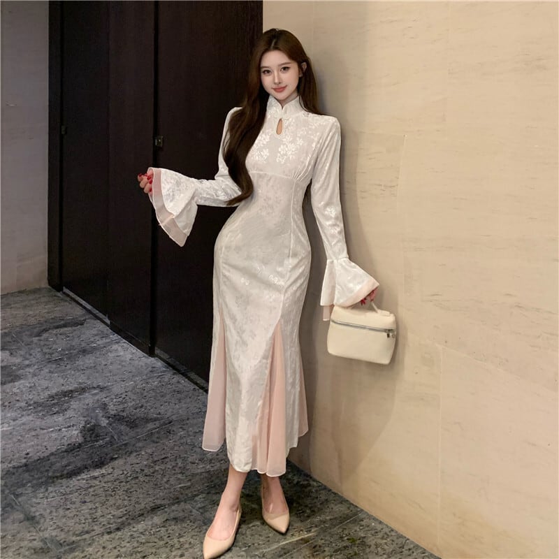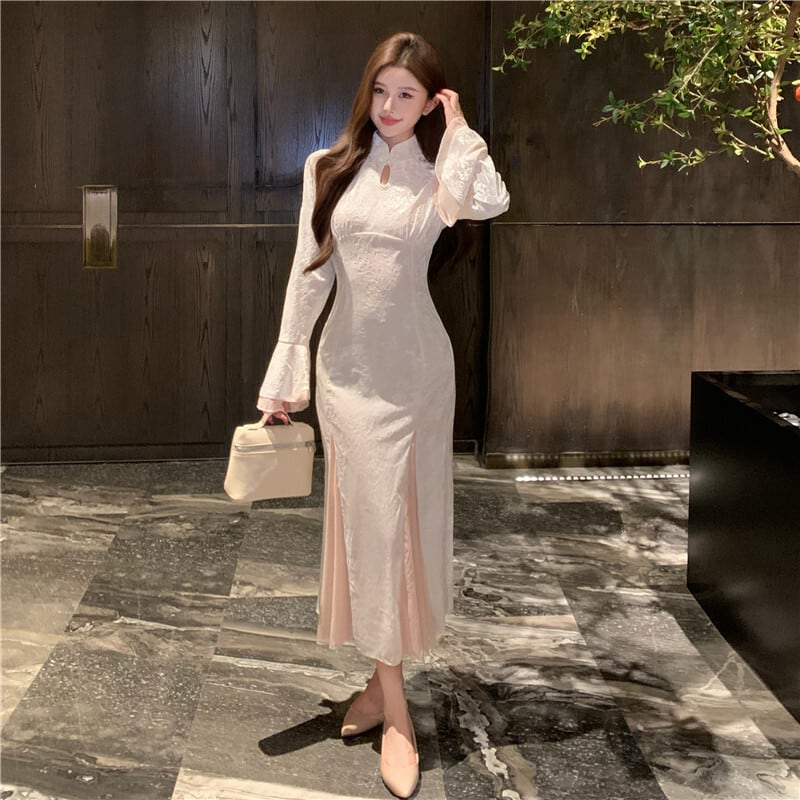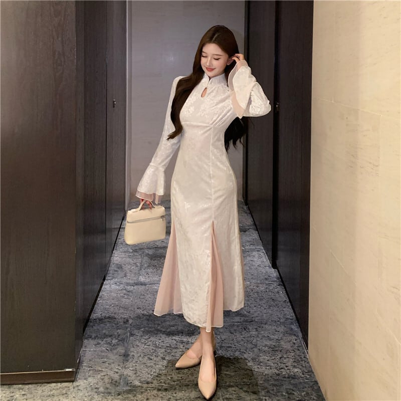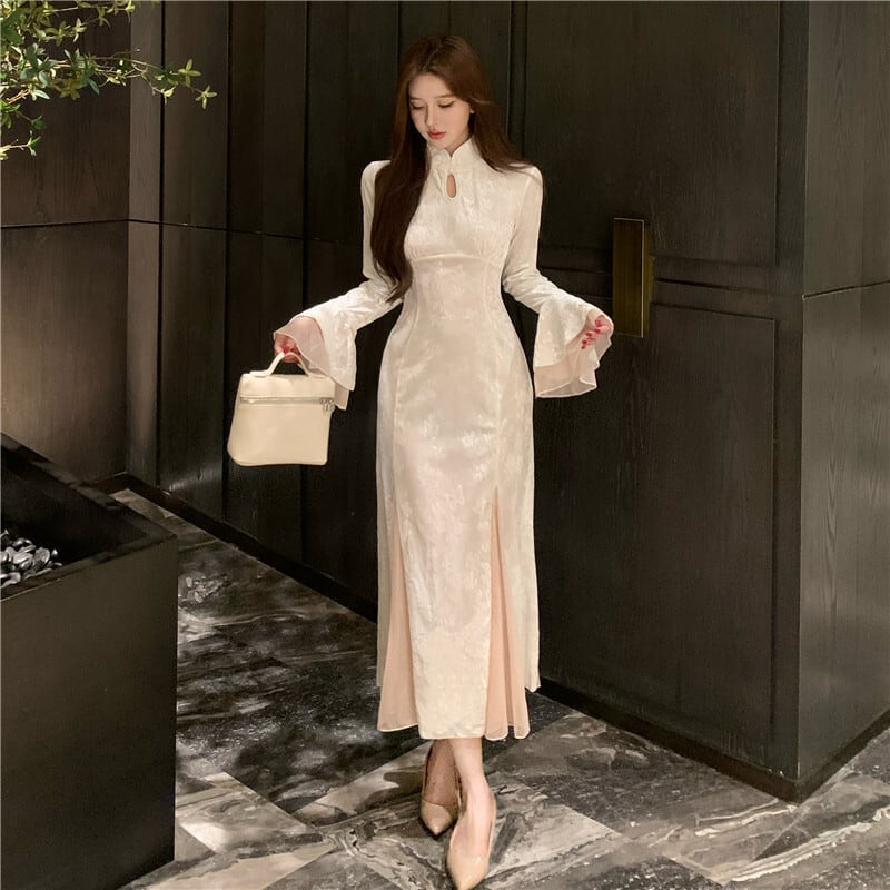 ワンピース ベルベット チャイナ風 スピーカースリーブ 綺麗め 長袖 S M L XL