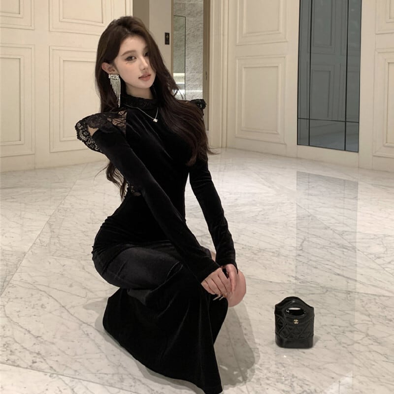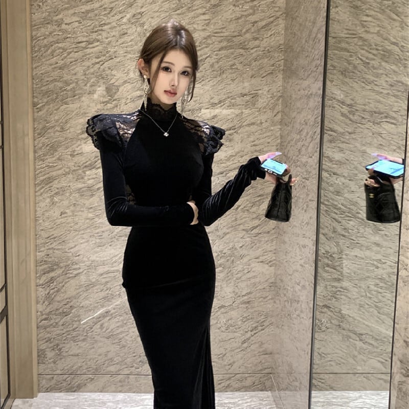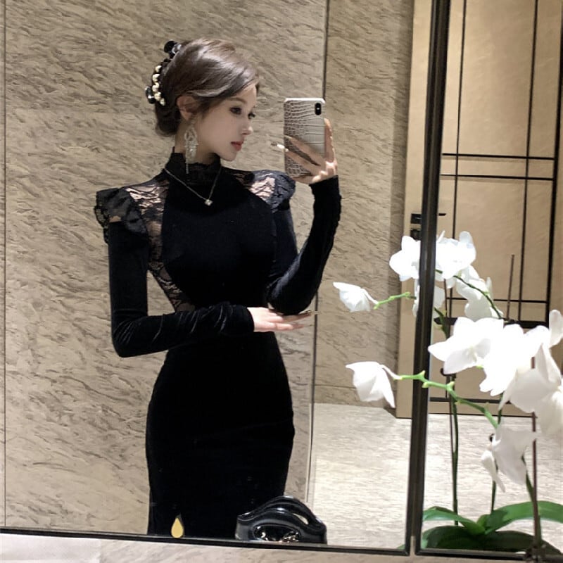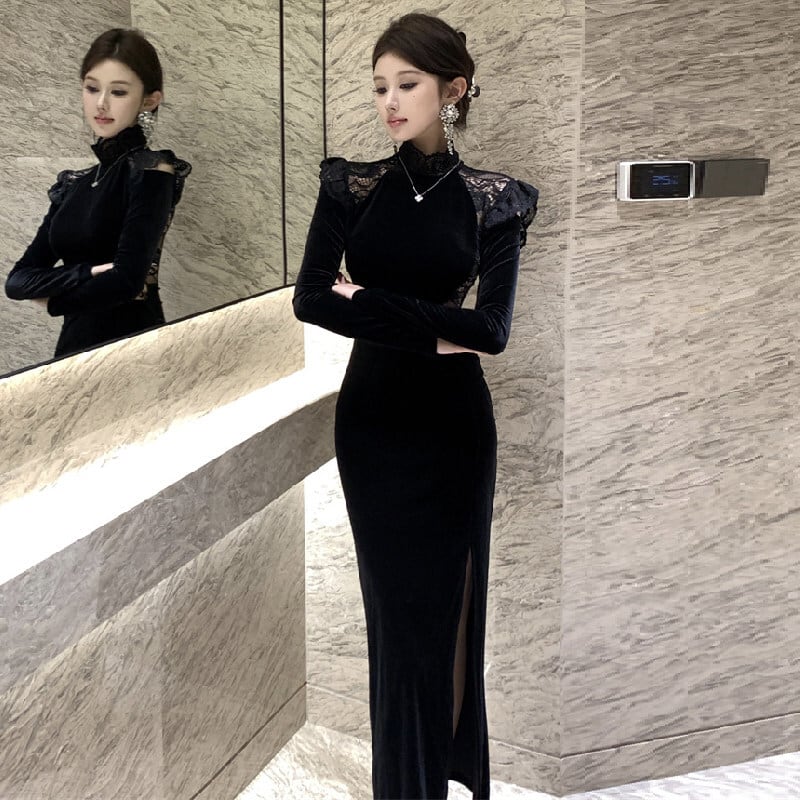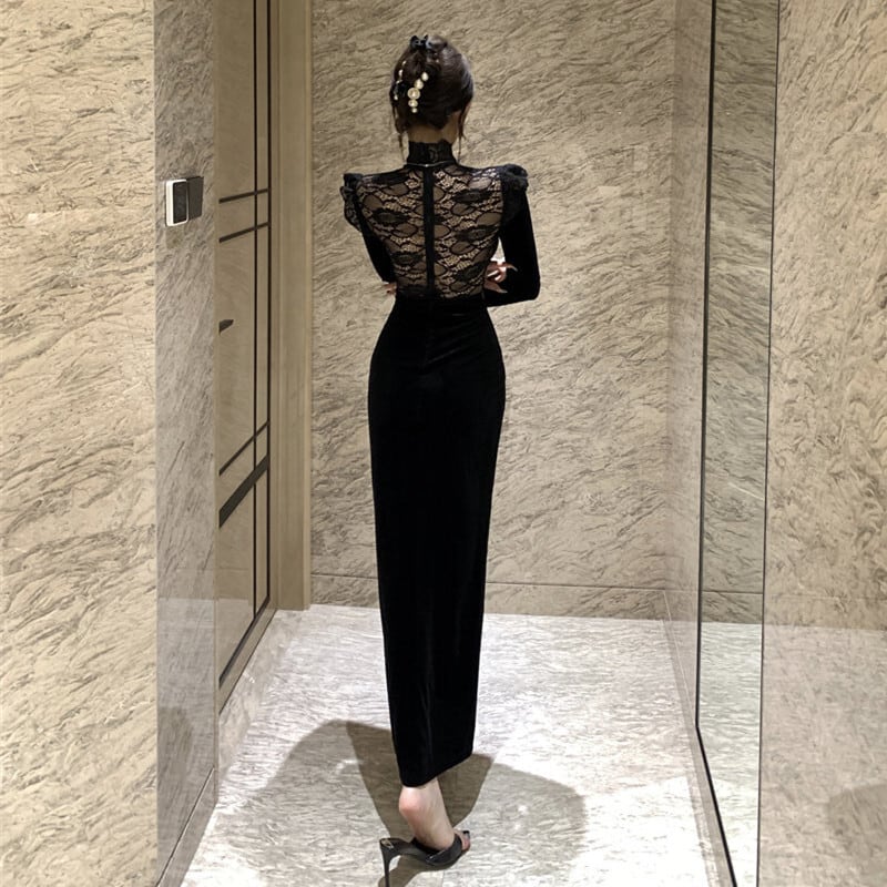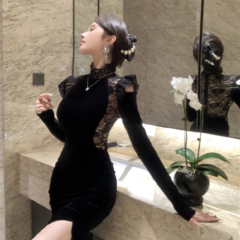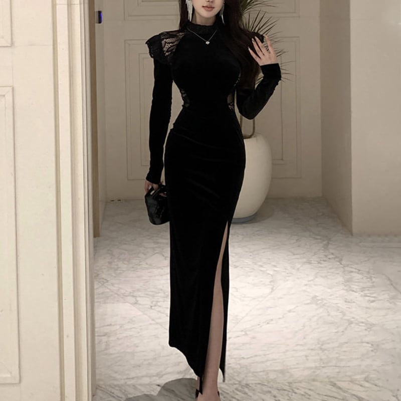 ワンピース ベルベット 長袖 スリット レース シルエット ブラック S M L