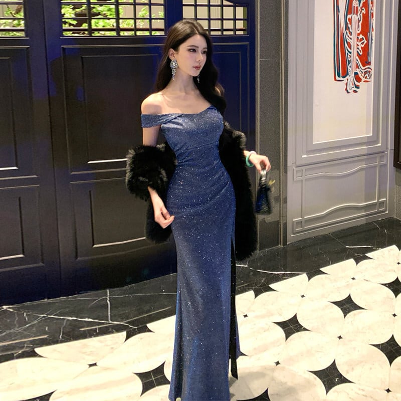 パーティードレス キラキラ 飲み会 オフショルダー スリット ブルー S M L