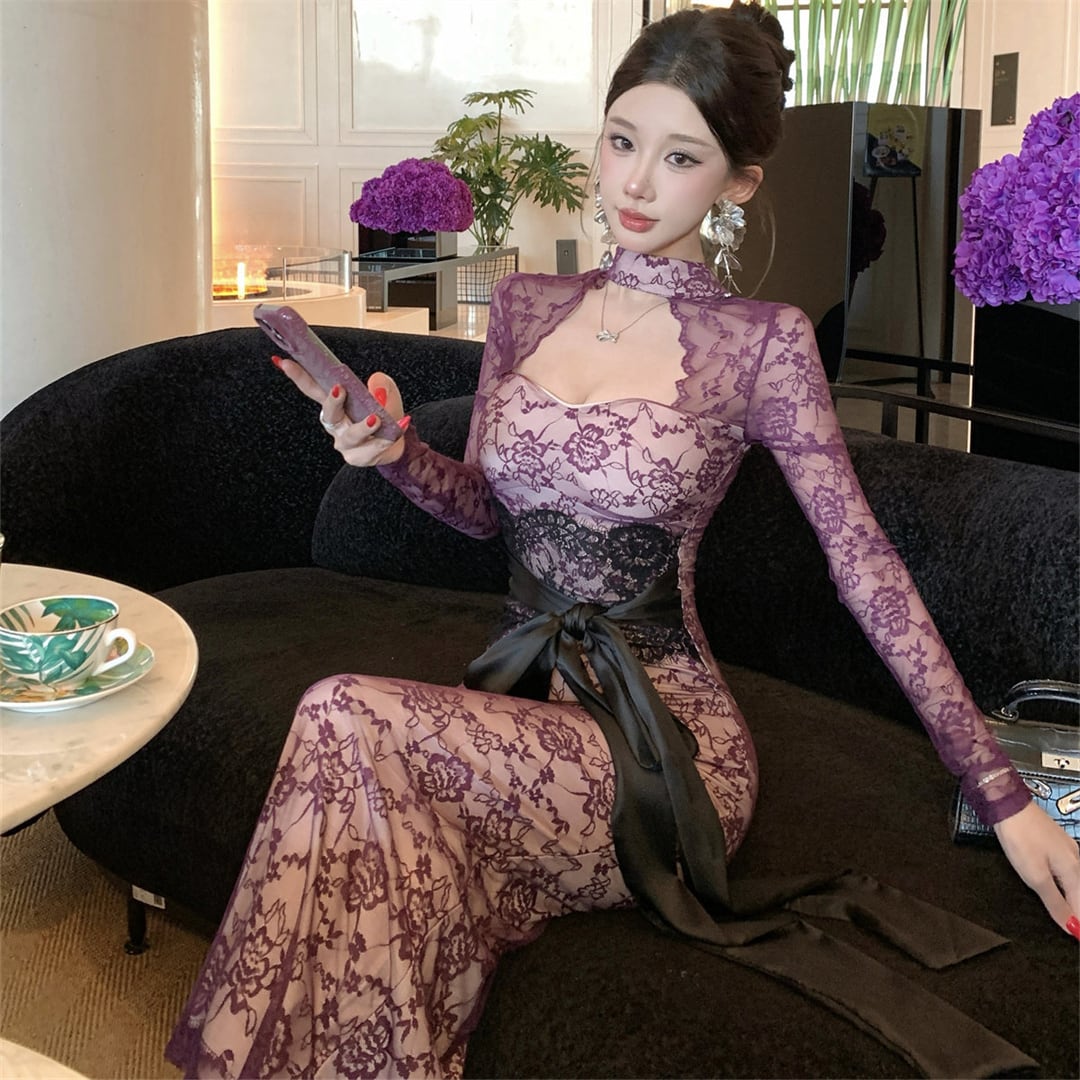 ワンピース レース 透かし彫り 魅せる 切り替え パープル アプリコット S M L