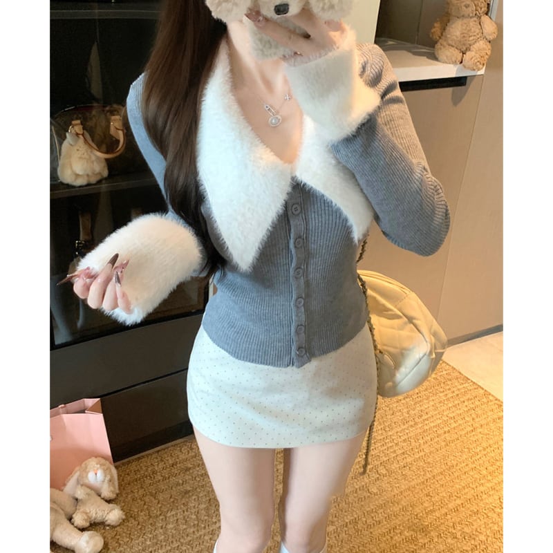 3colors トップス ニット 折り襟デザイン ウエストイン キャラメル色 グレー ピンク