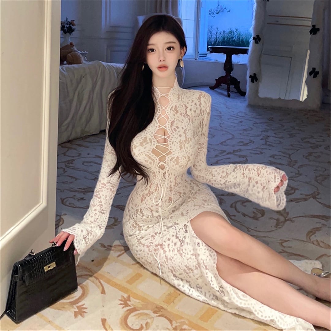 ワンピース レース スリムフィット 透かし彫り 魅せる スリット ホワイト S M L