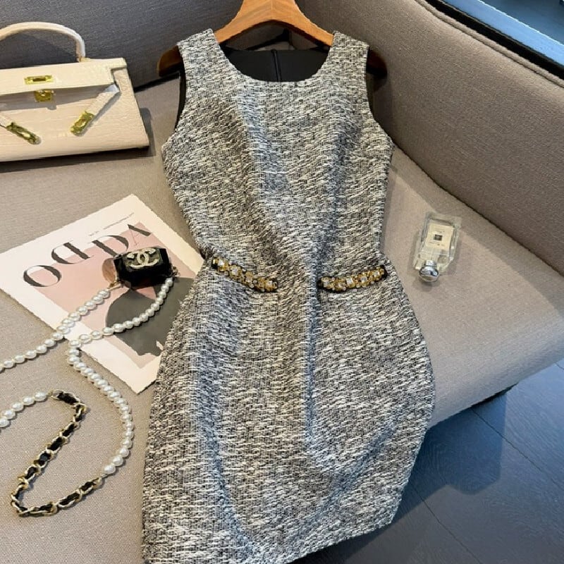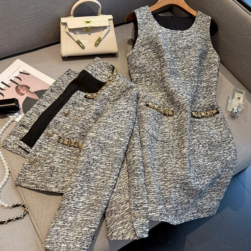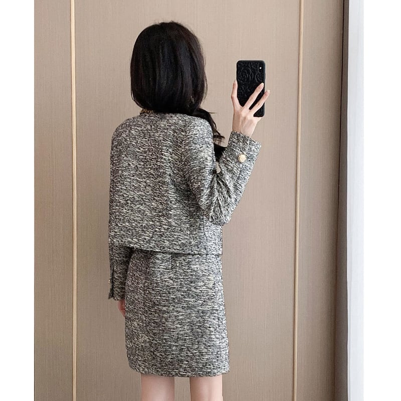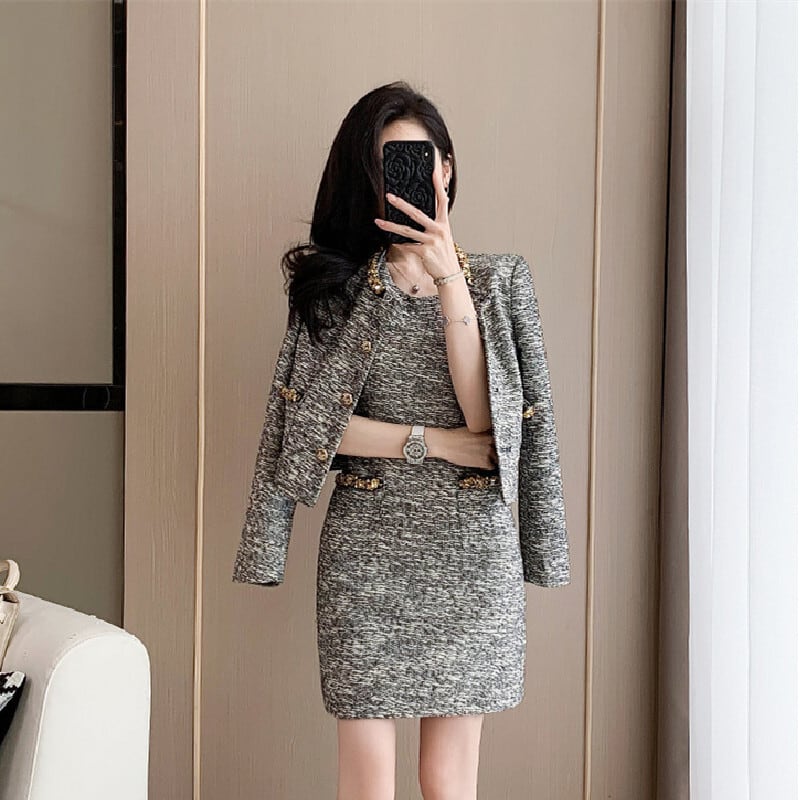 セットアップ ツイード スパンコール ジャケット +ノースリーブ ワンピース グレー S M L XL
