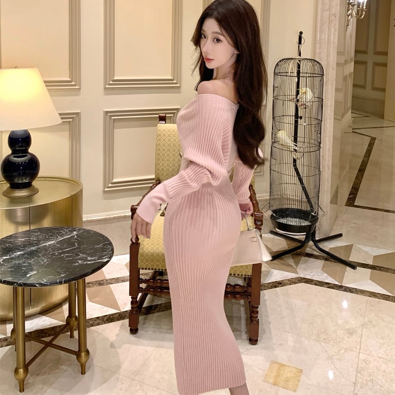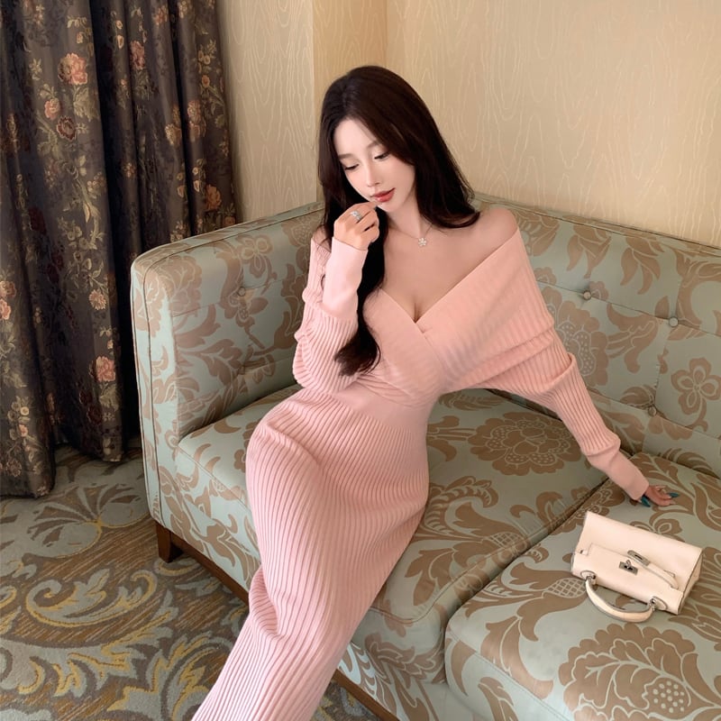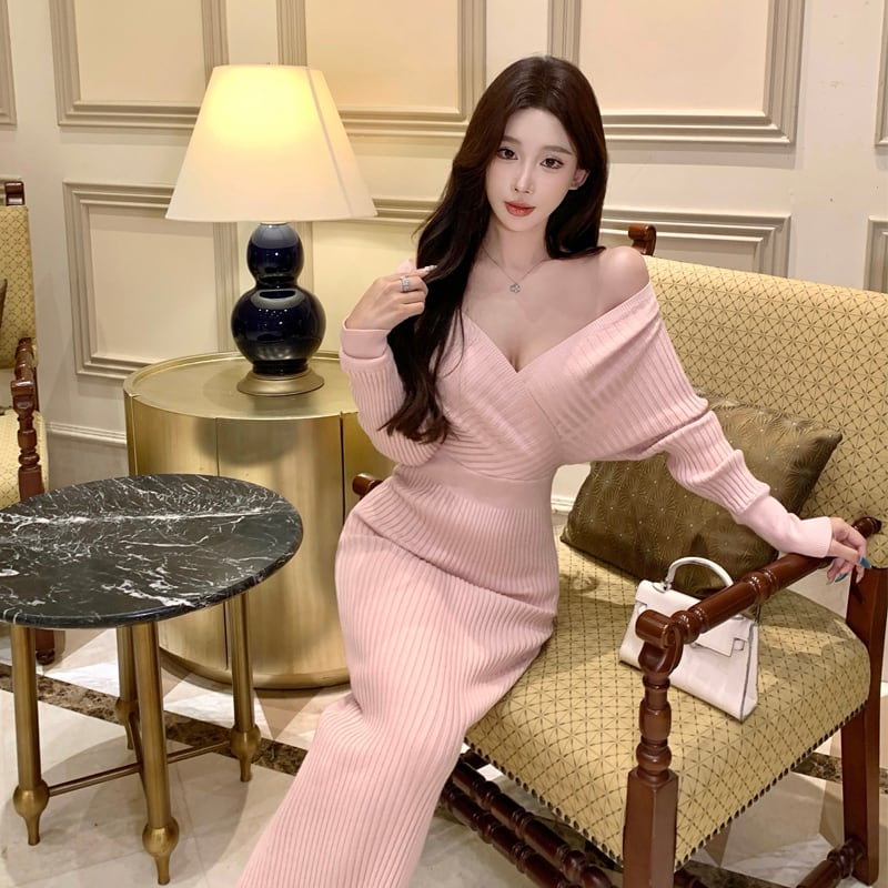 ニットワンピース バックレス Vネック 美人度アップ ピンク S M
