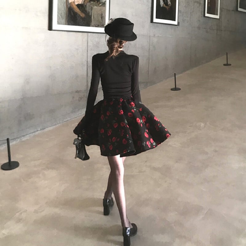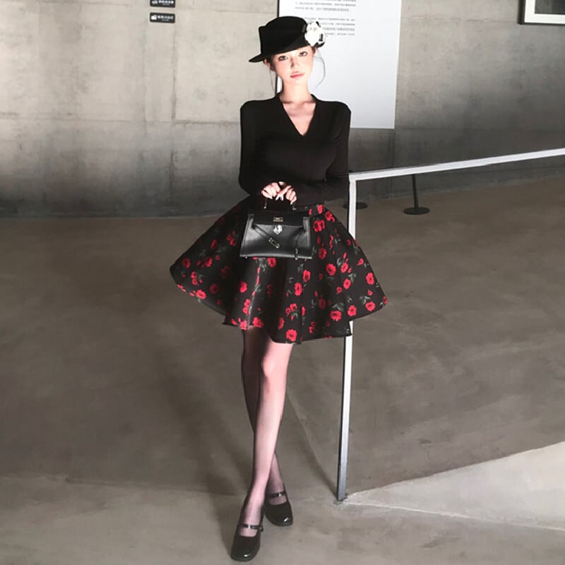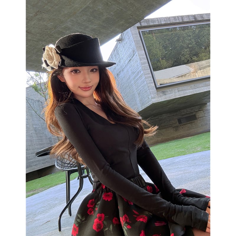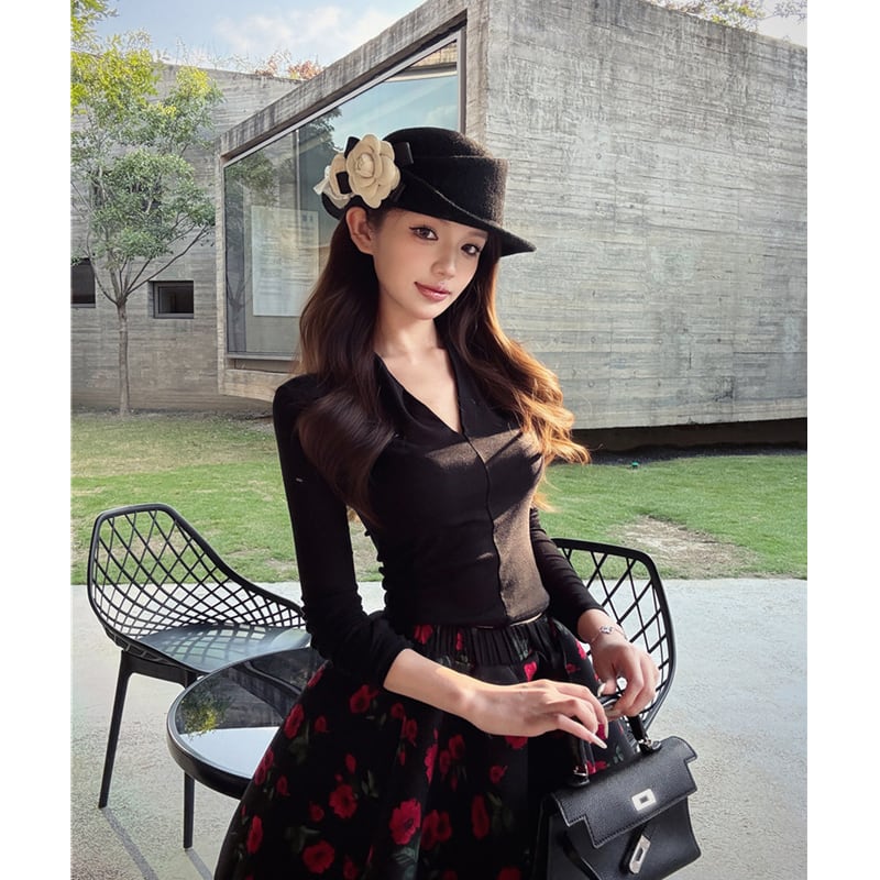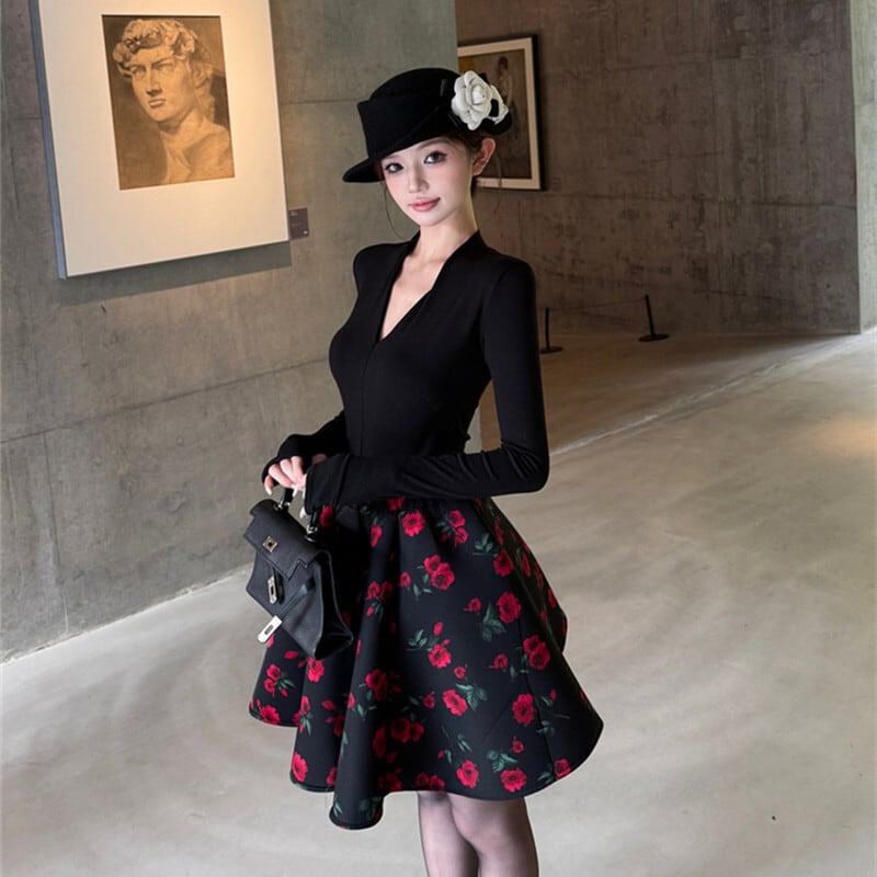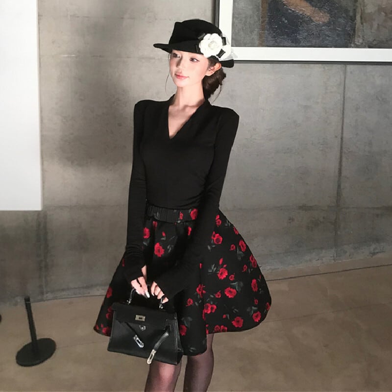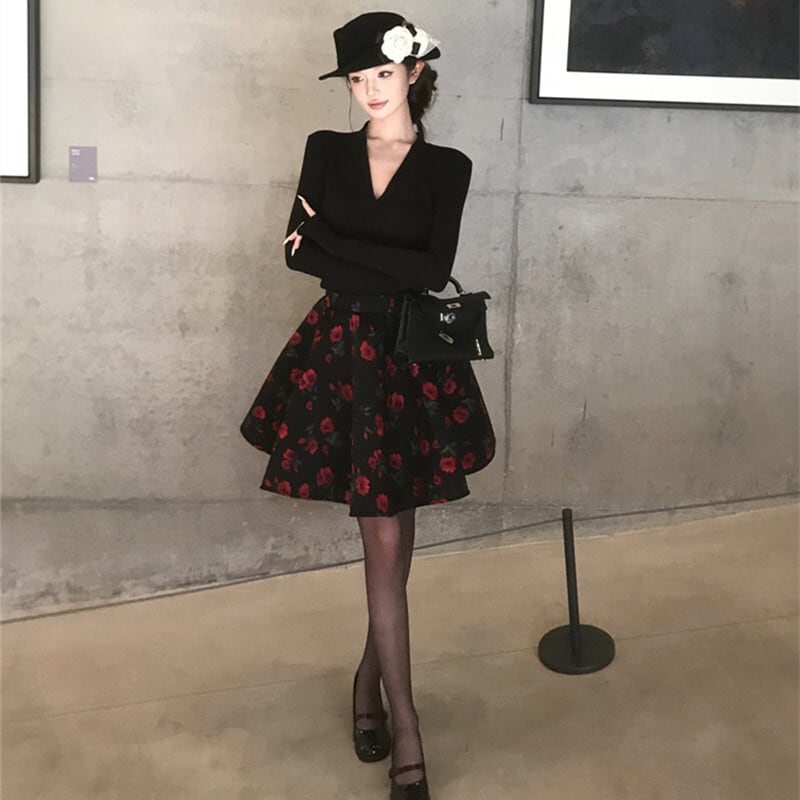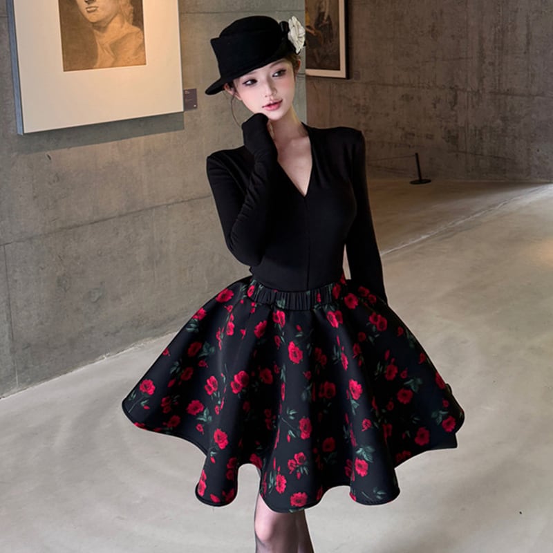 2点セット Vネック 黒い トップス×ローズプリントボリュームフレアスカート