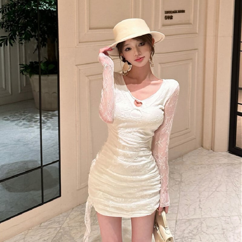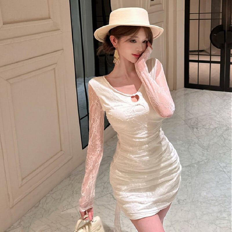 ワンピース レース シルエット リボン ミニ丈 ライトベージュ S M L