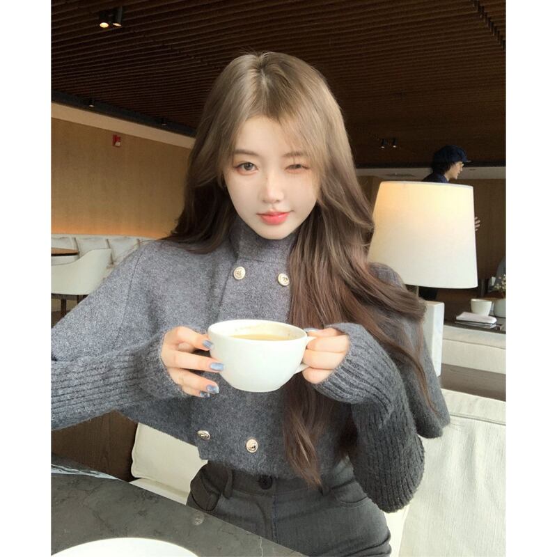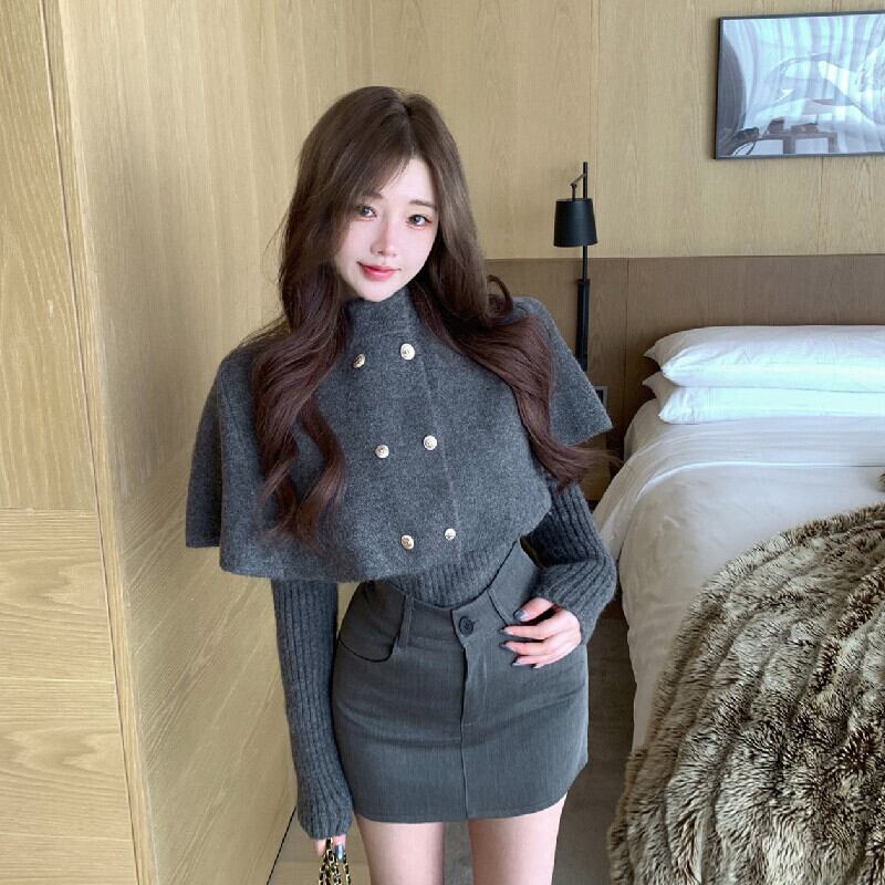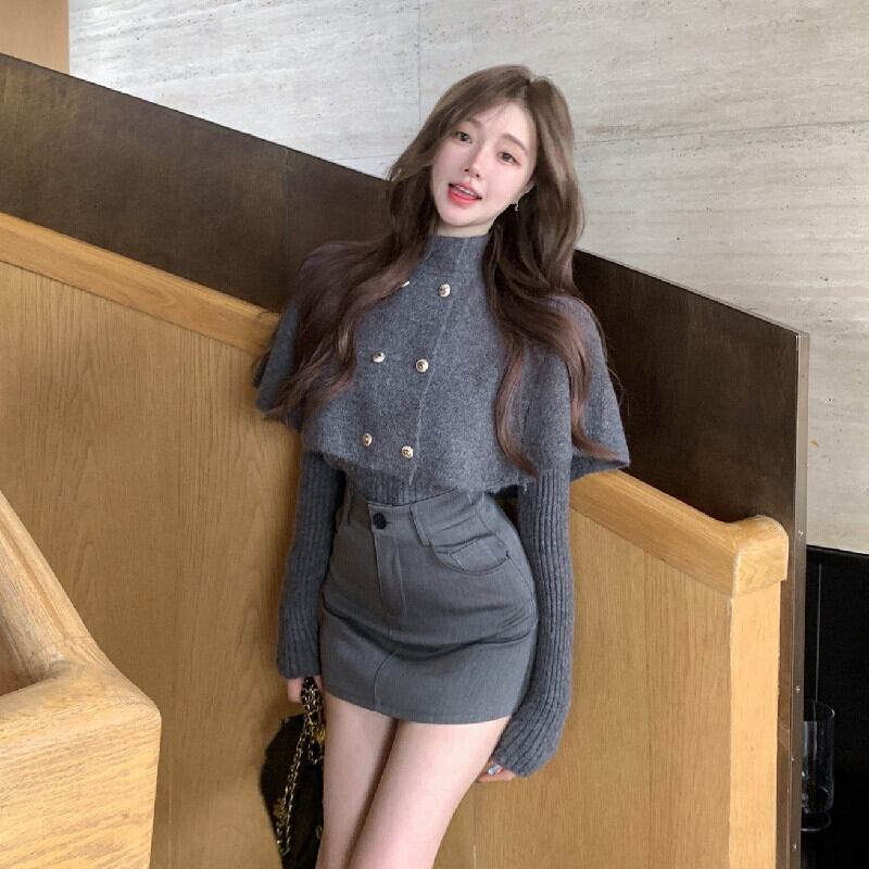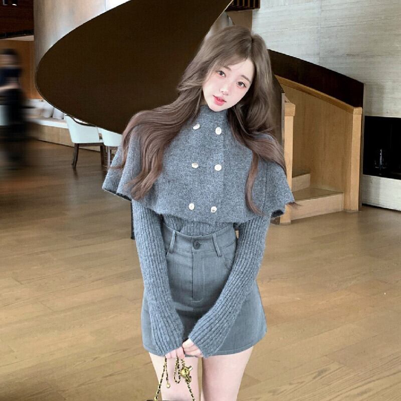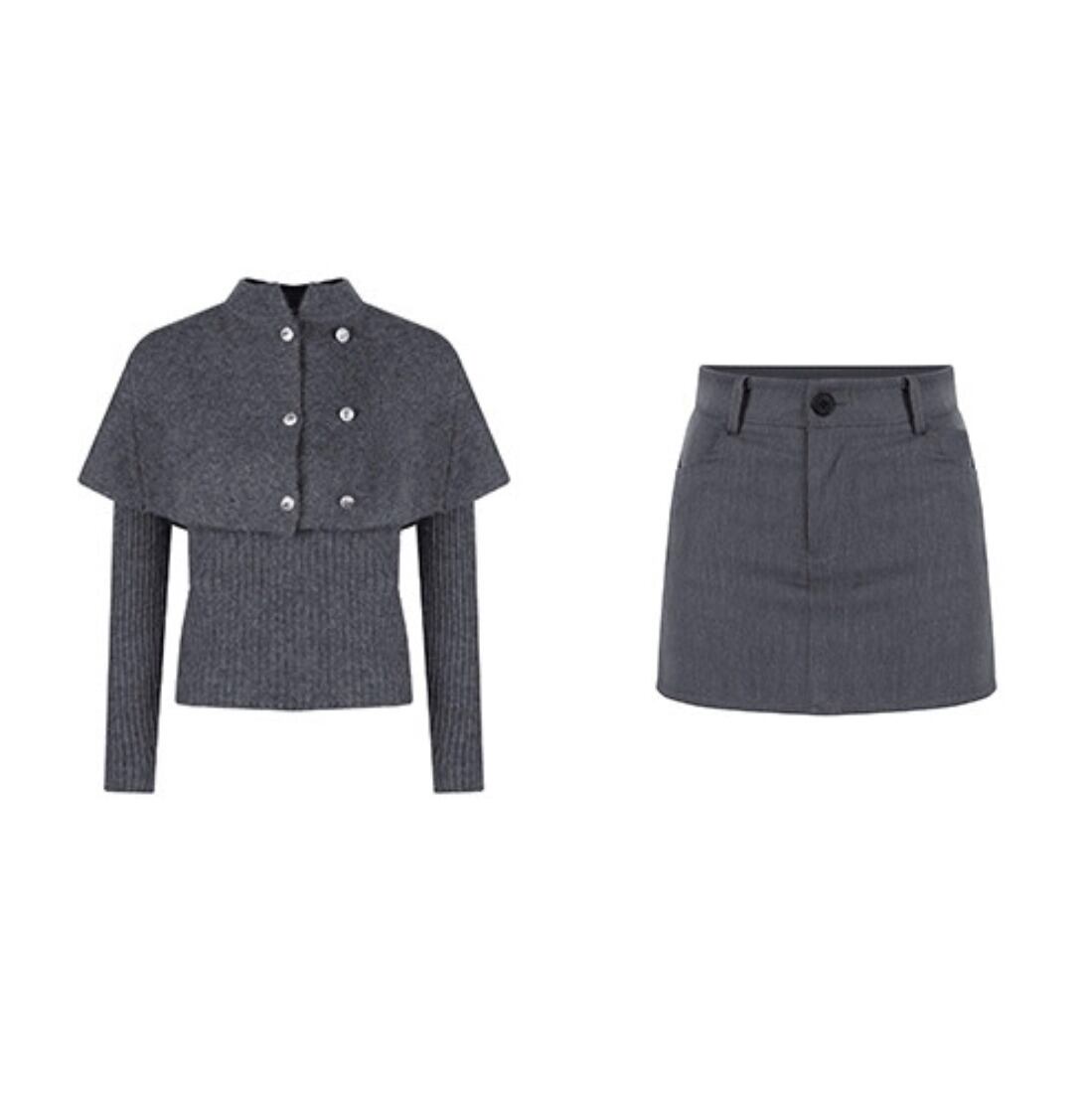 セットアップ ケープ付きトップス+スカート 気質溢れる グレー S M L