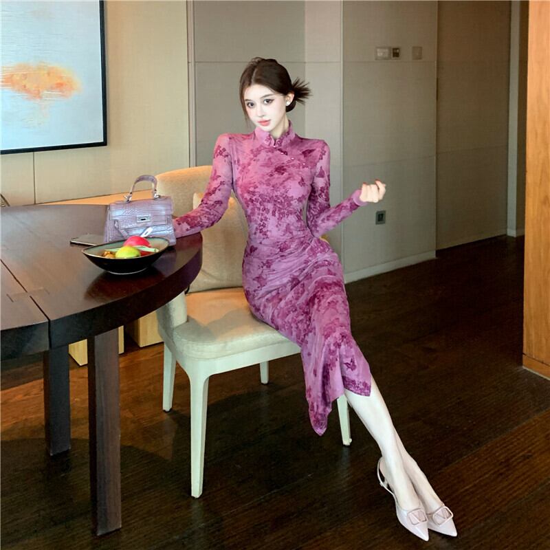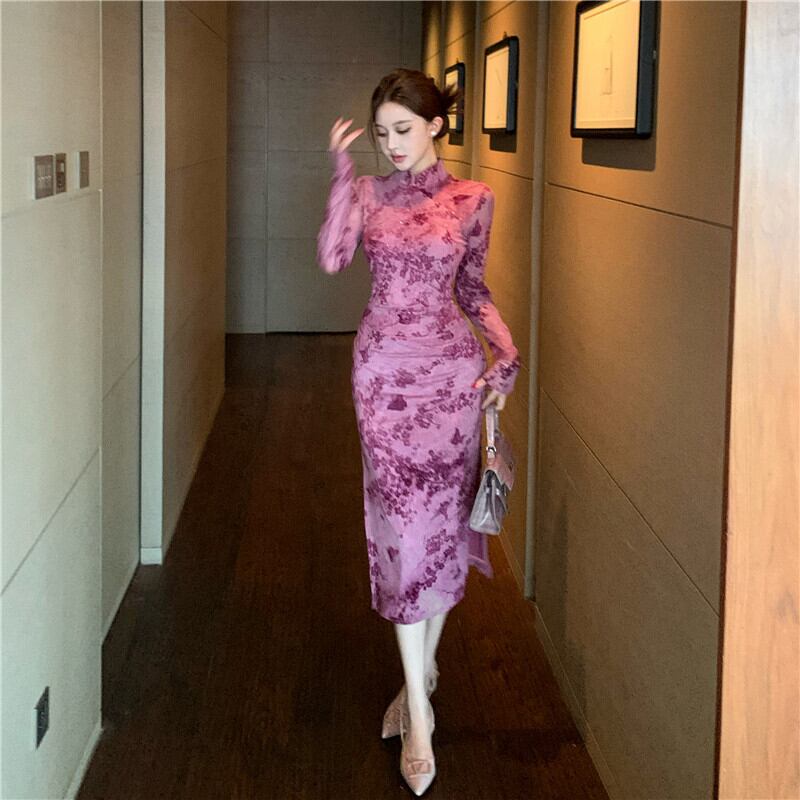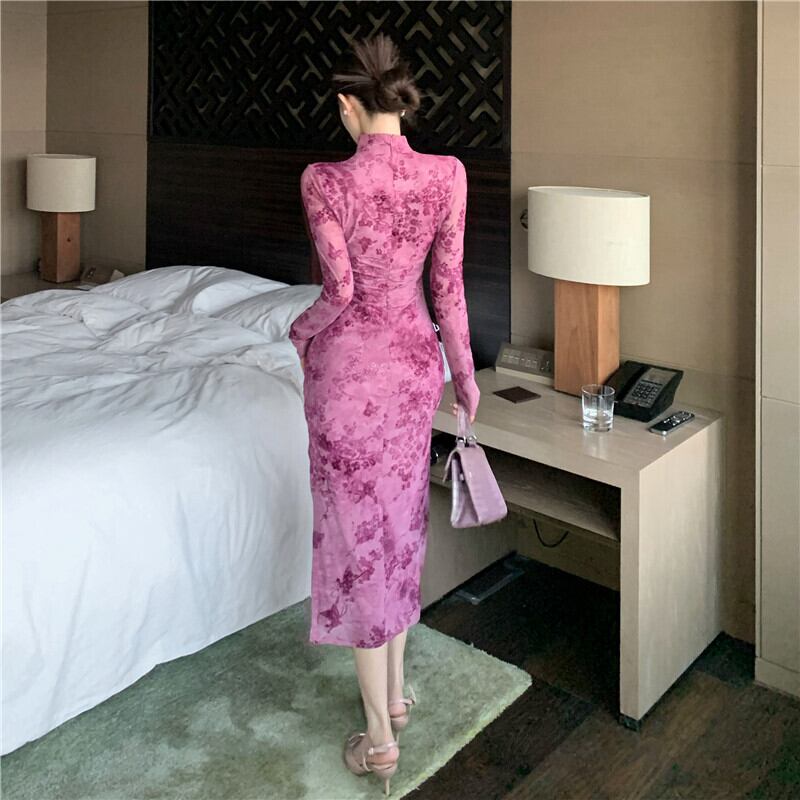 ワンピース チャイナ風 花柄 魅せられる 長袖 パープル S M L XL