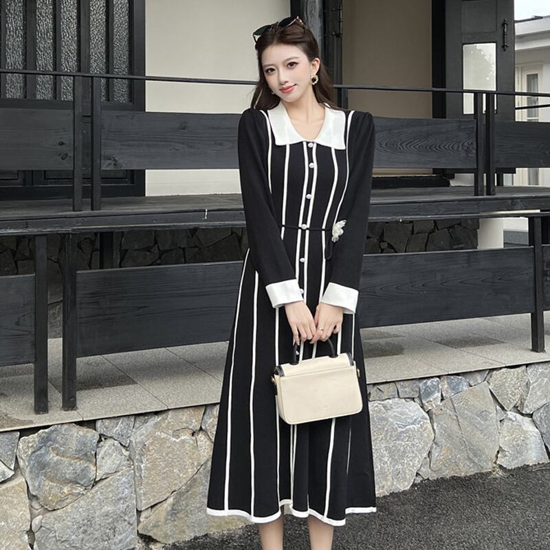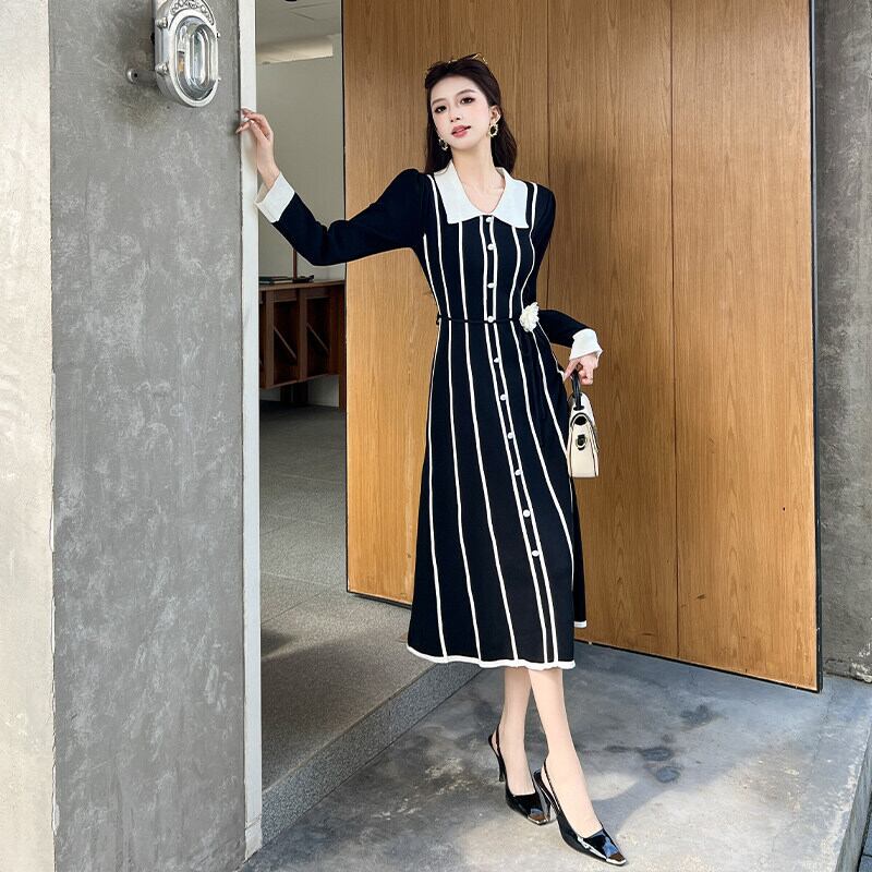 【CHERRYシリーズ】ワンピース ニット POLOネック ストライプ柄 レトロ 配色 ブラック