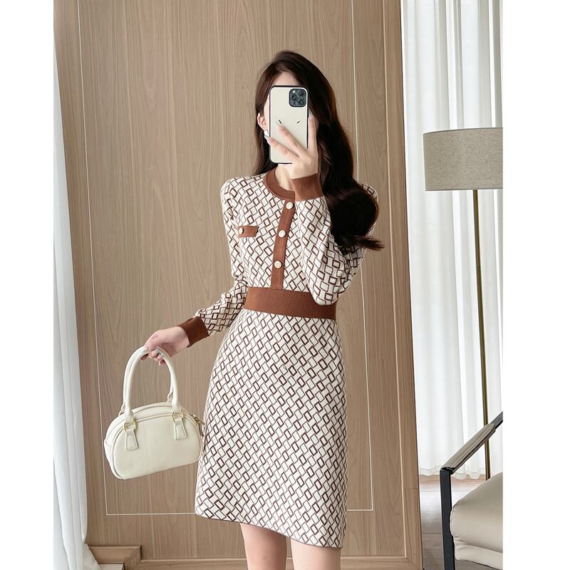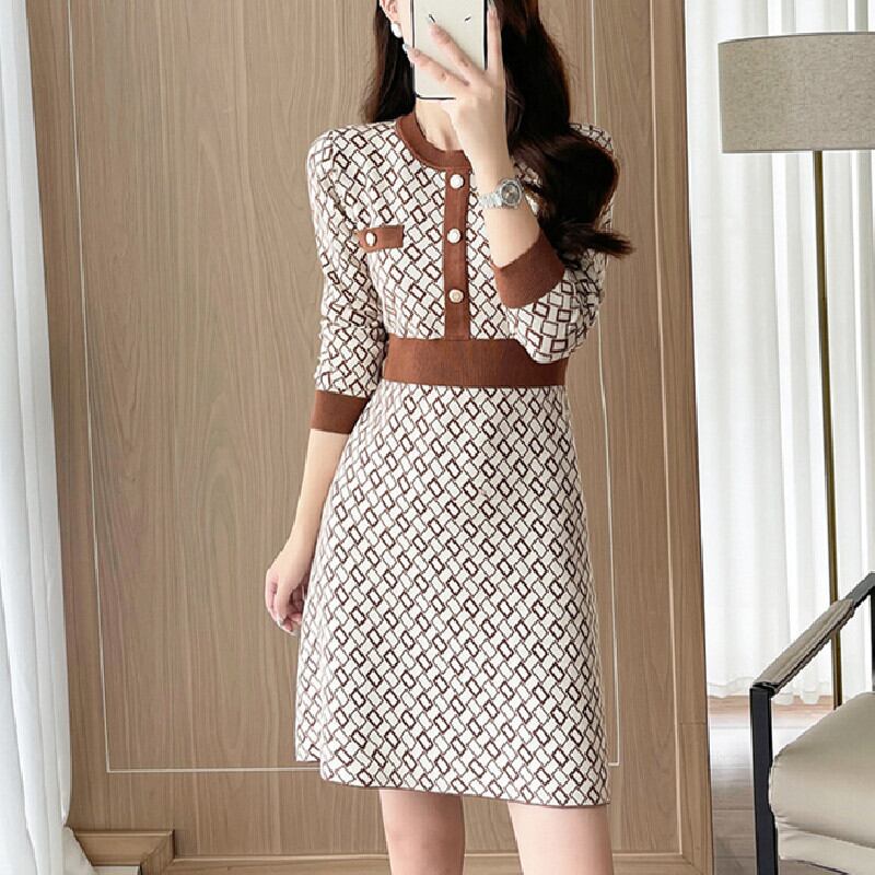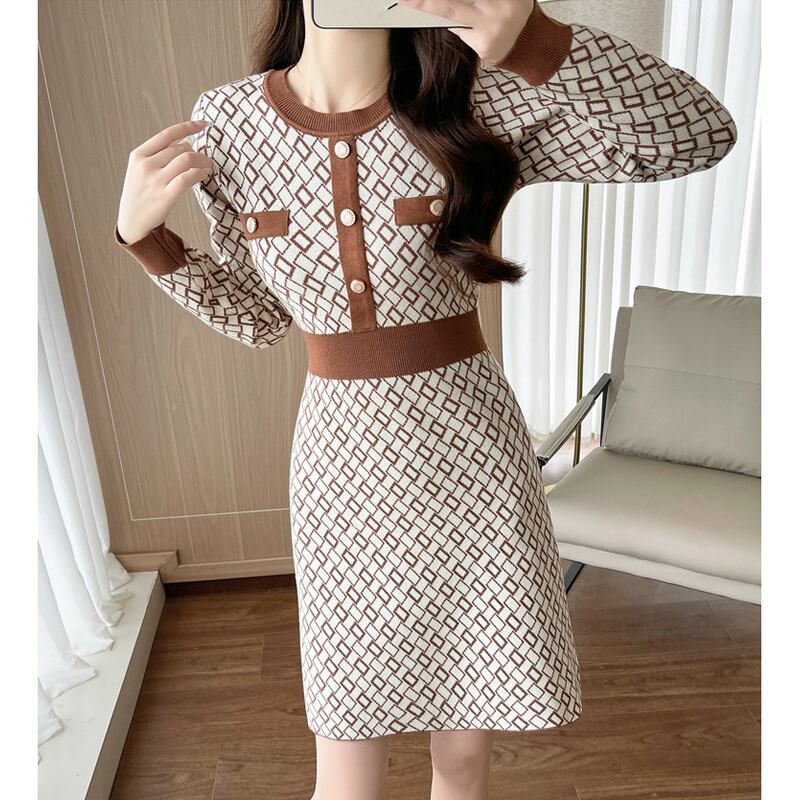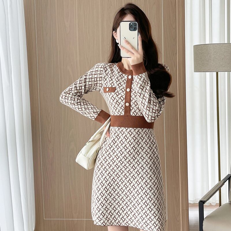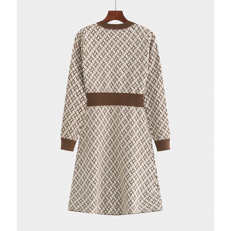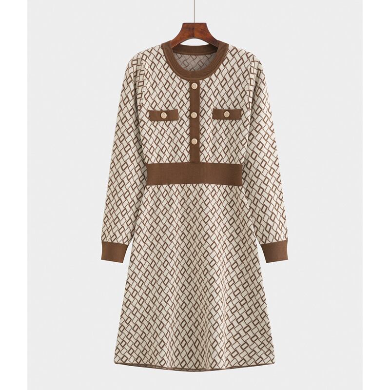 ワンピース ニット ラウンドネック ハイウエスト チェック柄 S M L XL