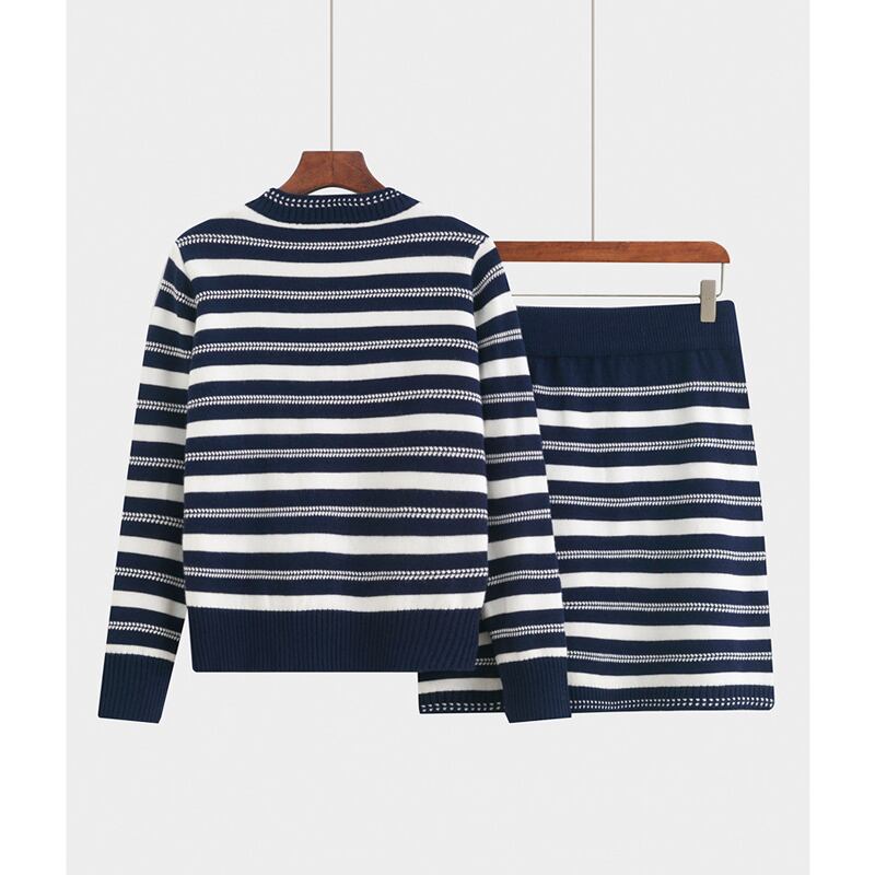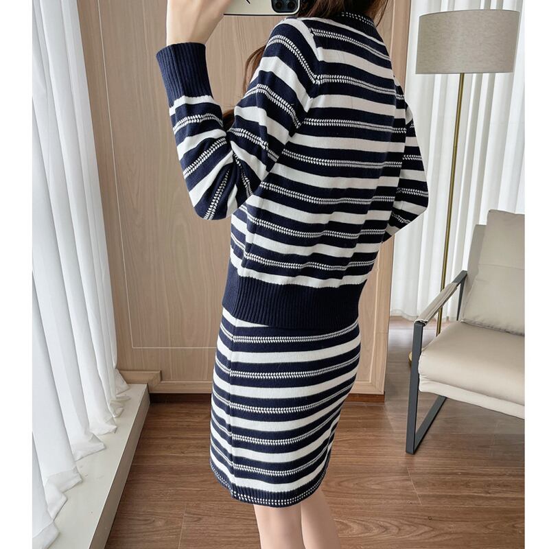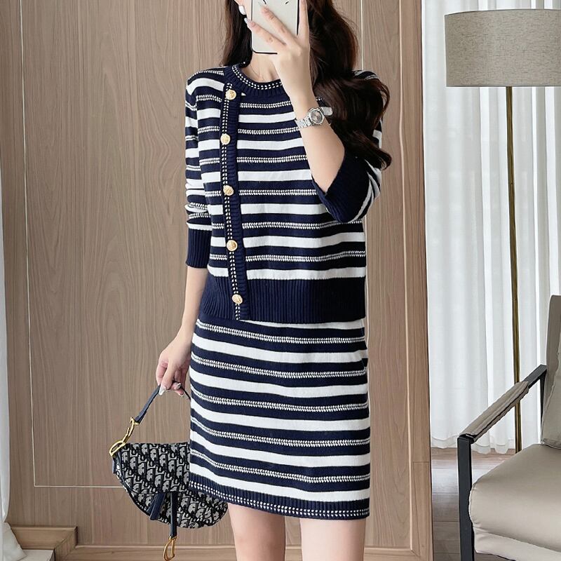 セットアップ ニット トップス+スカート ストライプ柄 配色 長袖 ダークブルー S M L XL