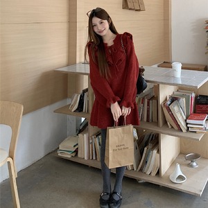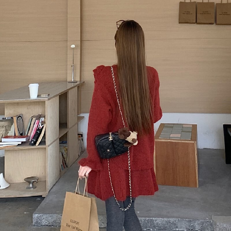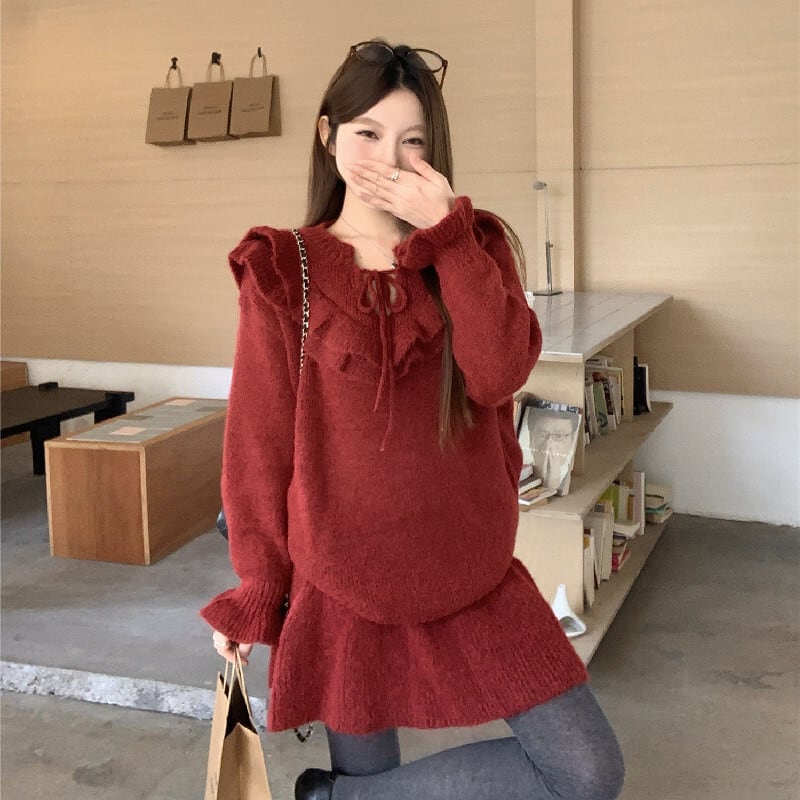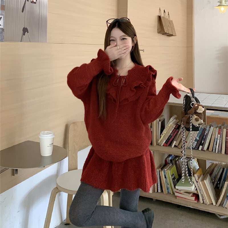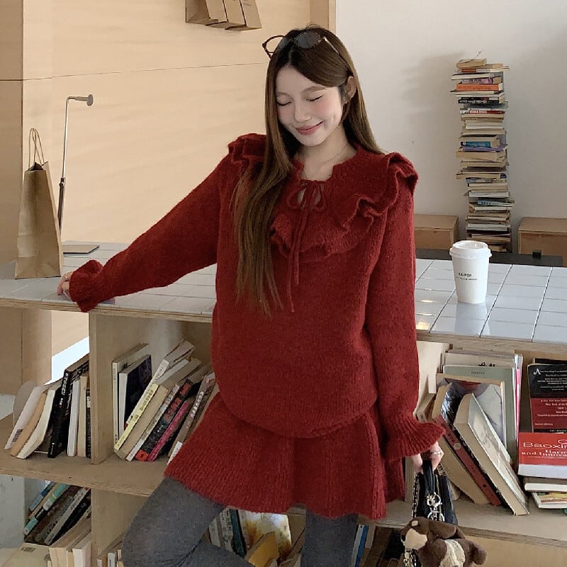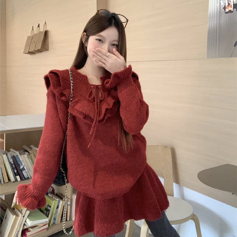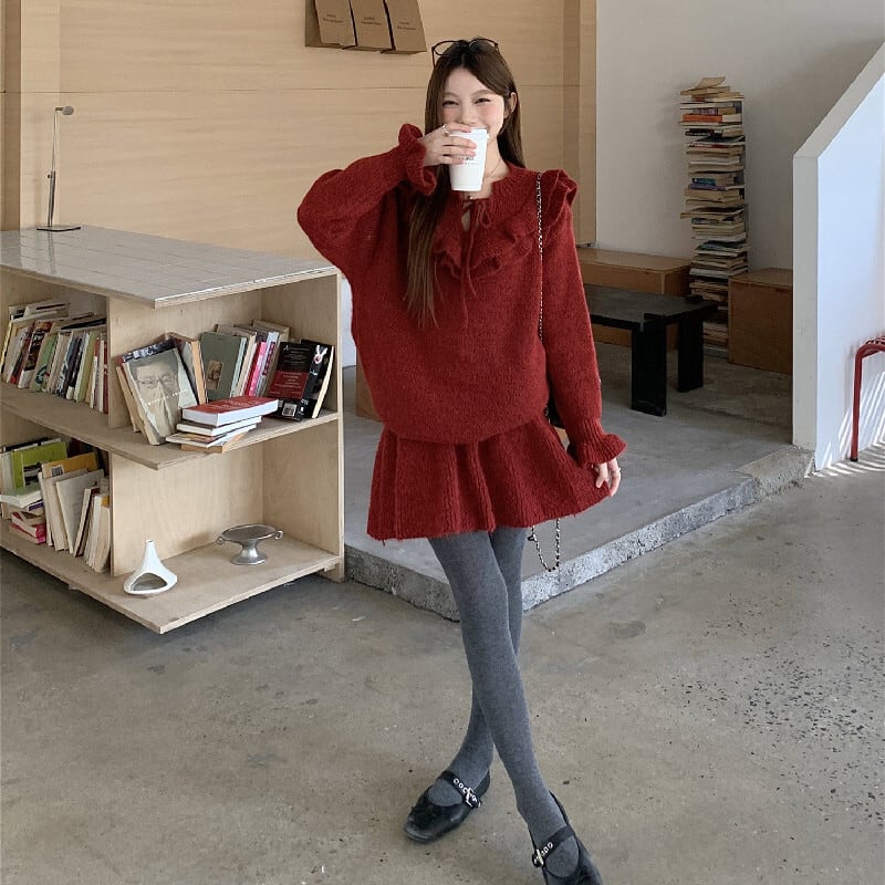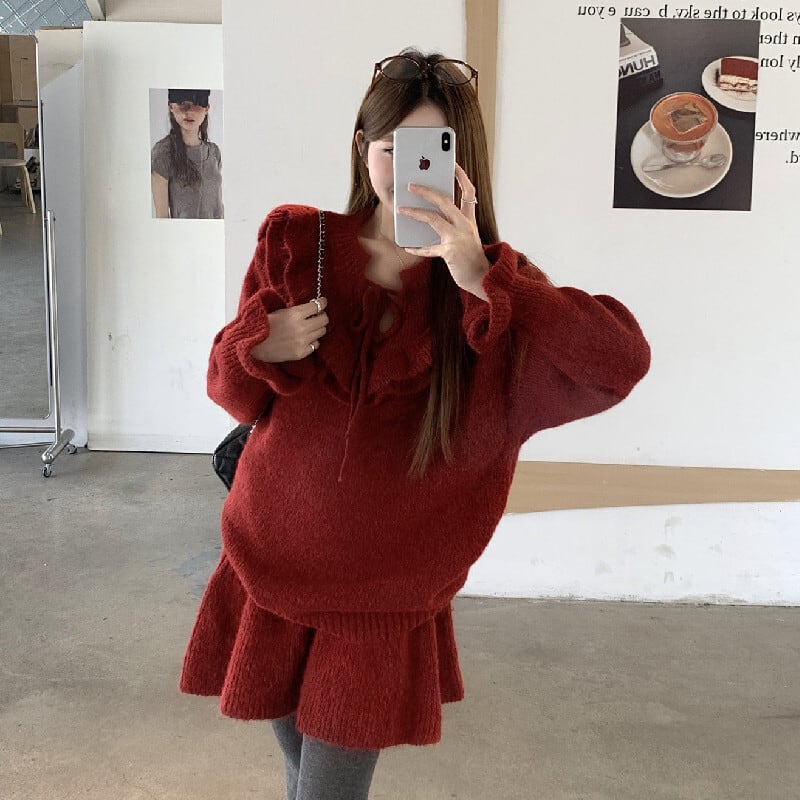 セットアップ ニット ペプラム トップス+ハイウエスト スカート レッド