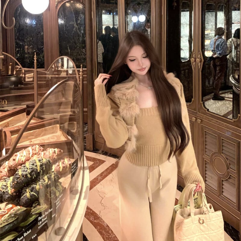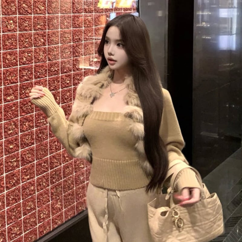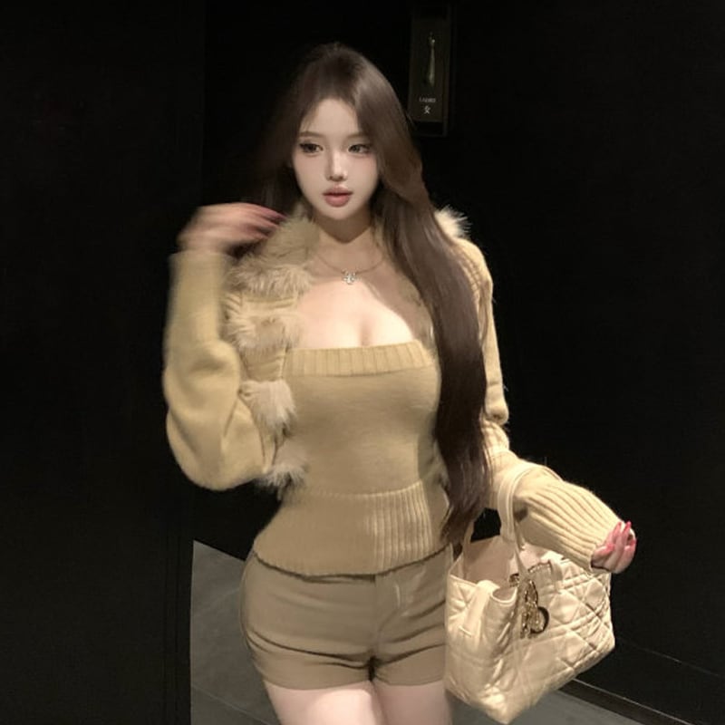 2点セット ニット ファー飾りカーディガン+チューブトップ S M L
