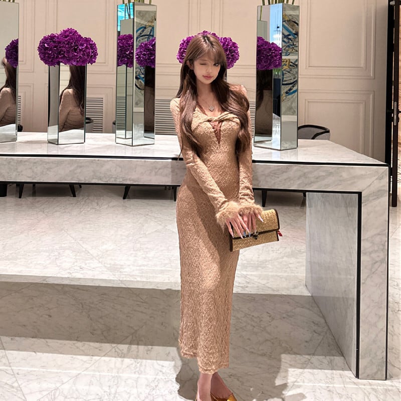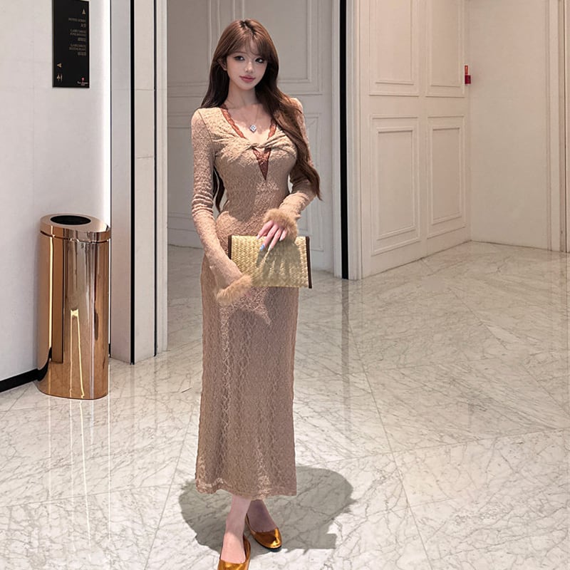 ロングワンピース レース シルエット Vネック 魅せられる ブラウン S M L