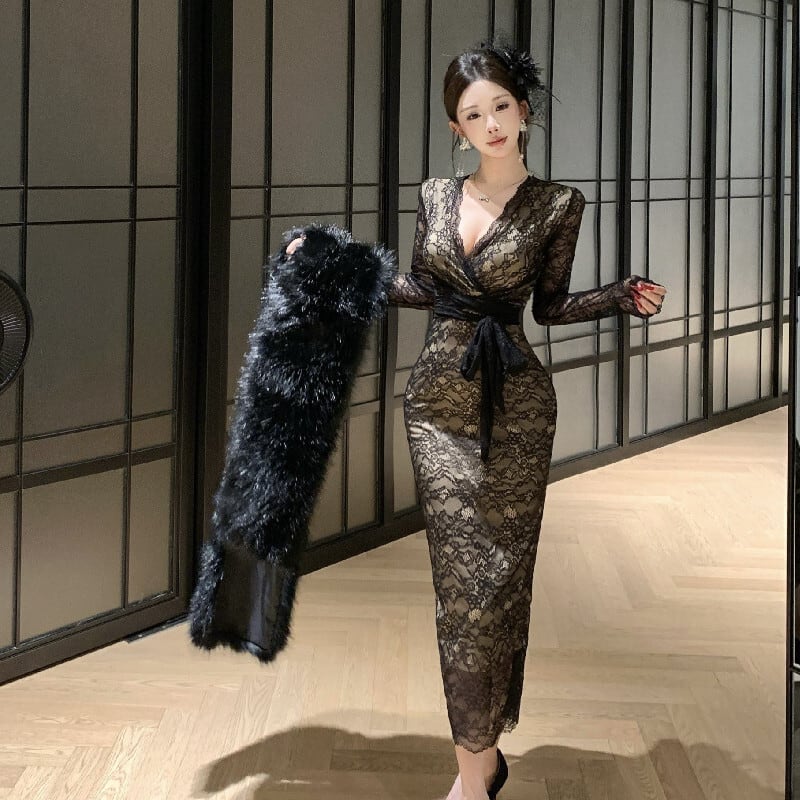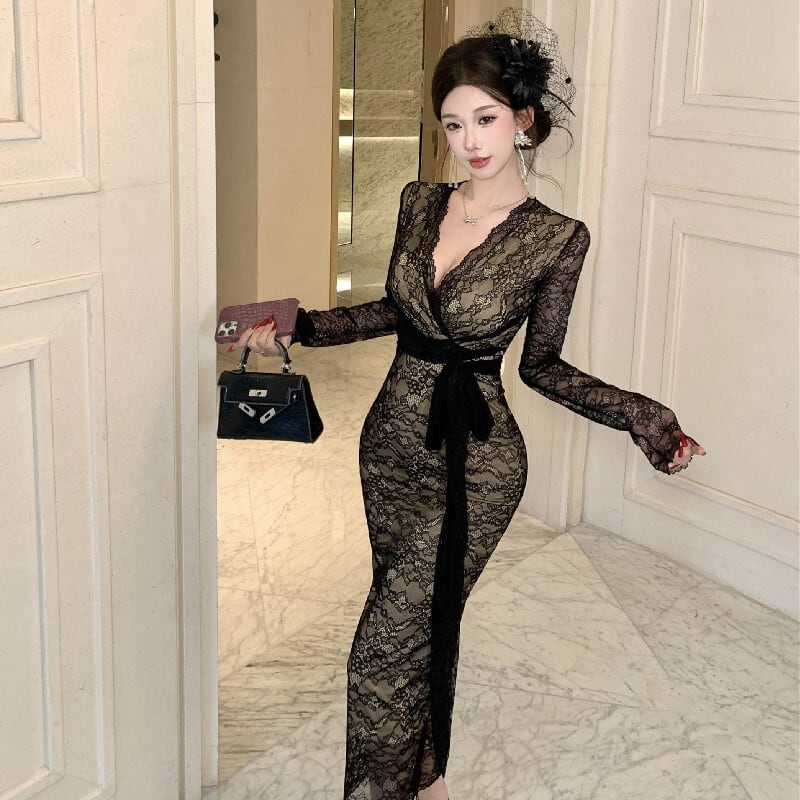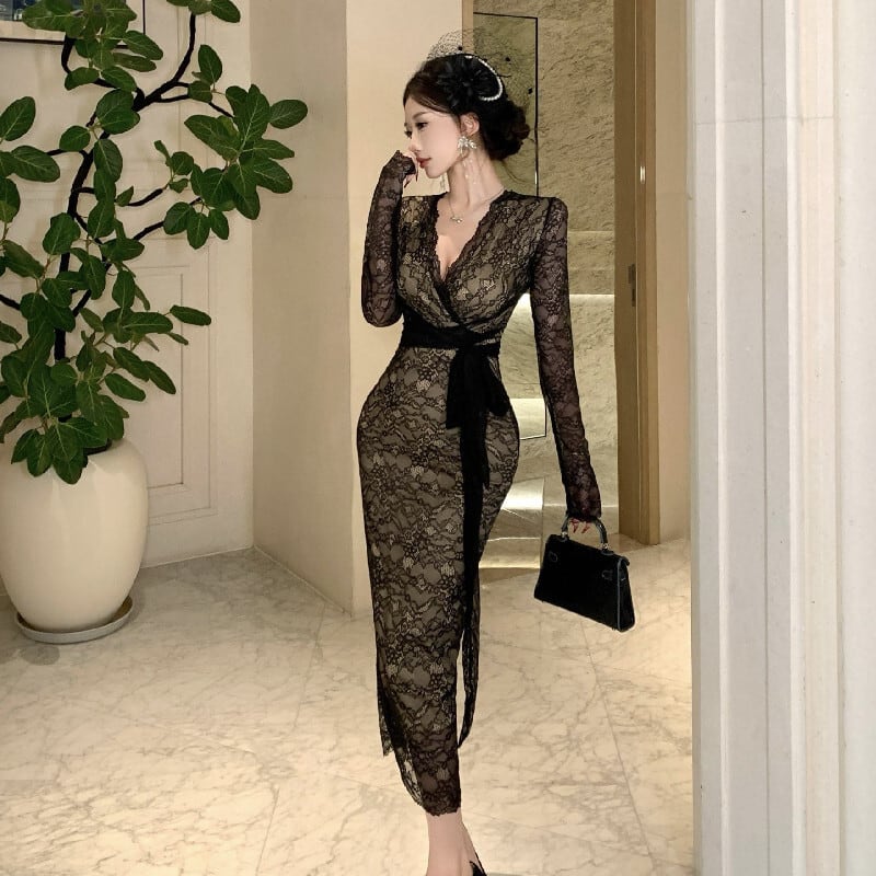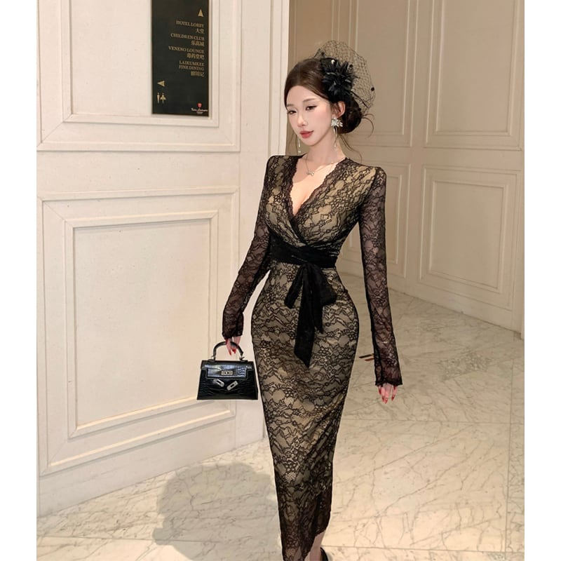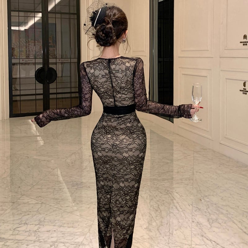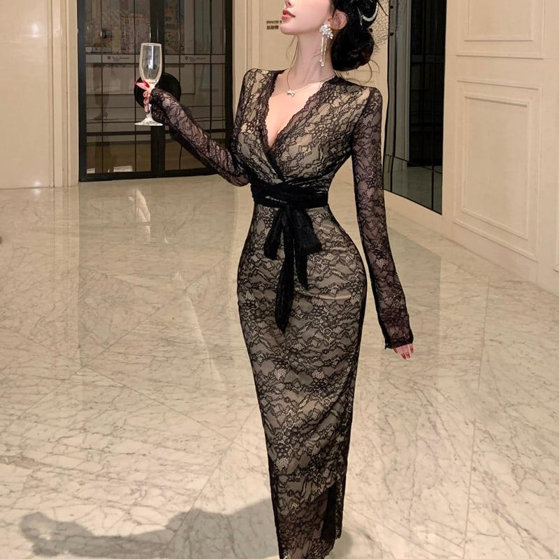 ワンピース レース Vネック フィットウエスト 綺麗め ブラック S M L