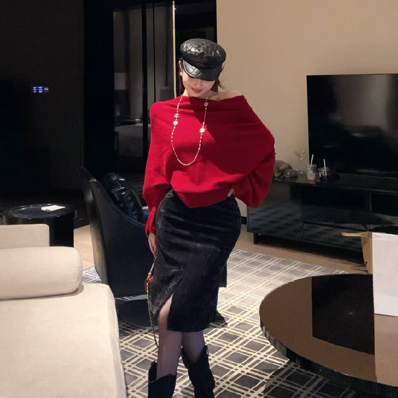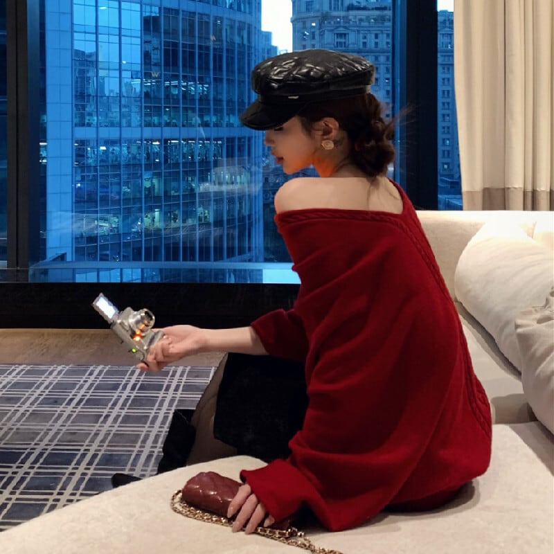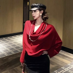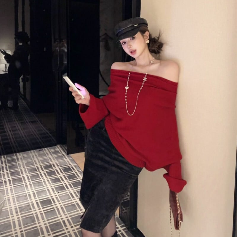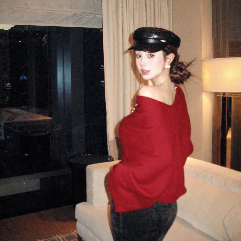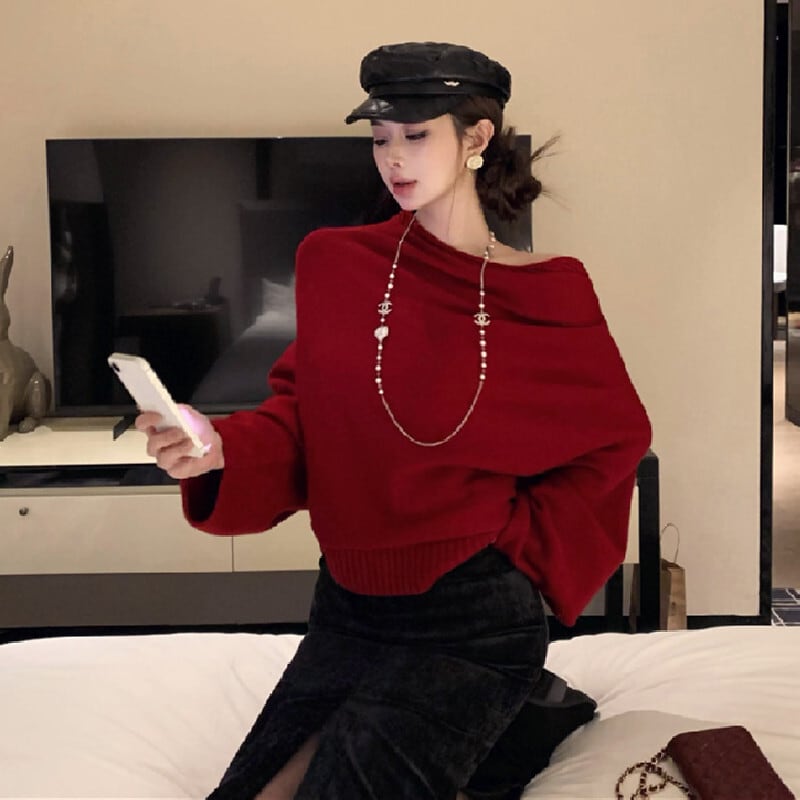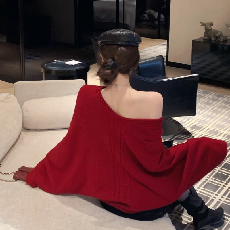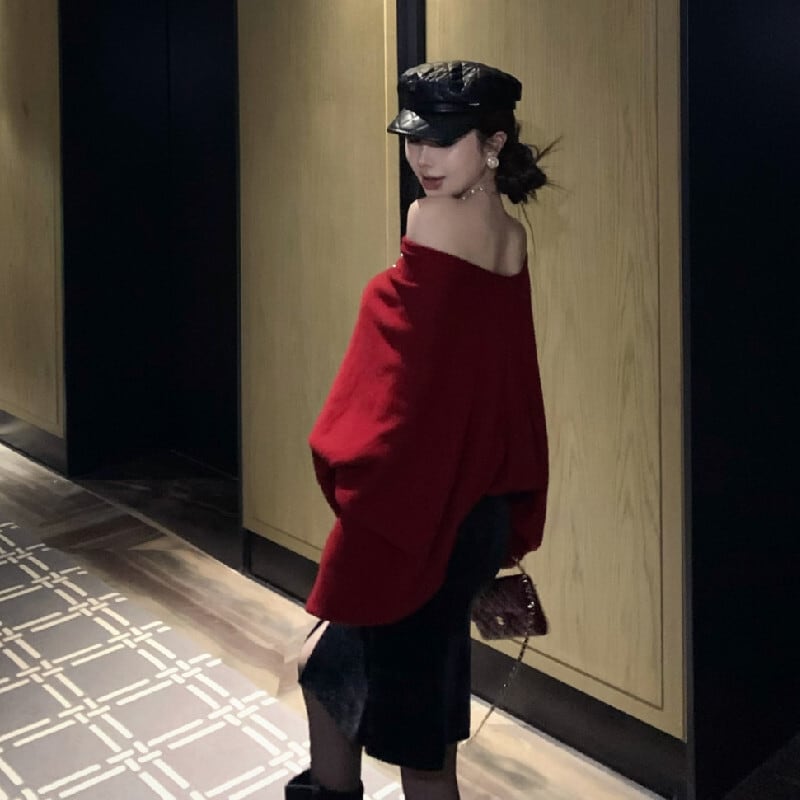 トップス ニットセーター ドルマンスリーブ オフショルダー レッド