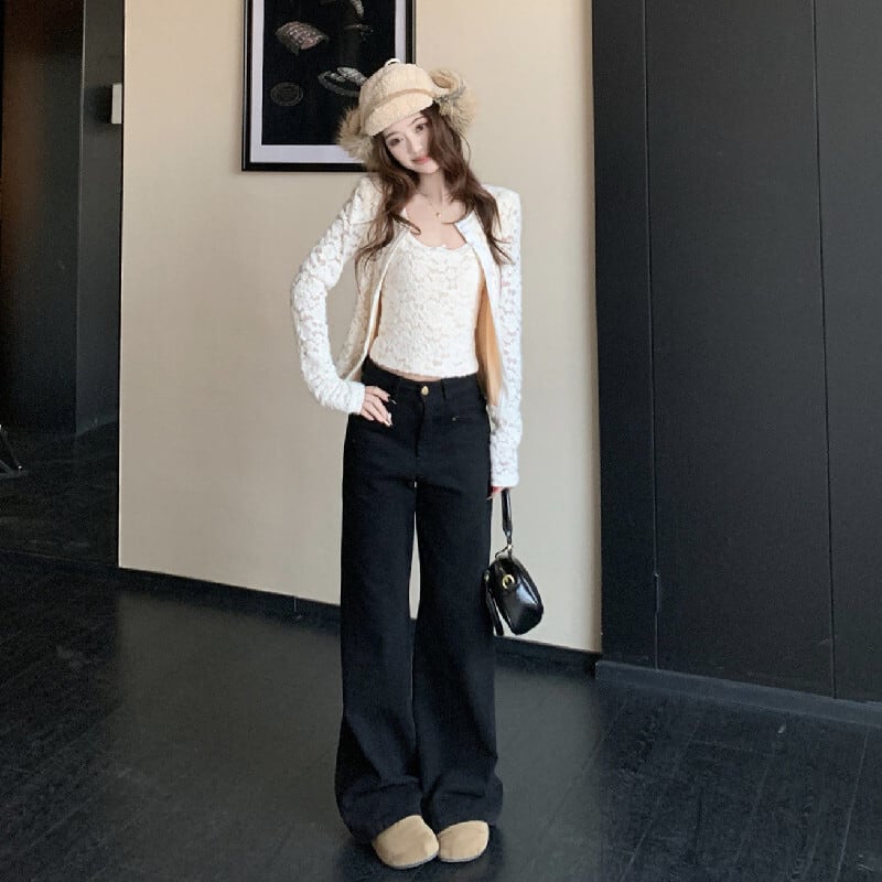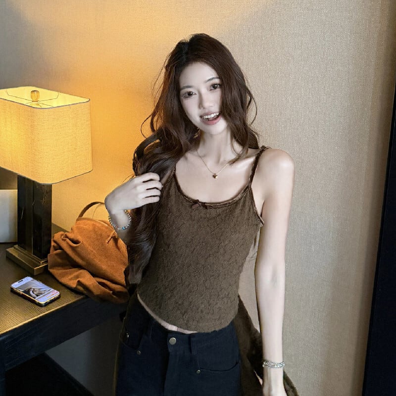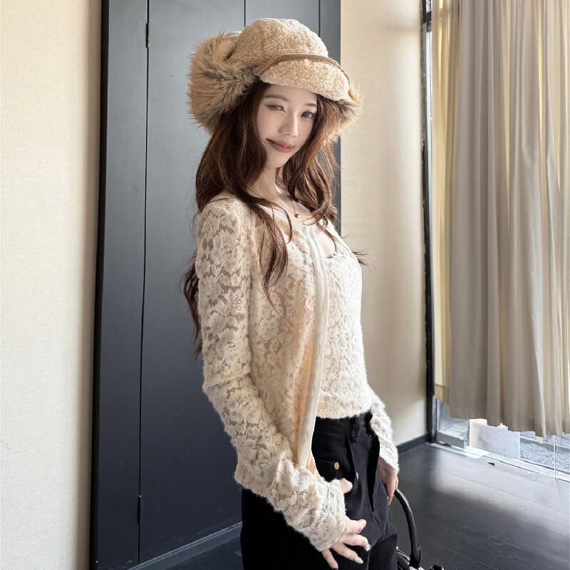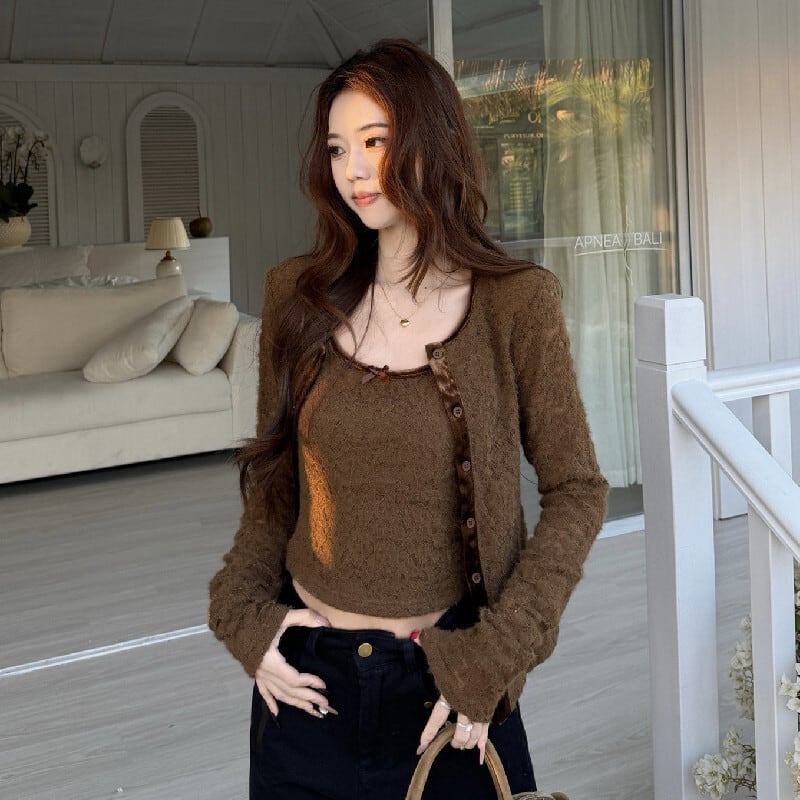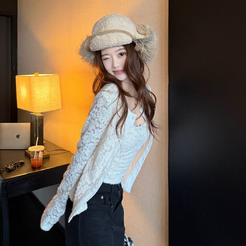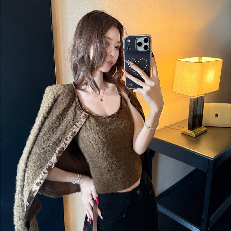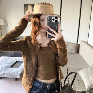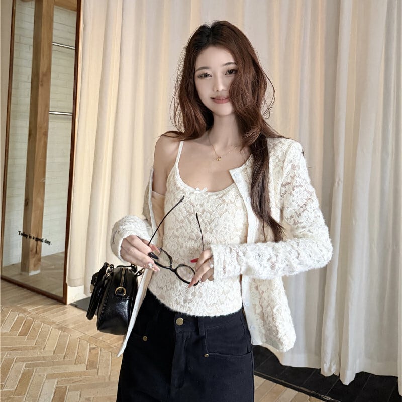 2点セット デザイン性抜群 レース カーディガン+タンクトップ ベージュ ブラウン