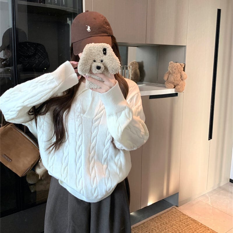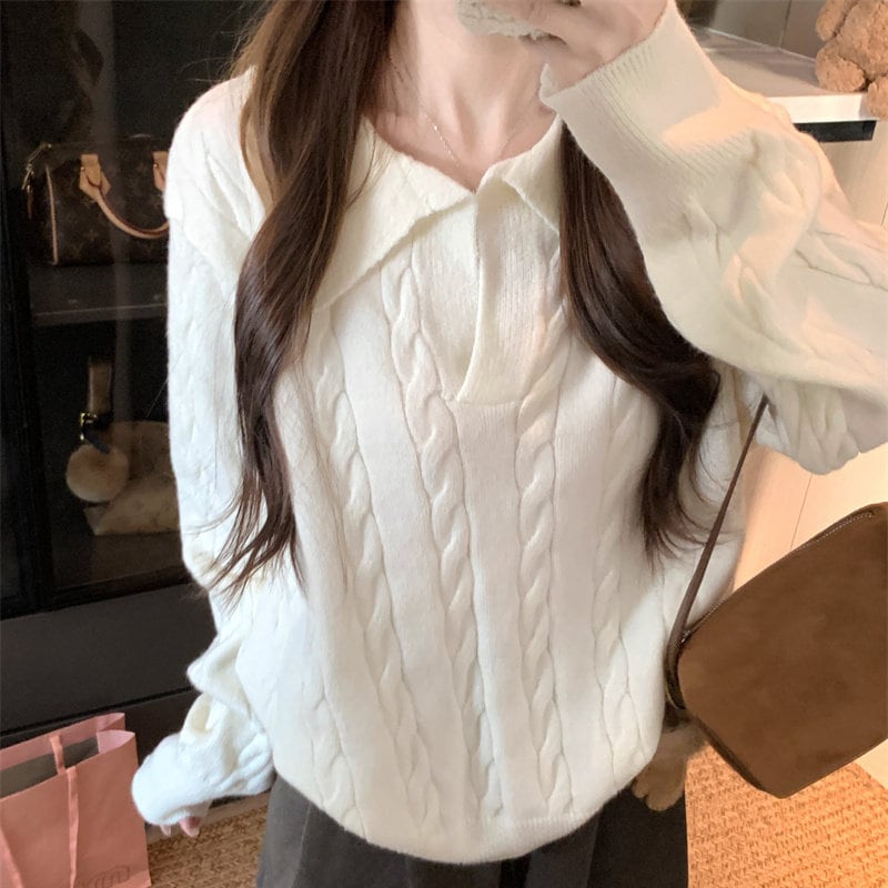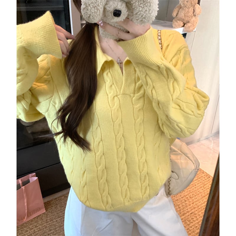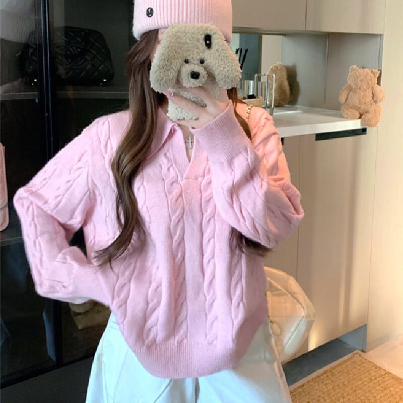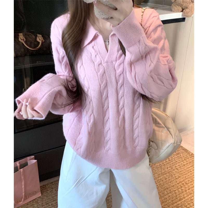 3colorsトップス セーター POLOネック ゆったり ケーブルニット ピンク ベージュ イエロー