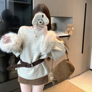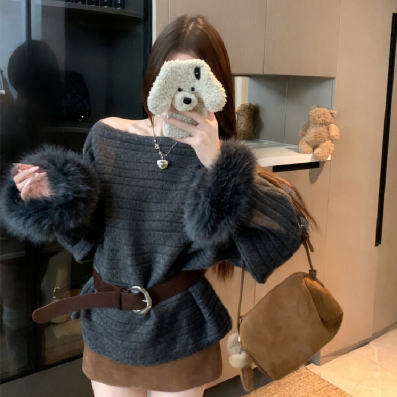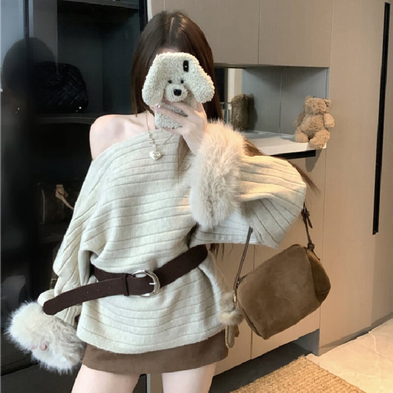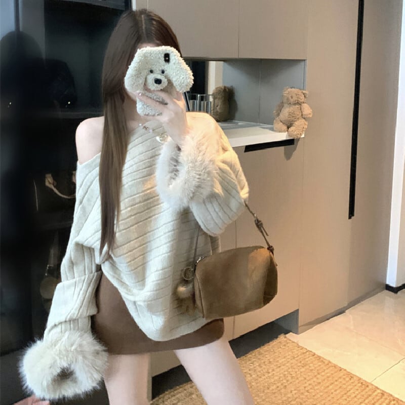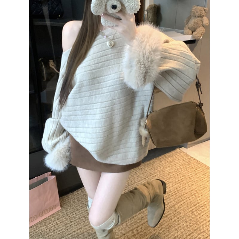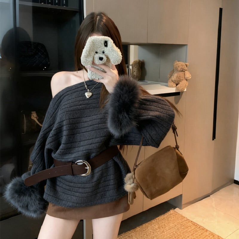 2colorsトップス ニットセーター オフショルダーダークグレー ライトブラウン