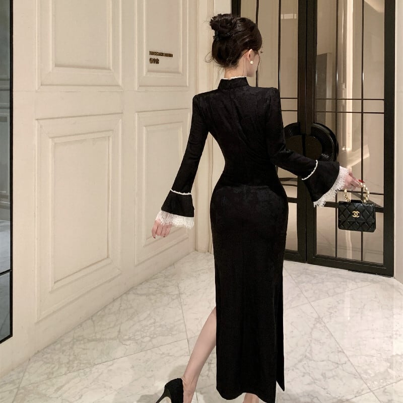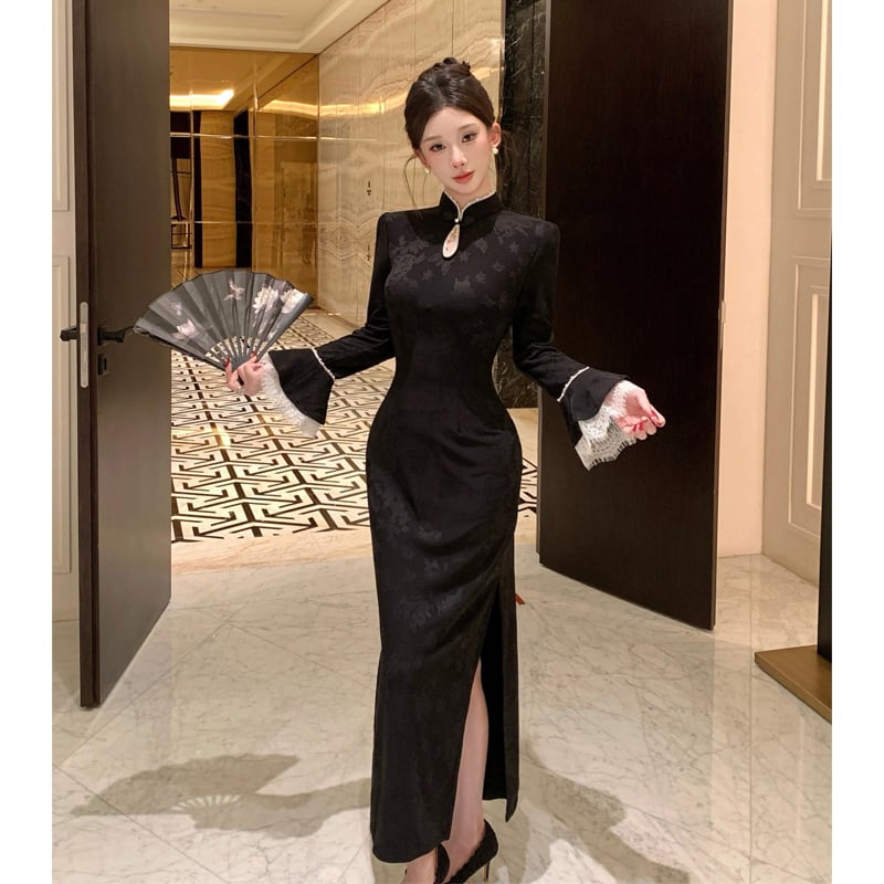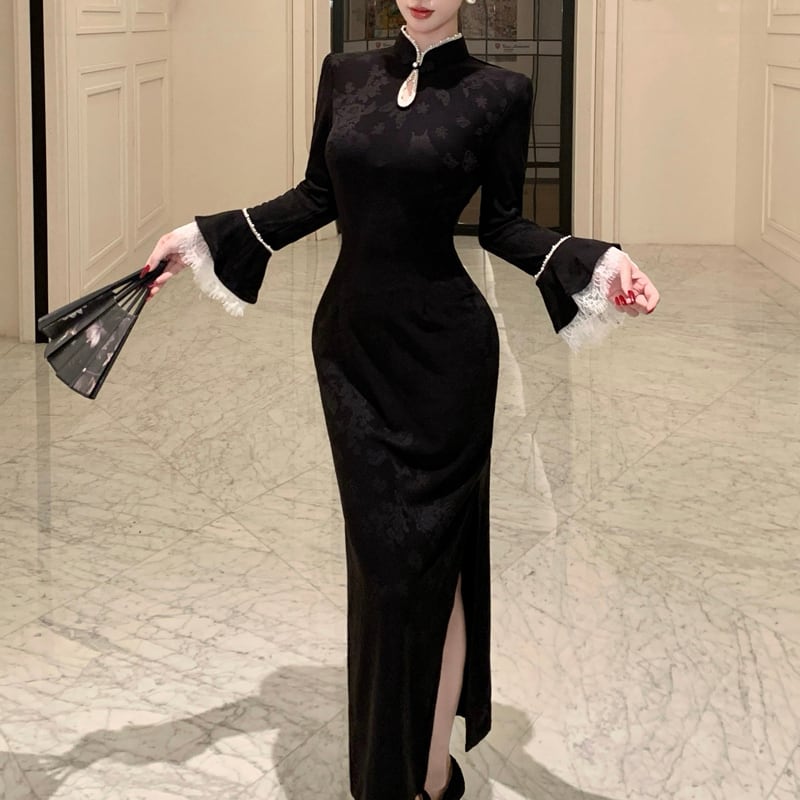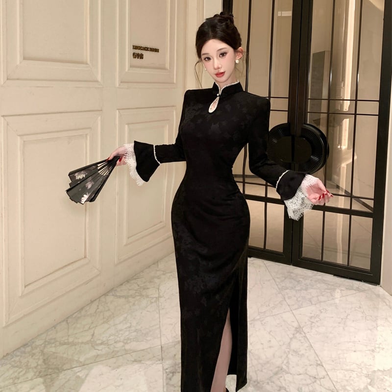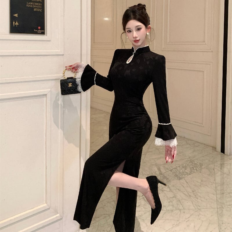 ワンピース チャイナ風 レース スピーカースリーブ スリット ブラック S M L