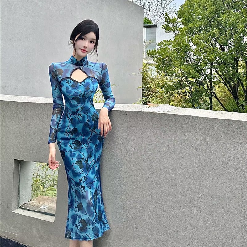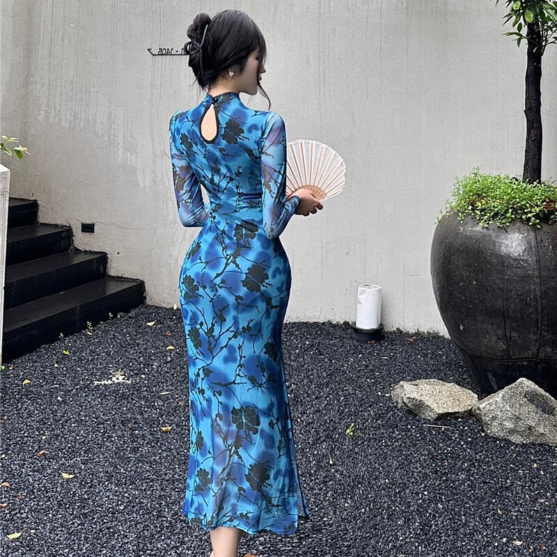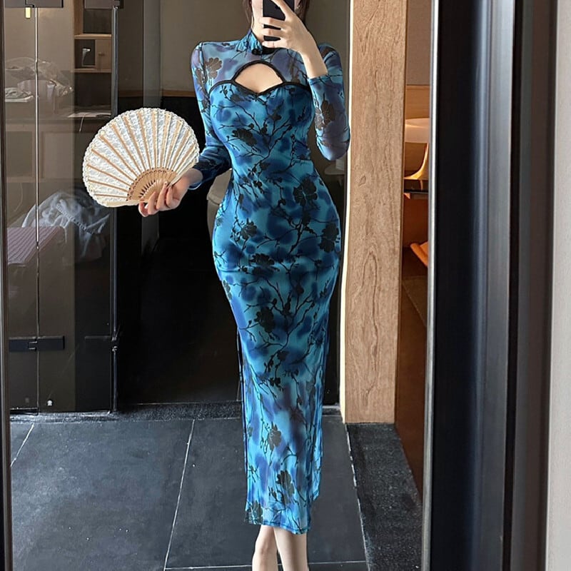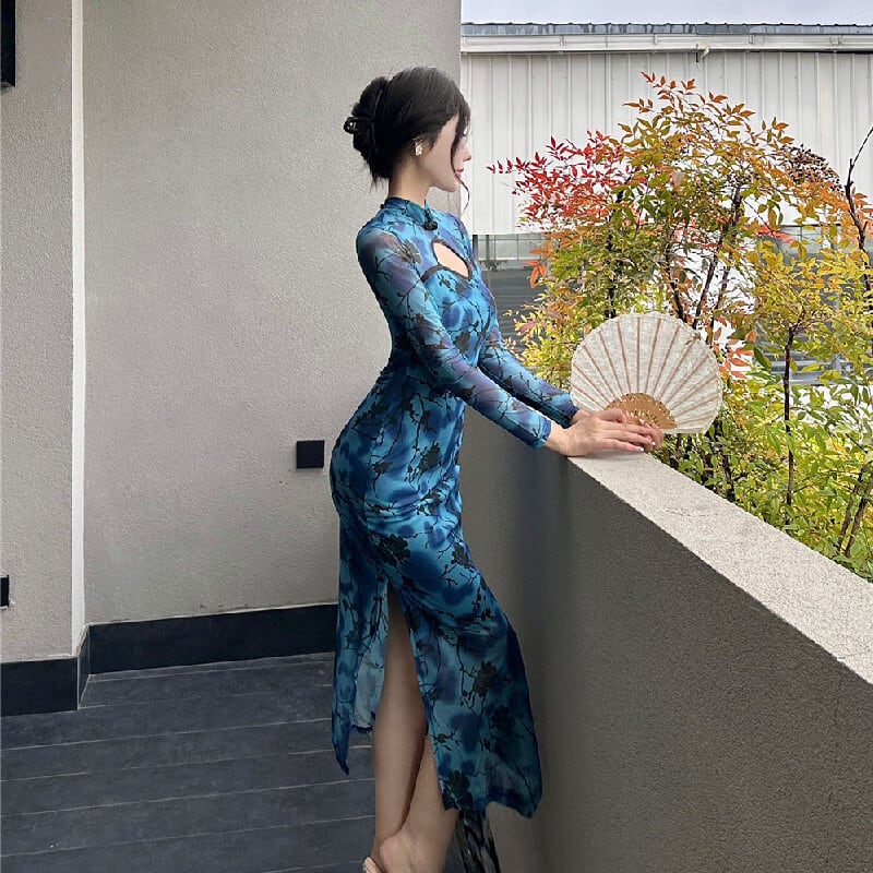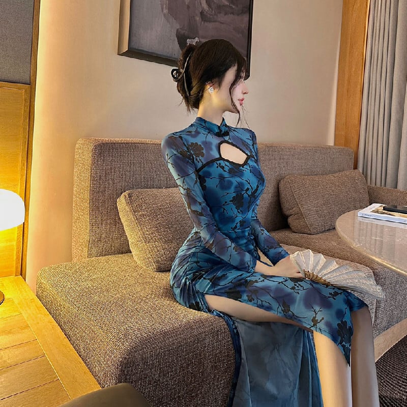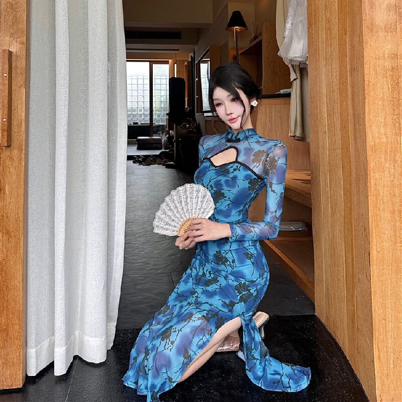 ワンピース チャイナ風 花柄 メッシュ シルエット スリット ブルー S M L
