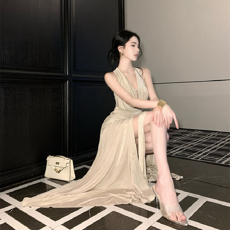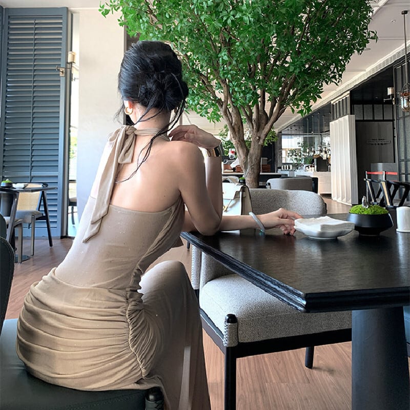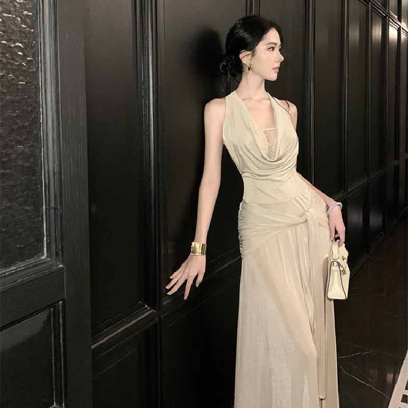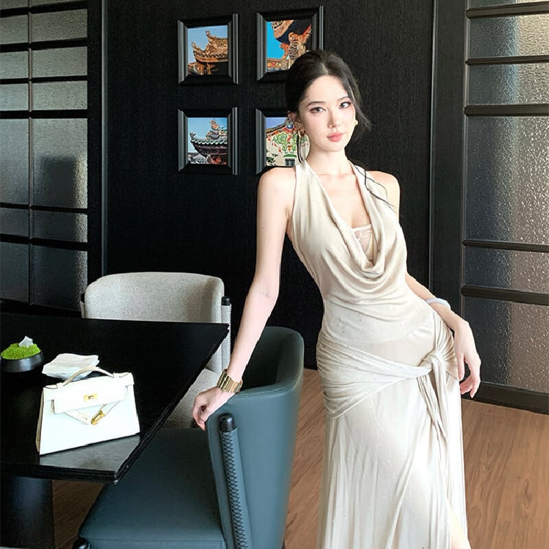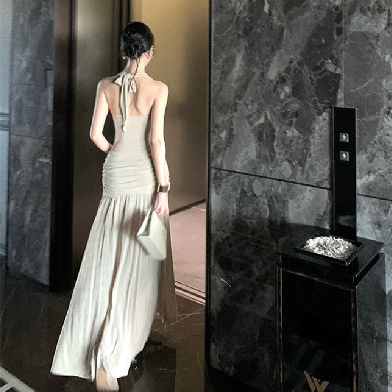 ホルターネック クロッシェ バックレス ストーン ロングドレス S M L