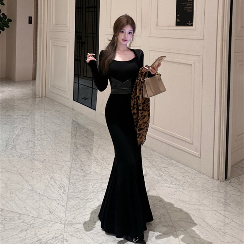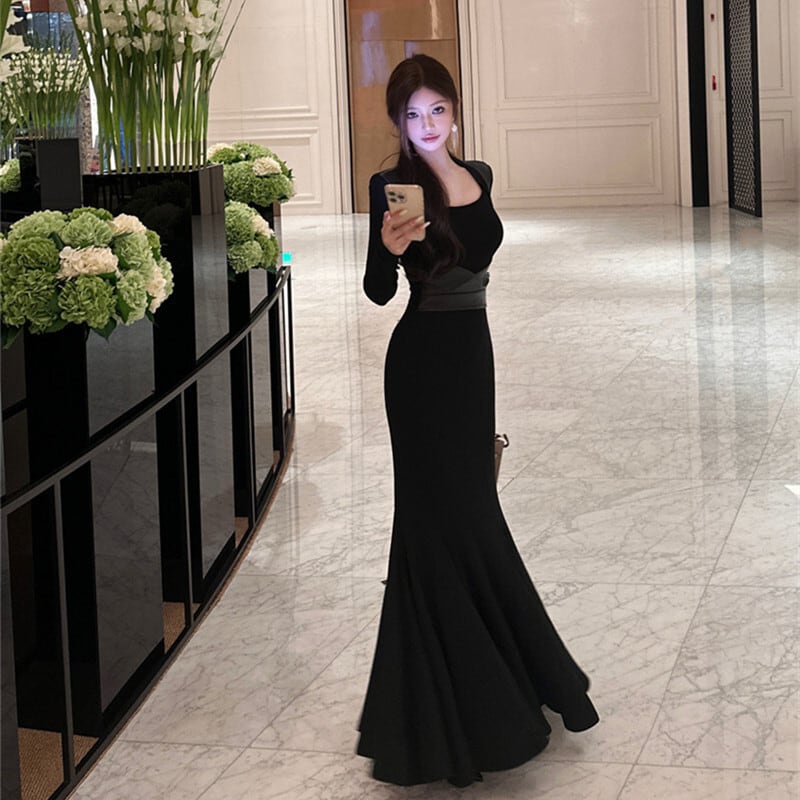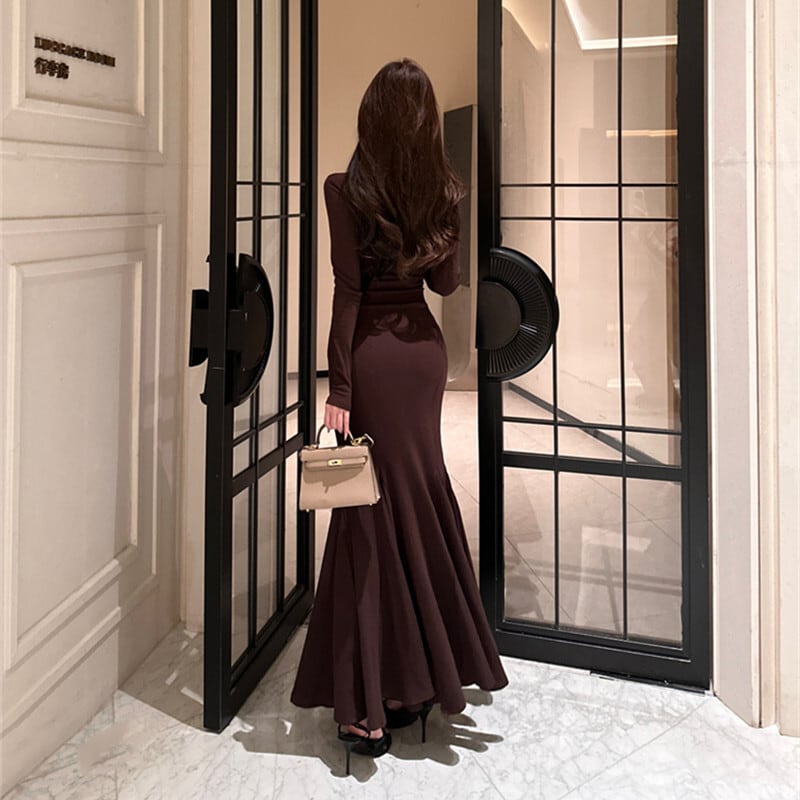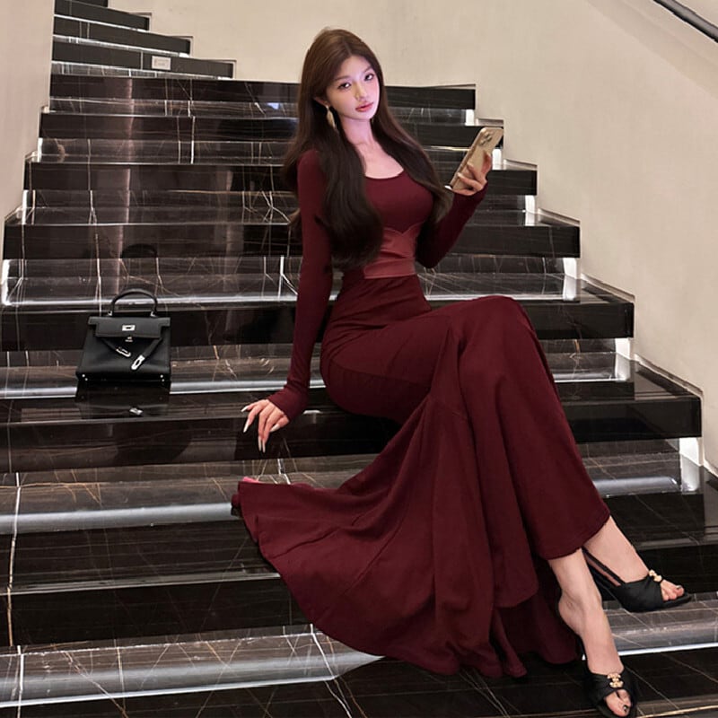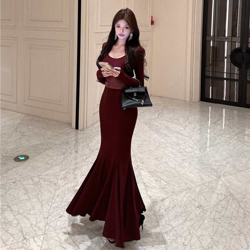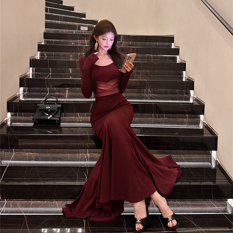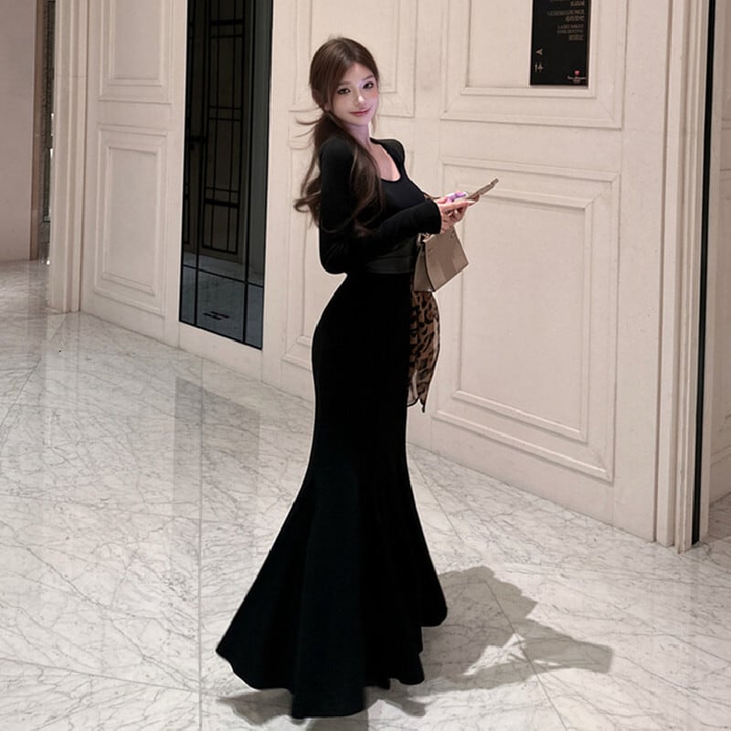 3colors 大人コーデ 長袖 フィッシュテール シルエット ロングドレス