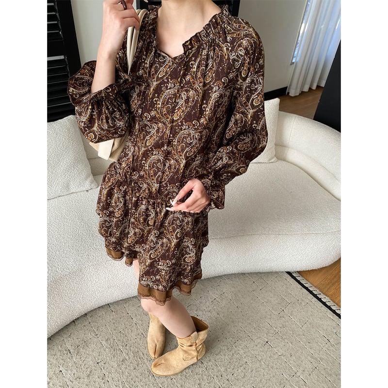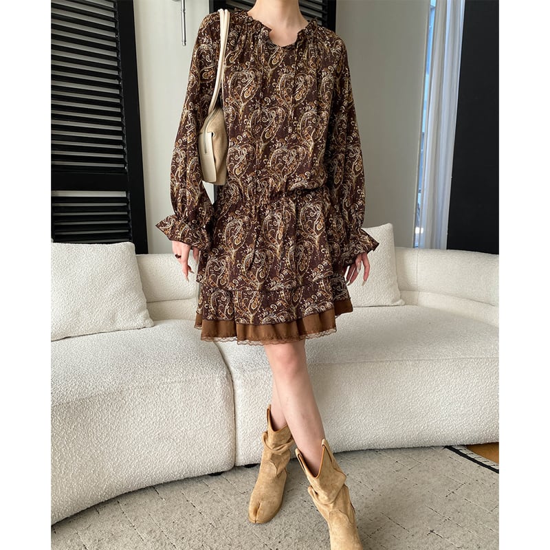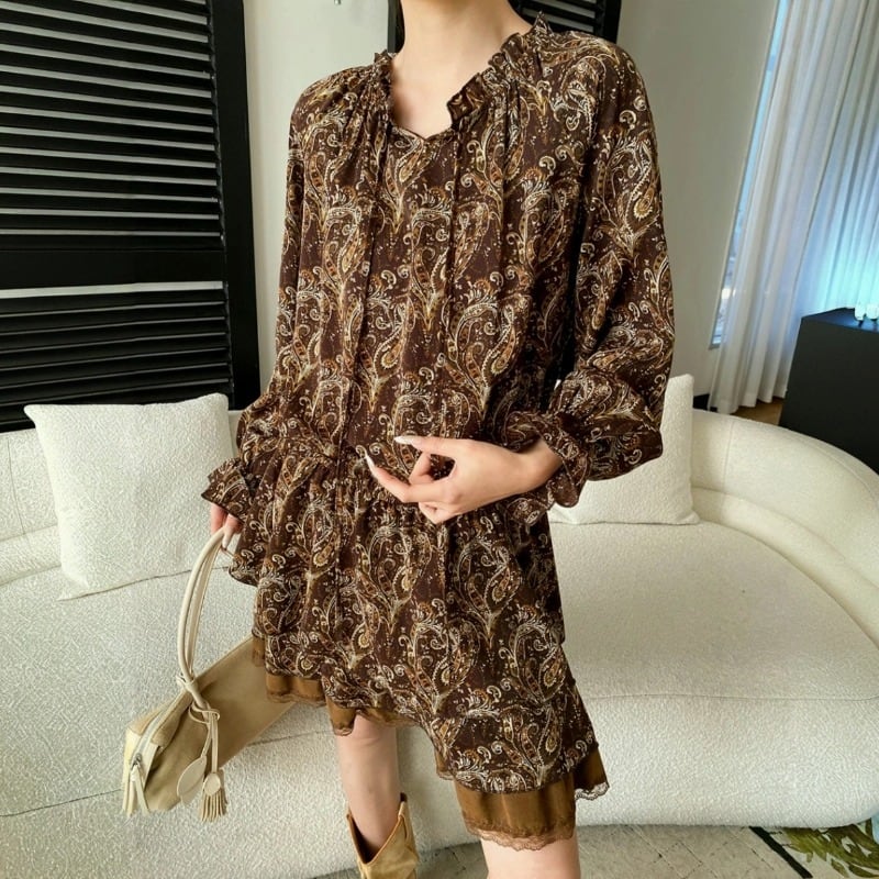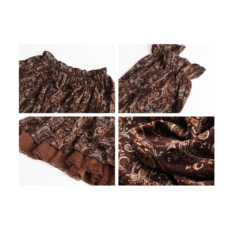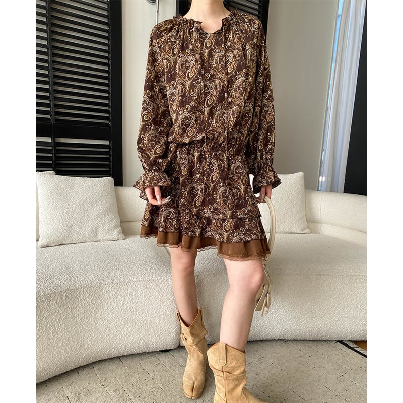 ワンピース プリント ボヘミアン ペプラム エキゾチック コーヒー色 S M L